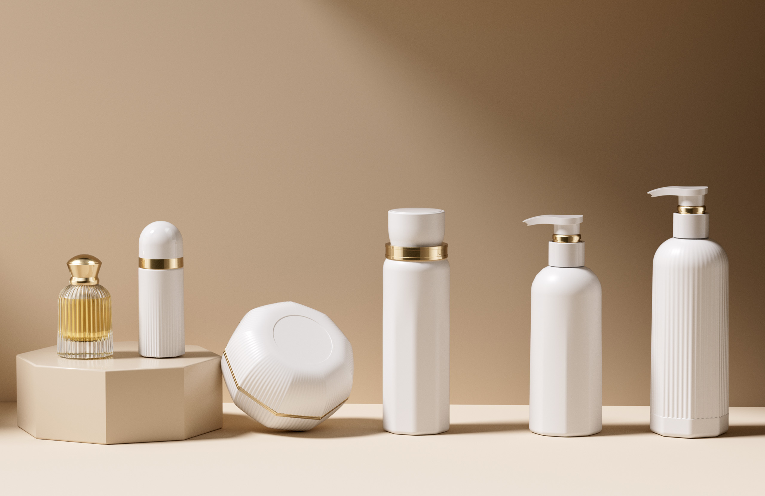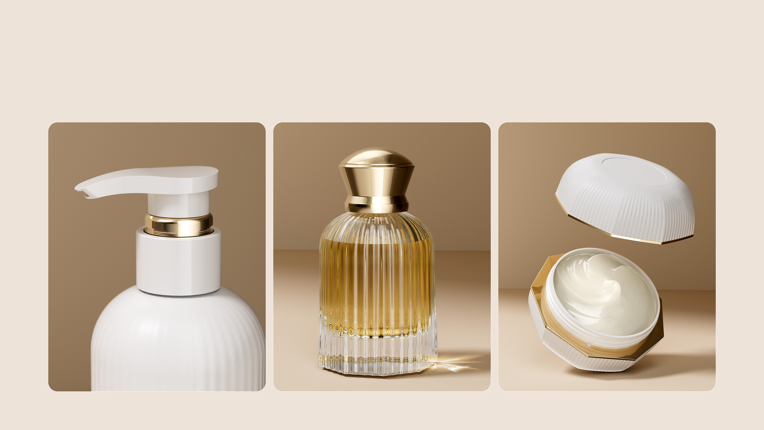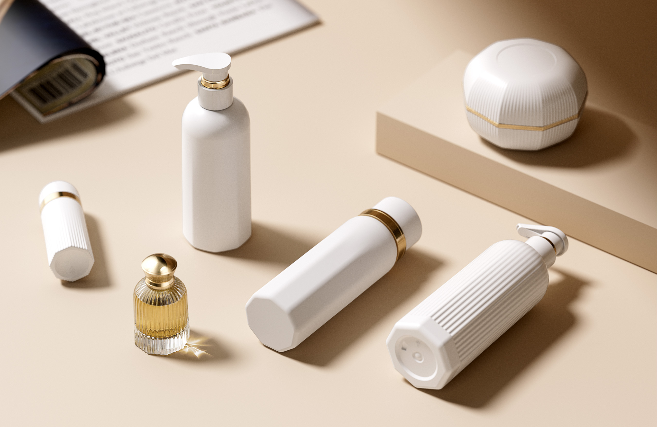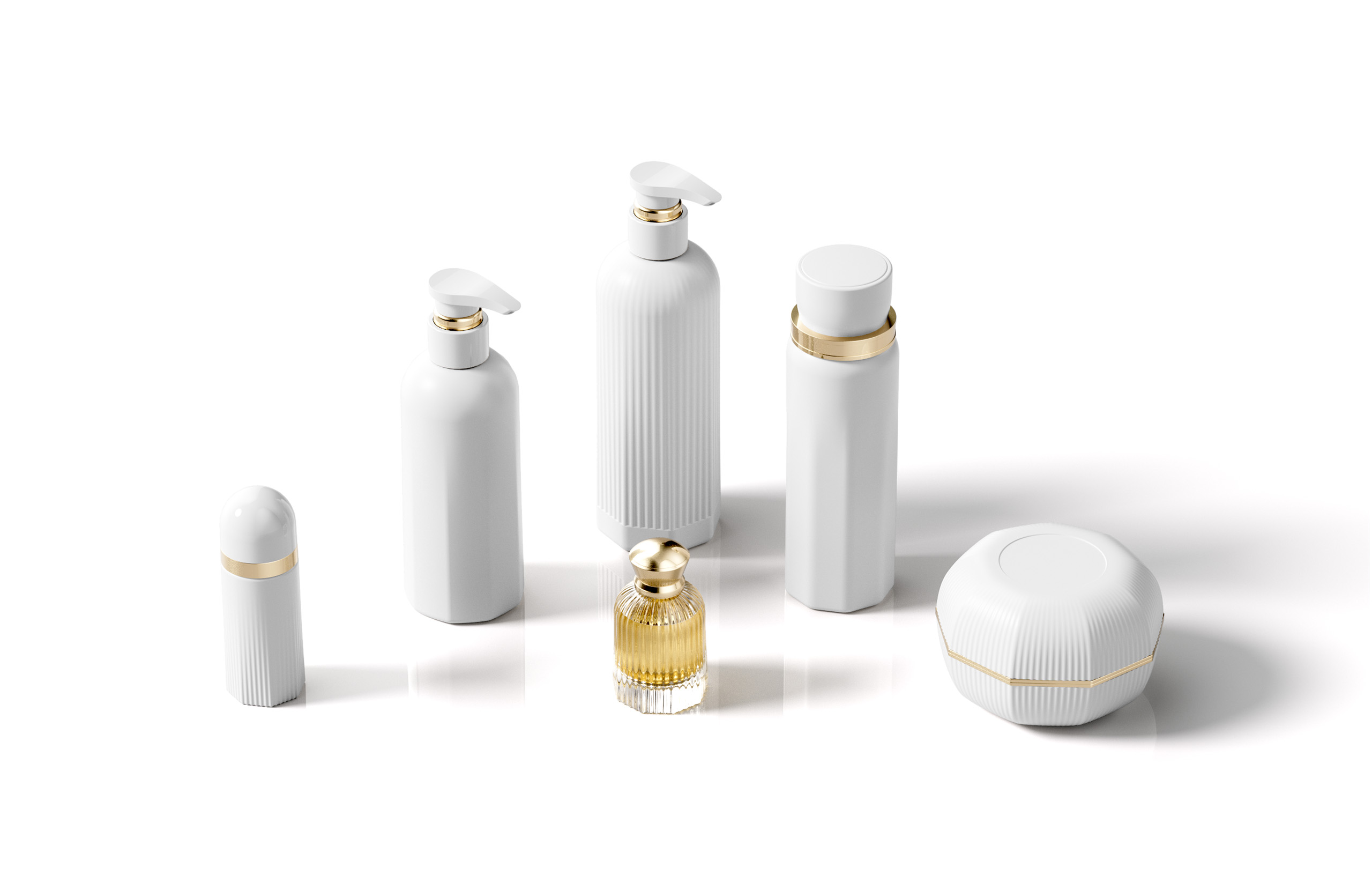 The packaging design upholds the philosophy of “radiance × balance × minimalism,” expressed through carefully chosen materials and refined details. The bottles are primarily white or transparent with gold accents, creating a minimal and refined look. Vertical textures echo the brand’s symbolism, enhancing consistency and recognizability. The outer packaging uses textured paper with gold foil stamping, delivering a delicate touch and rich visual layering. Available in different sizes and shapes, the packaging is designed to suit both home use and portability, striking a balance between aesthetics and practicality.