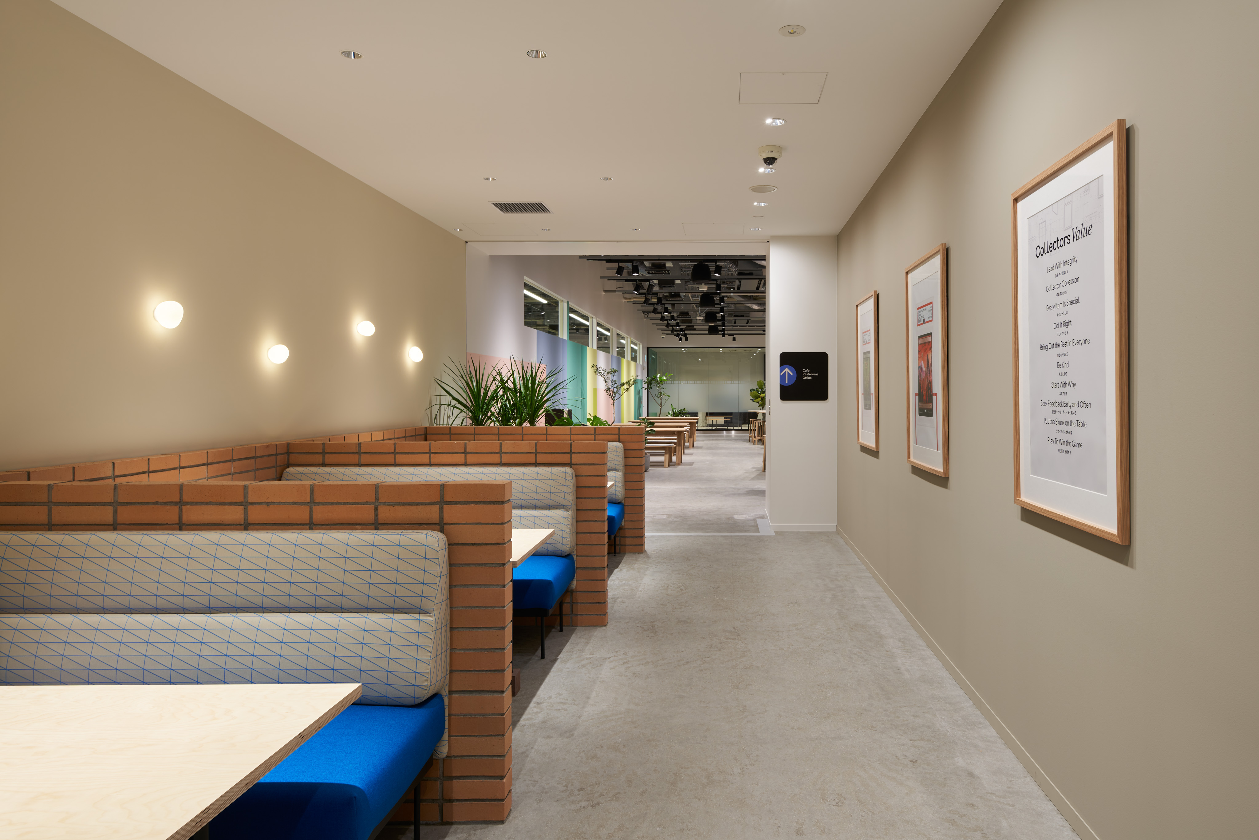 At the reception counter, we expressed the 'Layer' concept by incorporating approximately 6,000 unused protective cases for trading cards provided by the company, combined with lighting. This transforms the counter into an iconic feature that symbolizes the very business of handling trading cards.