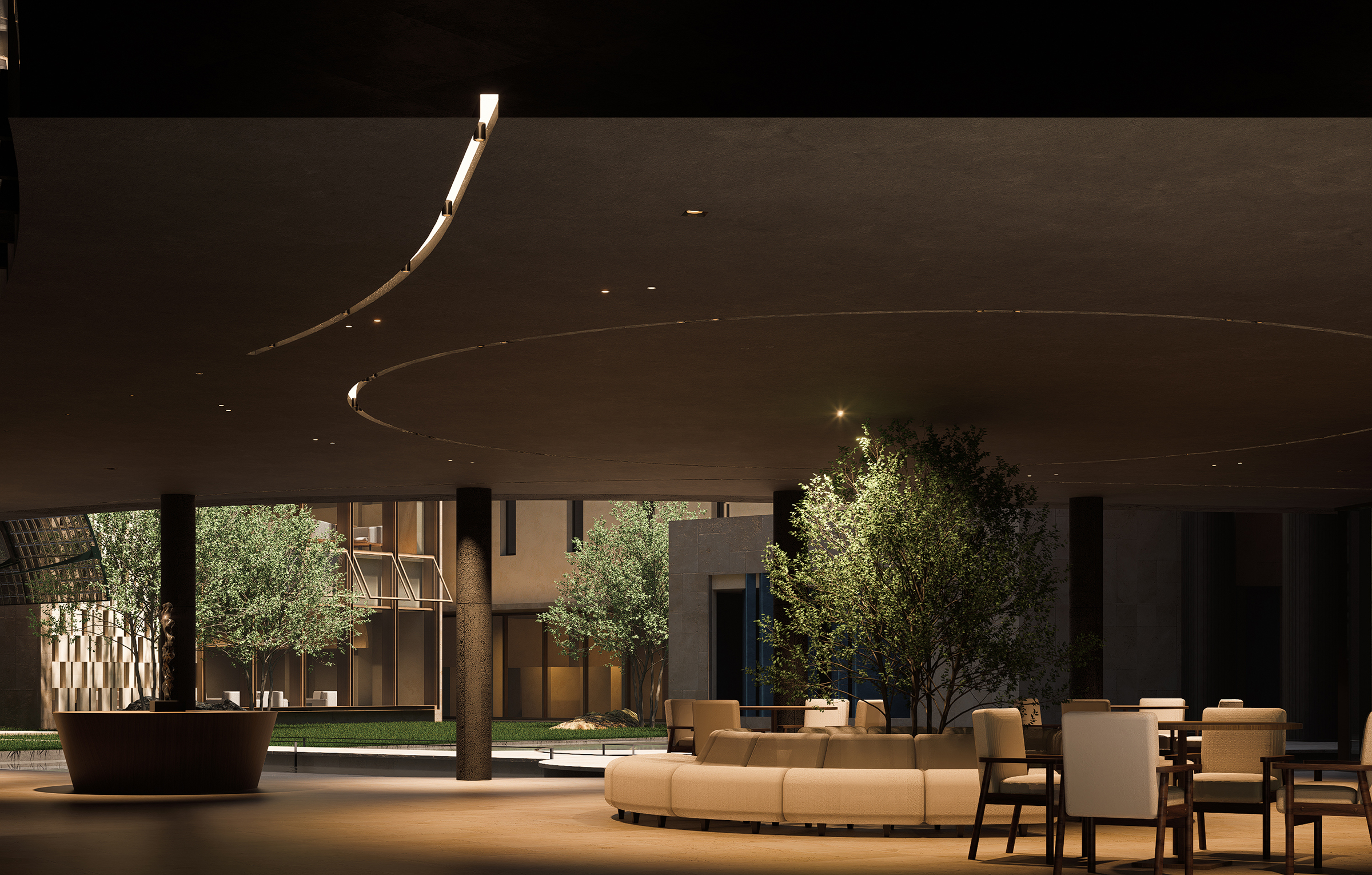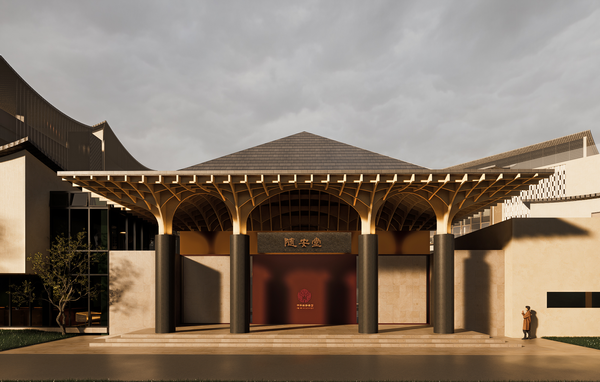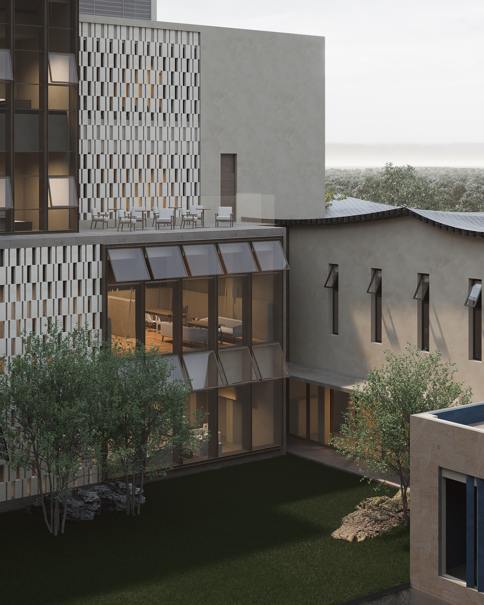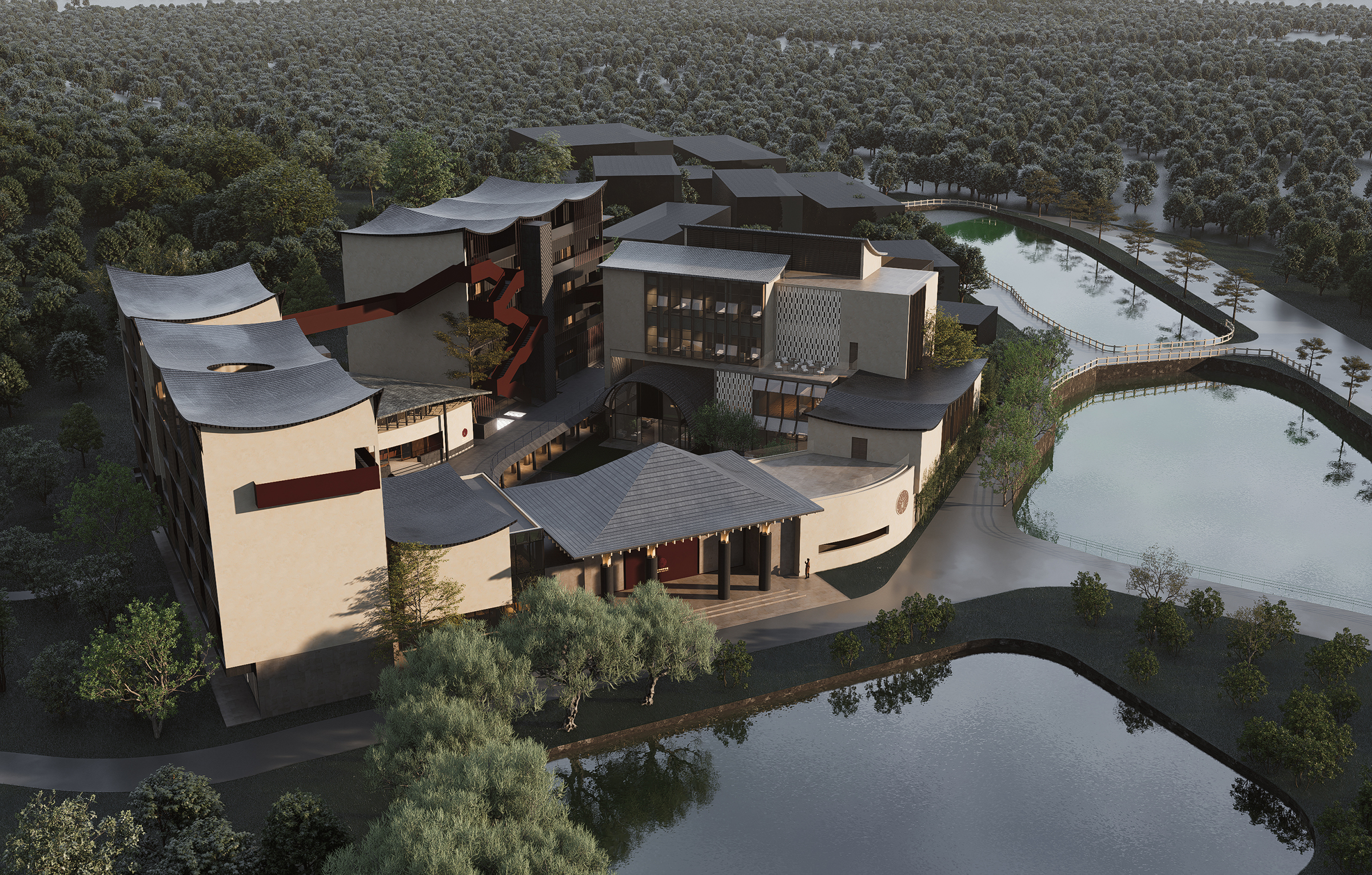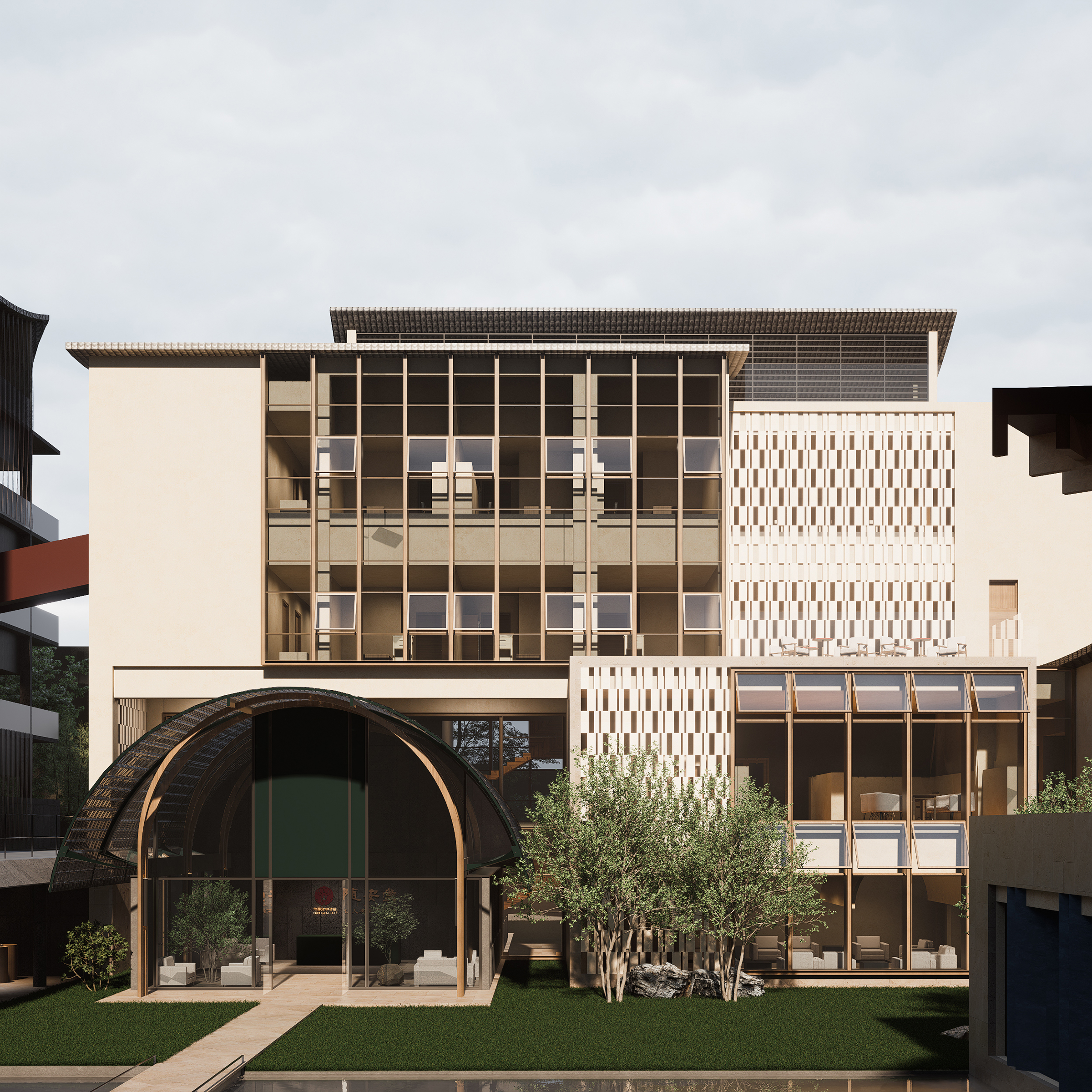 The entrance combines the curves of traditional eaves with modern geometric lines. The horizontal inscribed board and carved walls emphasize historical depth and cultural continuity. The scattered yet orderly spatial layout balances openness and privacy, offering both communal areas and quiet resting spaces. Courtyards with pools, greenery, and arbors form tranquil layered landscapes. Interiors, shaped by dark tones, stone, wood, and glass, create a calm artistic atmosphere enhanced by warm lighting.