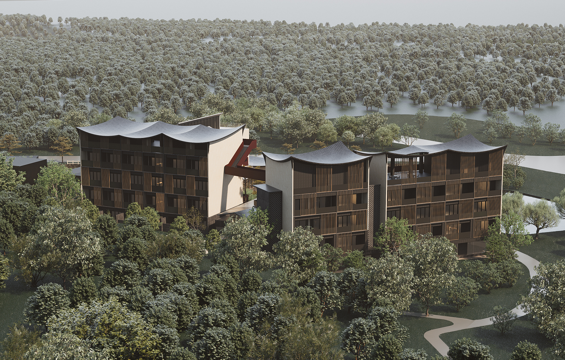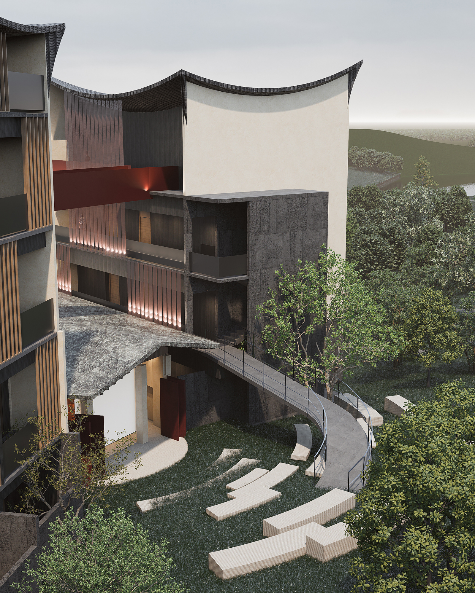 The design fully respects the natural environment. Wavy roofs, curved eaves, and vertical grilles echo mountains, rivers, and trees, while large glass windows and terraces draw outdoor scenery into the interior, enabling dialogue between humans and nature. Minimalist modern architecture is enriched with wooden grilles and traditional carvings, balancing simplicity with cultural warmth.