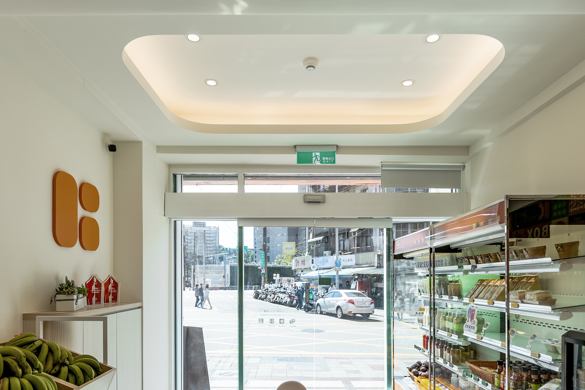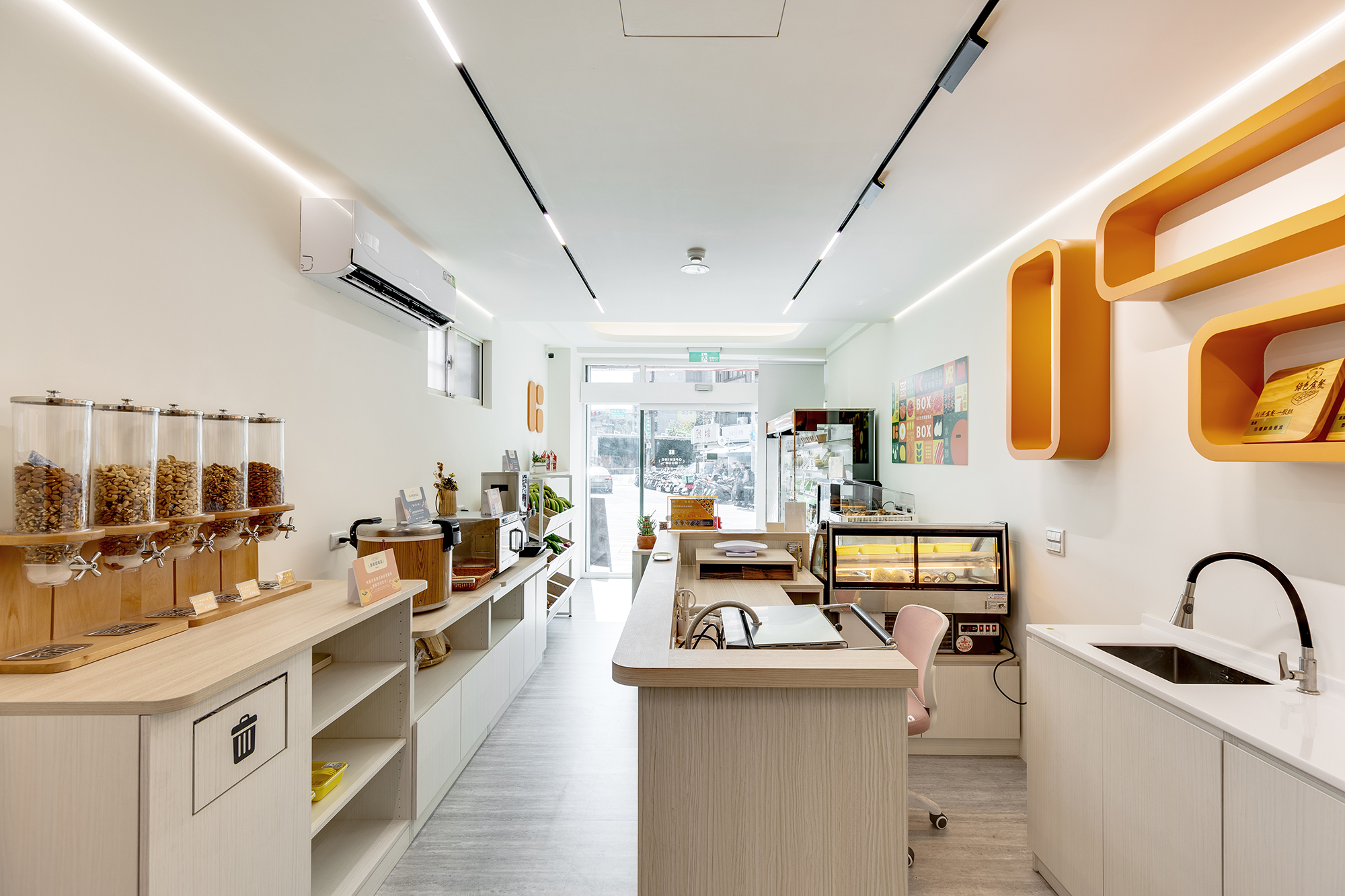 As customers enter, they will be greeted by the front display area, which features meticulously arranged refrigerated shelves, vibrant produce displays, and convenient checkout counters. The clean, bright white walls, paired with light-colored wooden cabinetry, create an inviting and fresh atmosphere. To further capture attention, vivid orange brand-box display units are strategically mounted on the walls, serving as striking visual focal points that embody the brand's energy. Transitioning to the rear dining area, guests will find themselves in a warm and inviting space filled with natural wood tables and chairs that invite relaxation. This area is adorned with wall-mounted imagery of fresh produce, which adds a touch of vibrancy and freshness to the dining experience. The lively shapes and rich colors are complemented by box-shaped mirrored sliding doors and linear light strips that amplify the elongated layout of the space.