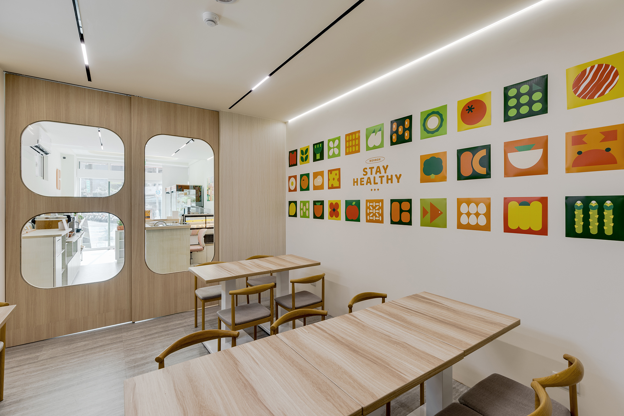 Furthermore, the design incorporates the brand's signature orange logo and features warm, wood-textured cabinetry, which complement a dynamic wall inspired by fresh produce. Together, these elements work harmoniously to cultivate a cheerful and welcoming atmosphere. This approach not only extends the brand's bright and healthy visual identity but also creates a space where customers feel comfortable and inspired. Ultimately, this design reflects the principles of precision in nutrition and environmental sustainability. By thoughtfully considering spatial details, we effectively embody the brand's meal box imagery, resulting in a dynamic and engaging environment that resonates with the core values of BoxBox.