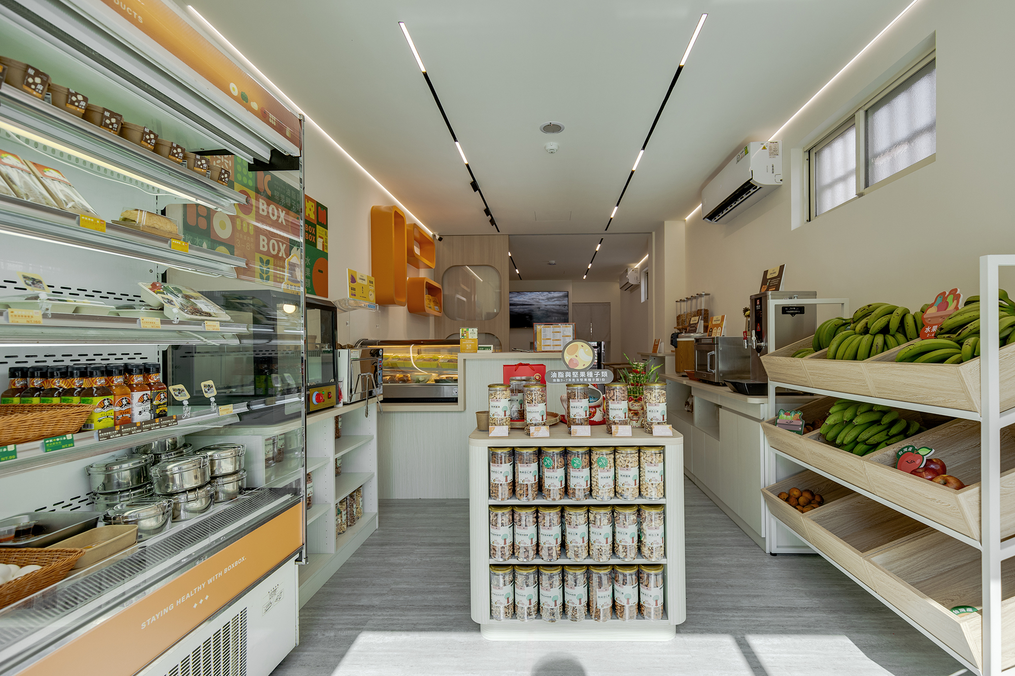 This project centers around the innovative design of the retail space for the health-conscious meal brand “BoxBox.” Our objective is to seamlessly translate the brand's ethos into a physical environment that captivates and engages customers, utilizing geometric shapes and vibrant color schemes to evoke a sense of vitality. At the heart of the design, we draw inspiration from the concept of meal boxes, which informs every element of the space. Display racks, lighting fixtures, and partitions are thoughtfully layered and interwoven, creating an immersive environment that mirrors an oversized “BoxBox.” This deliberate arrangement encourages exploration and interaction, inviting customers to delve deeper into the brand experience.