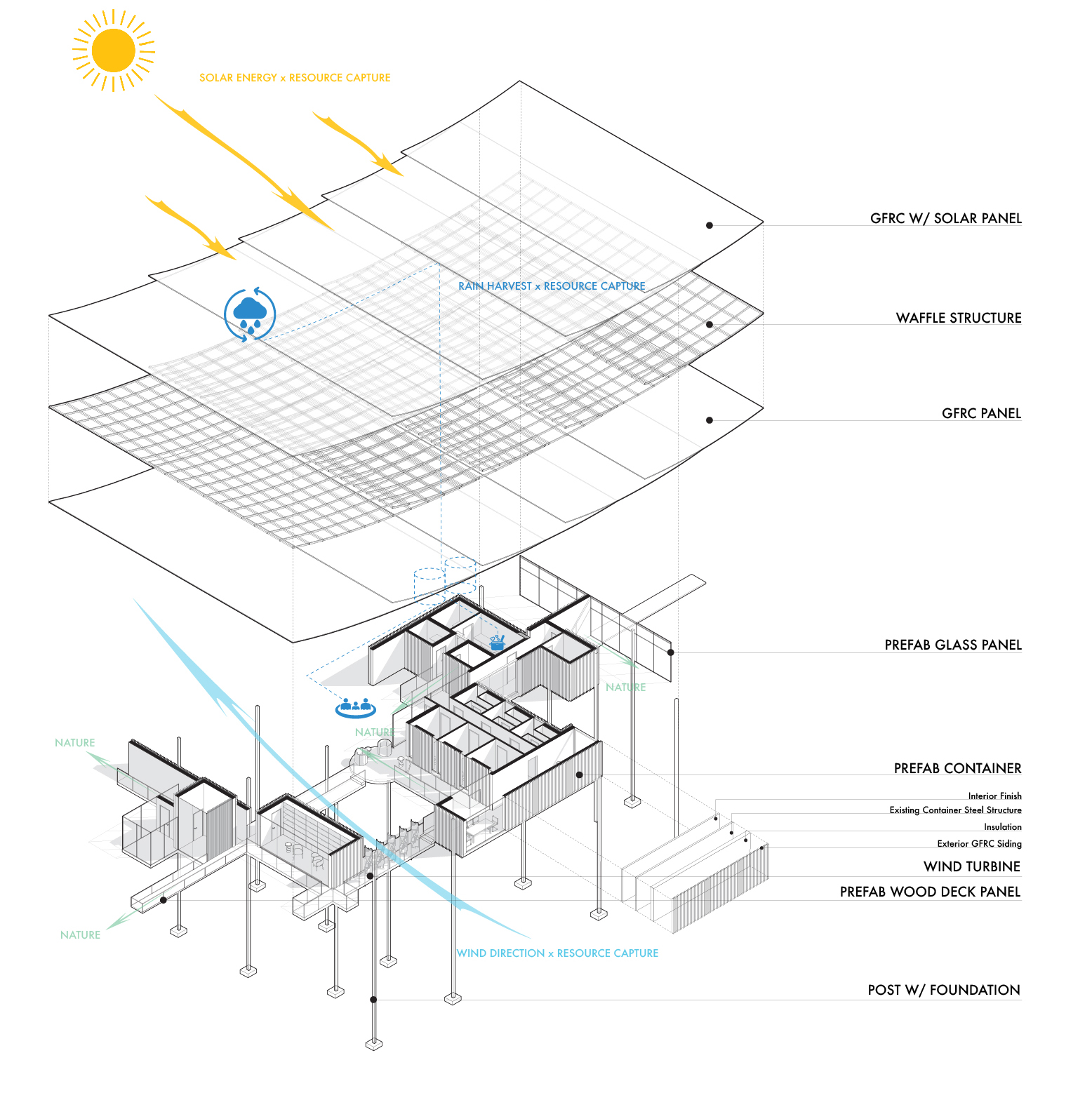 These containers are not placed in isolation but supported within a lightweight column grid. The roof, made of GFRC panels, joins the grid to form an assemblable and detachable shelter. Light in weight yet structurally precise, it resists heavy wind and rain while allowing light and air to flow freely.