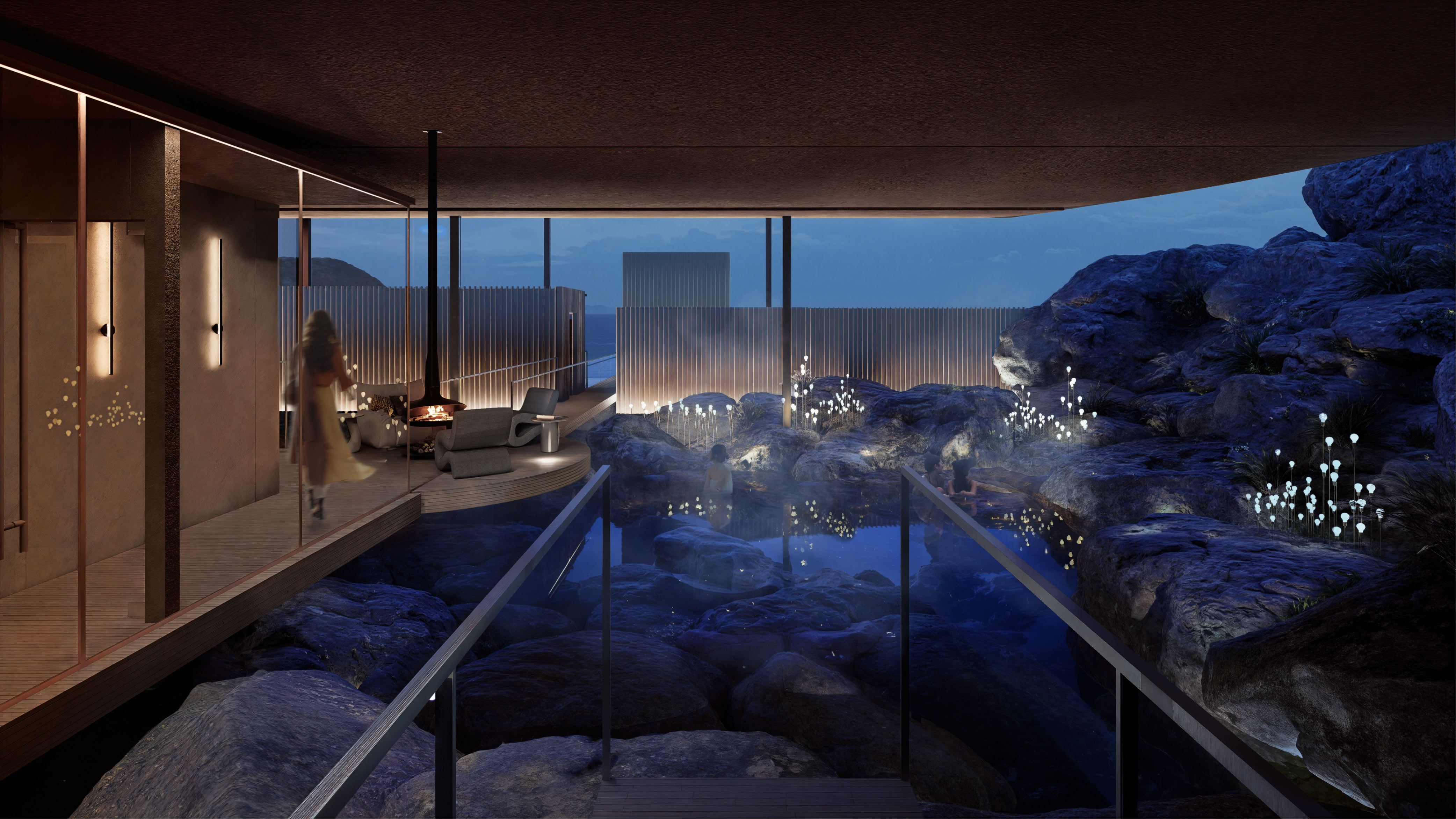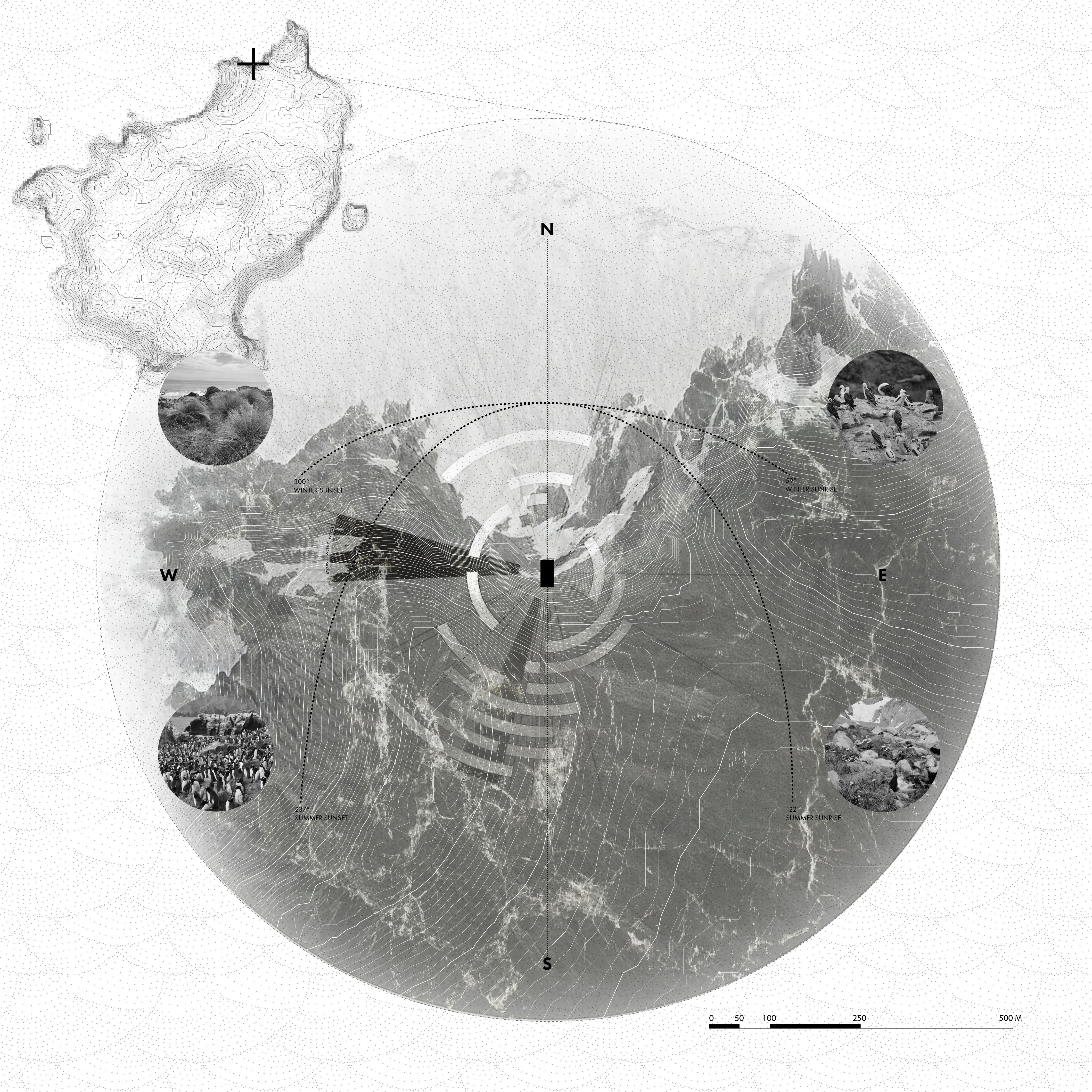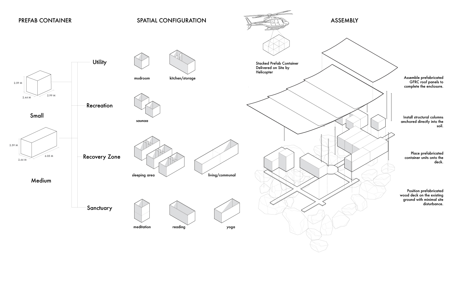 To respond to remote terrain, extreme climate, and the principle of minimal intervention, we use thickened shipping containers as the primary wall system—solid, transportable, recyclable, and carrying a kind of “rough aesthetics” born of industrial civilization.