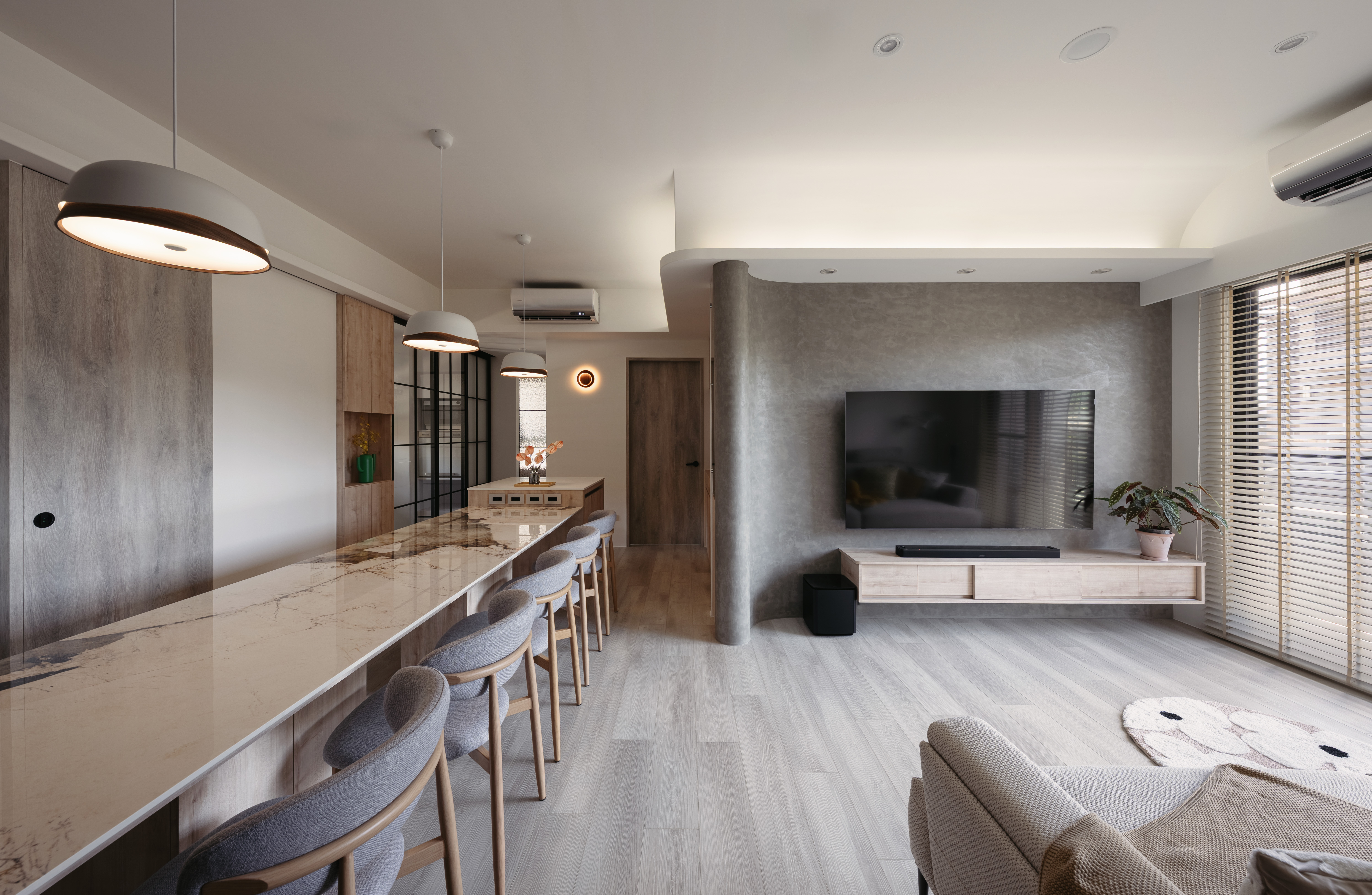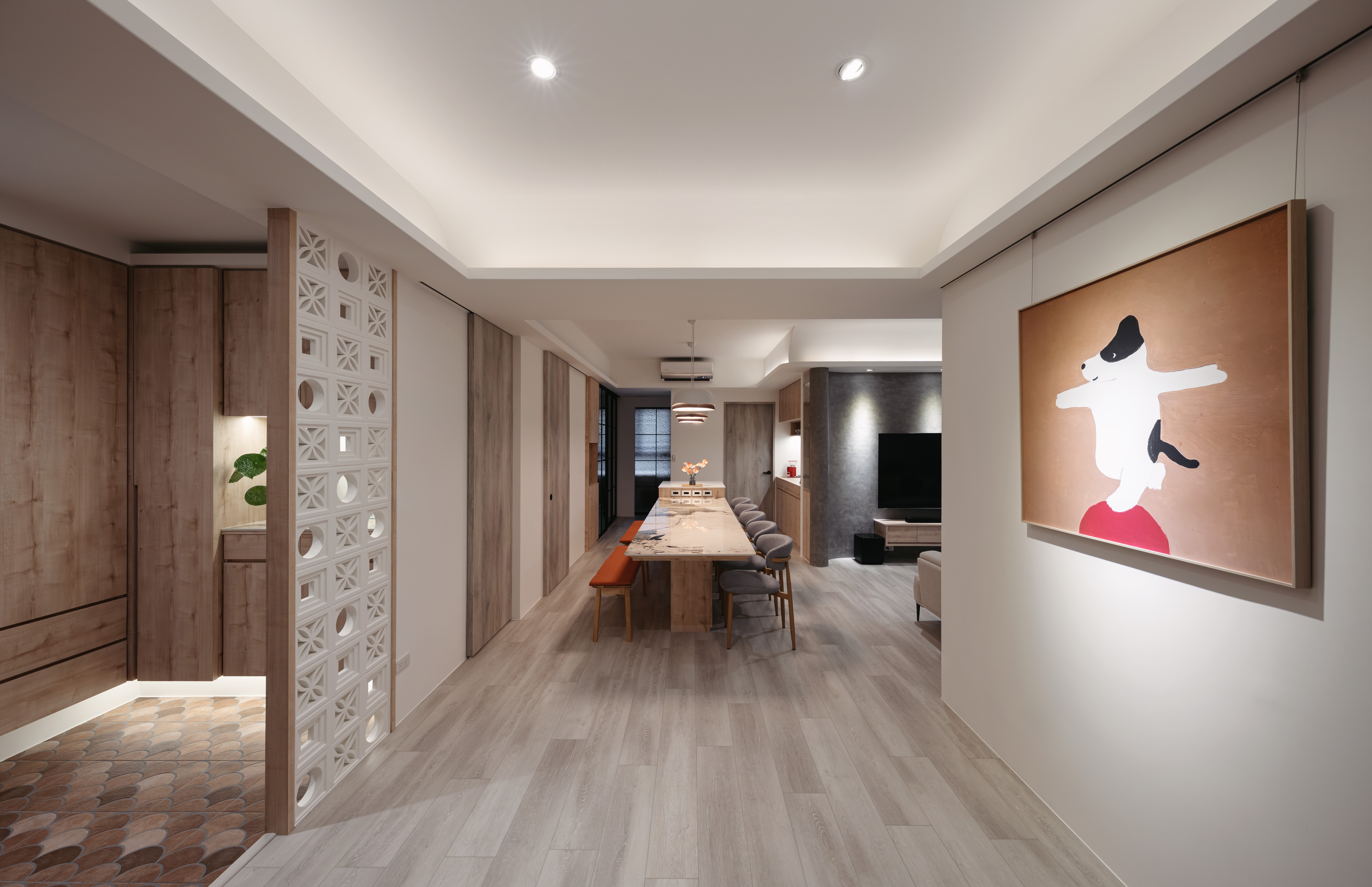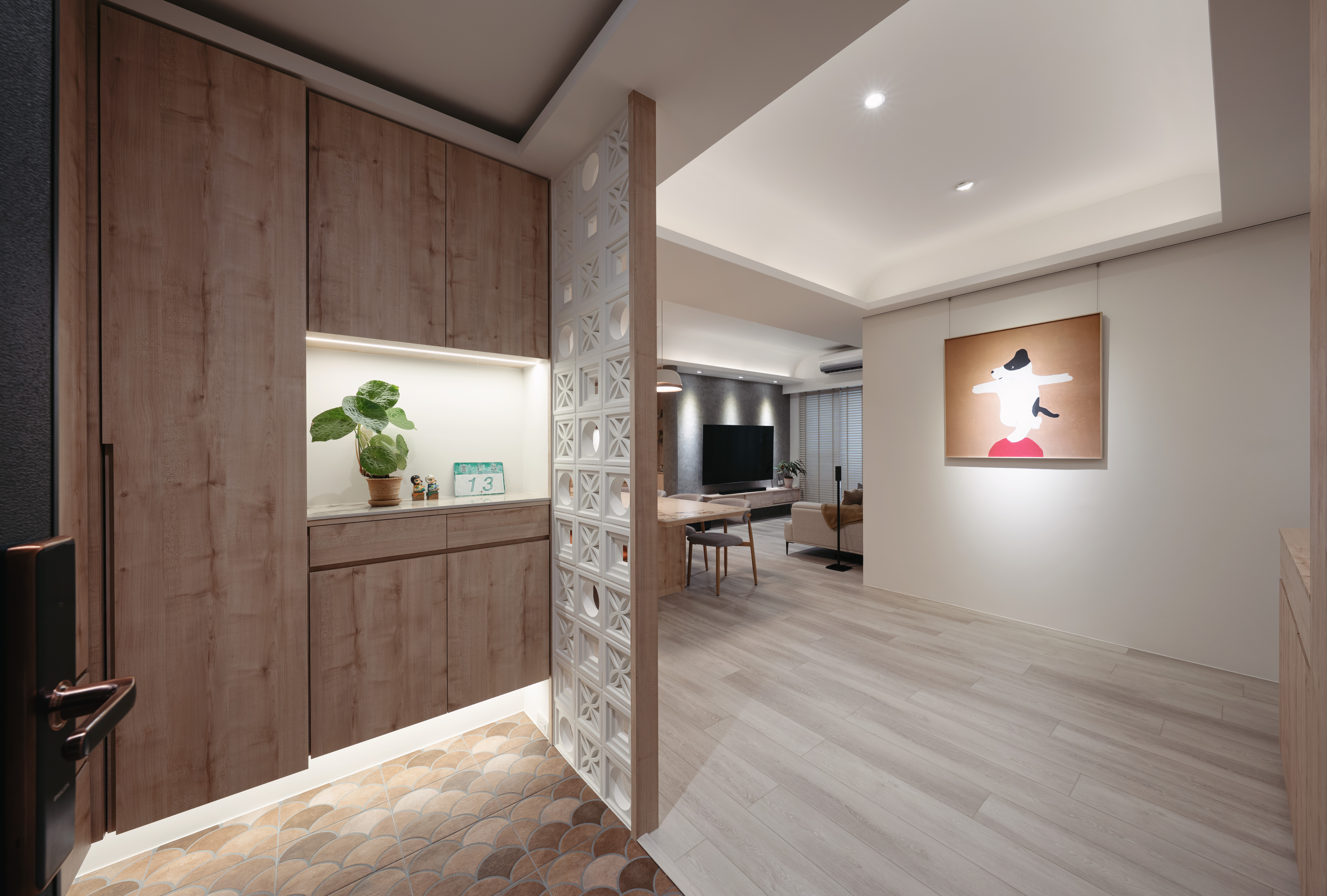 Between Heritage and Horizon reimagines a three-generation residence as a poetic dialogue between memory and renewal. Rooted in the spirit of the family’s ancestral home, the design extends a sense of belonging through openness, warmth, softness, and connection. The entrance opens with retro Taiwanese tiles shaped like ocean waves and a hollow brick partition that recalls vernacular craftsmanship. Together, they form a gentle transition between the outside world and a tranquil interior.