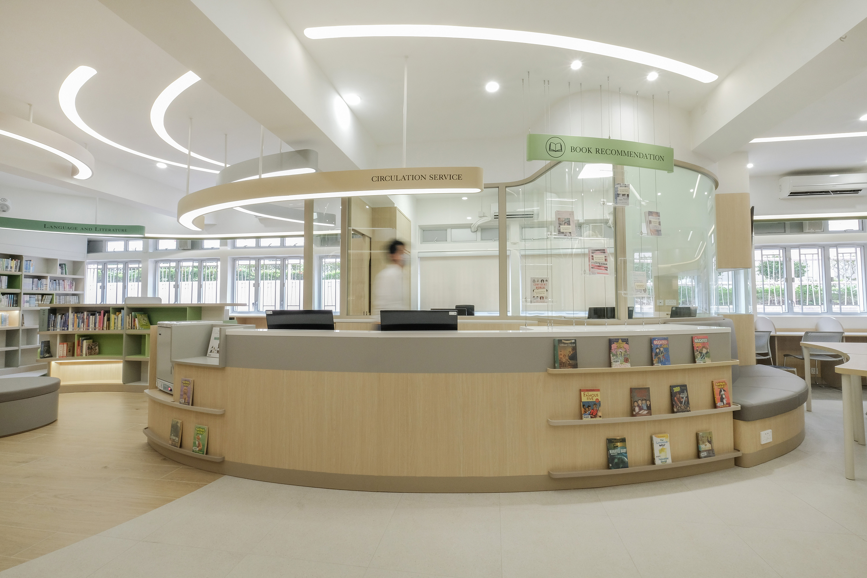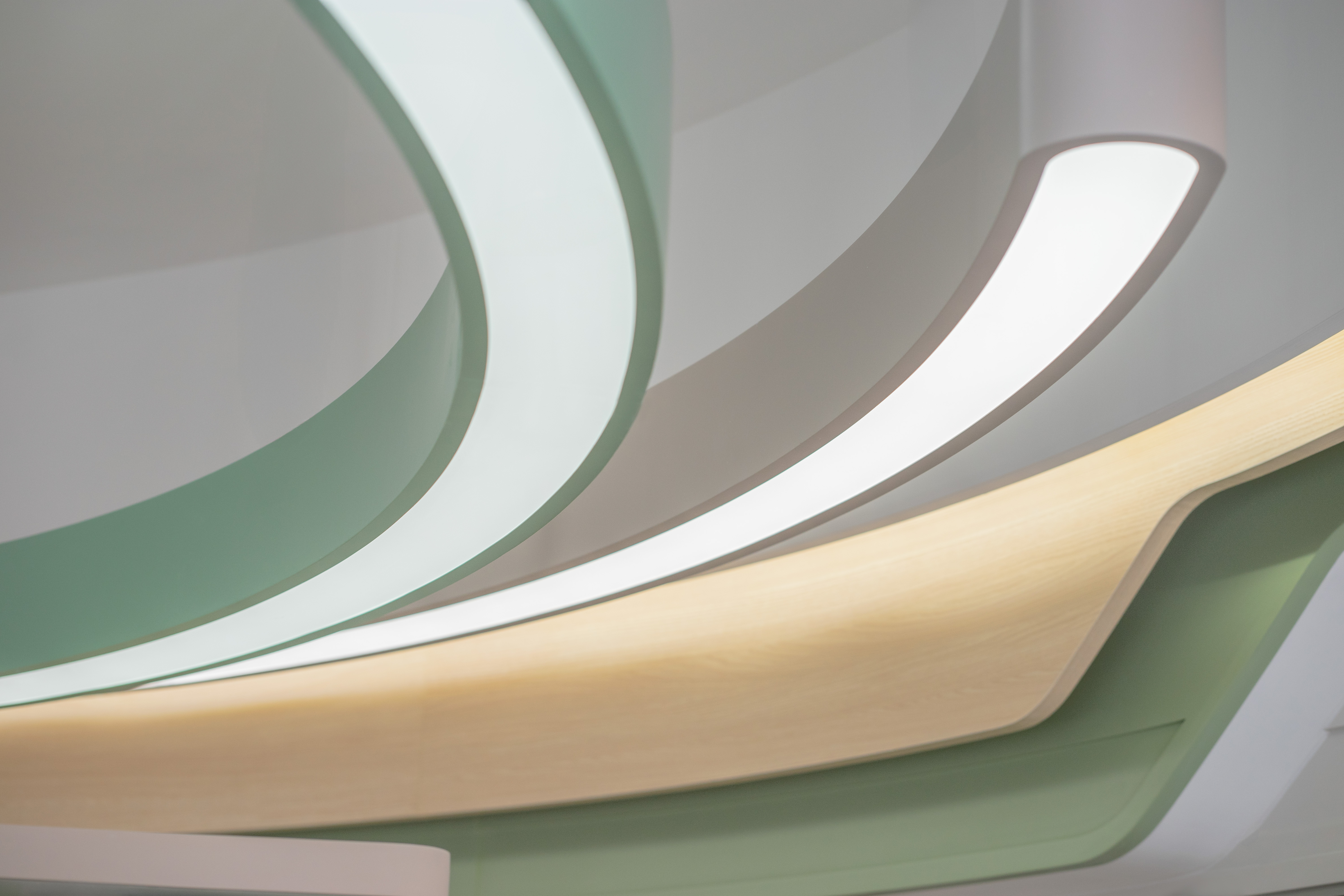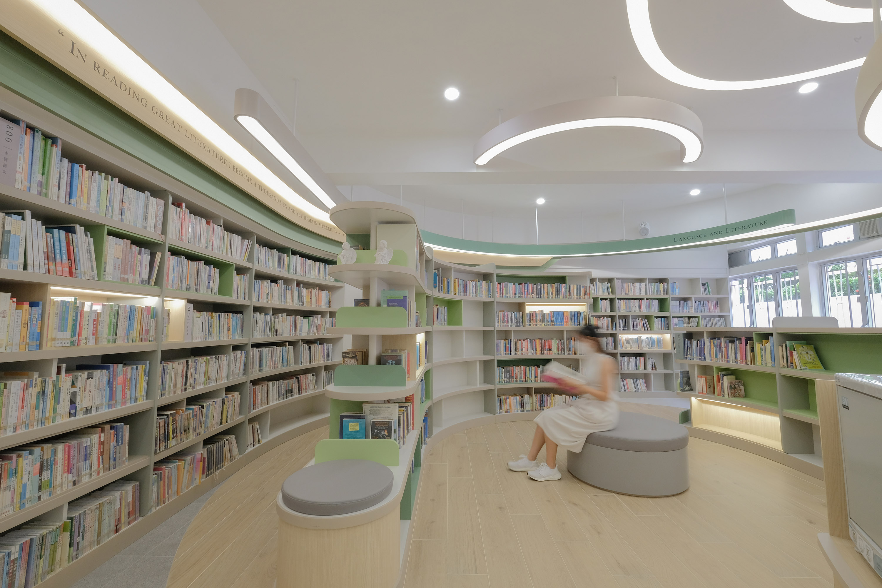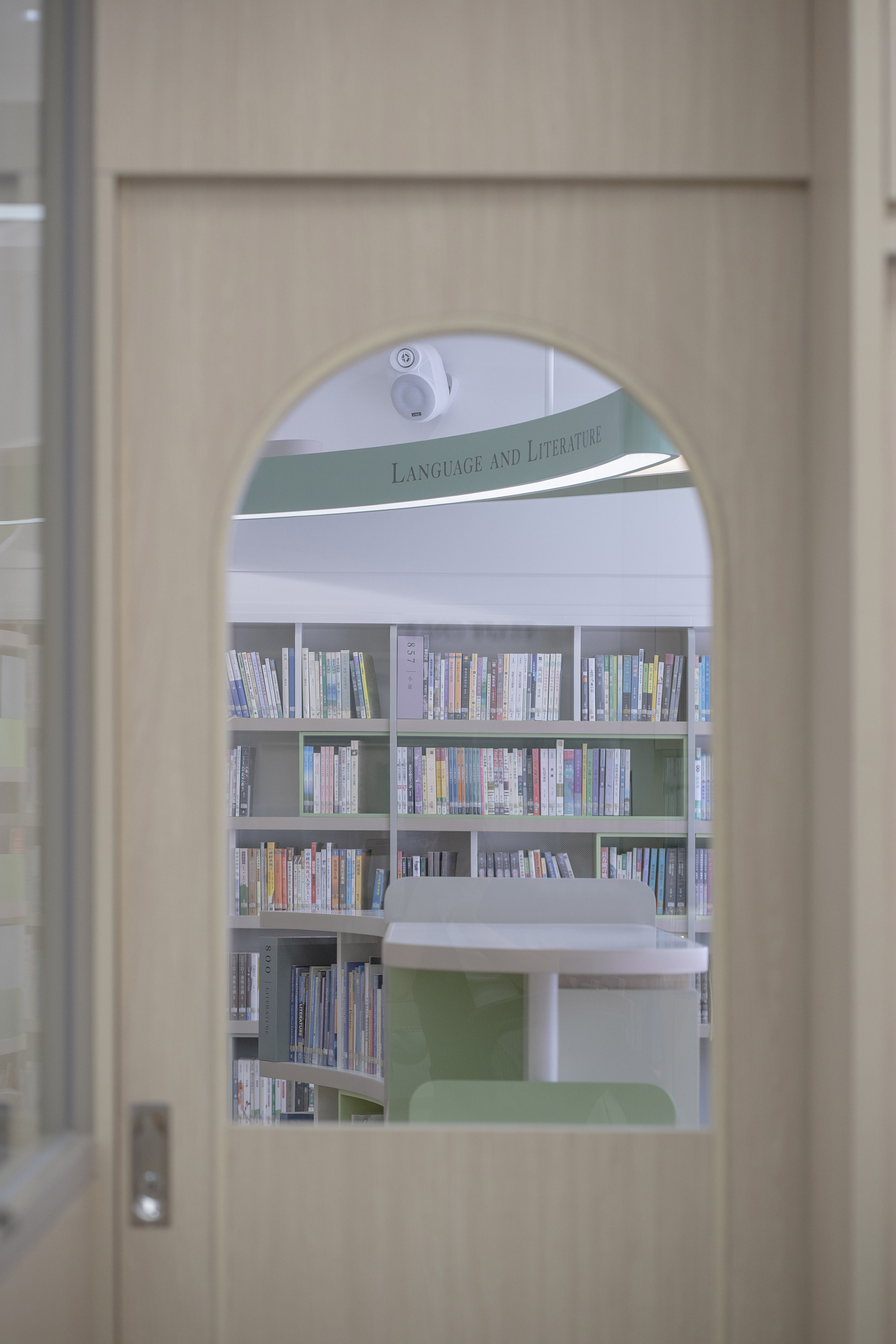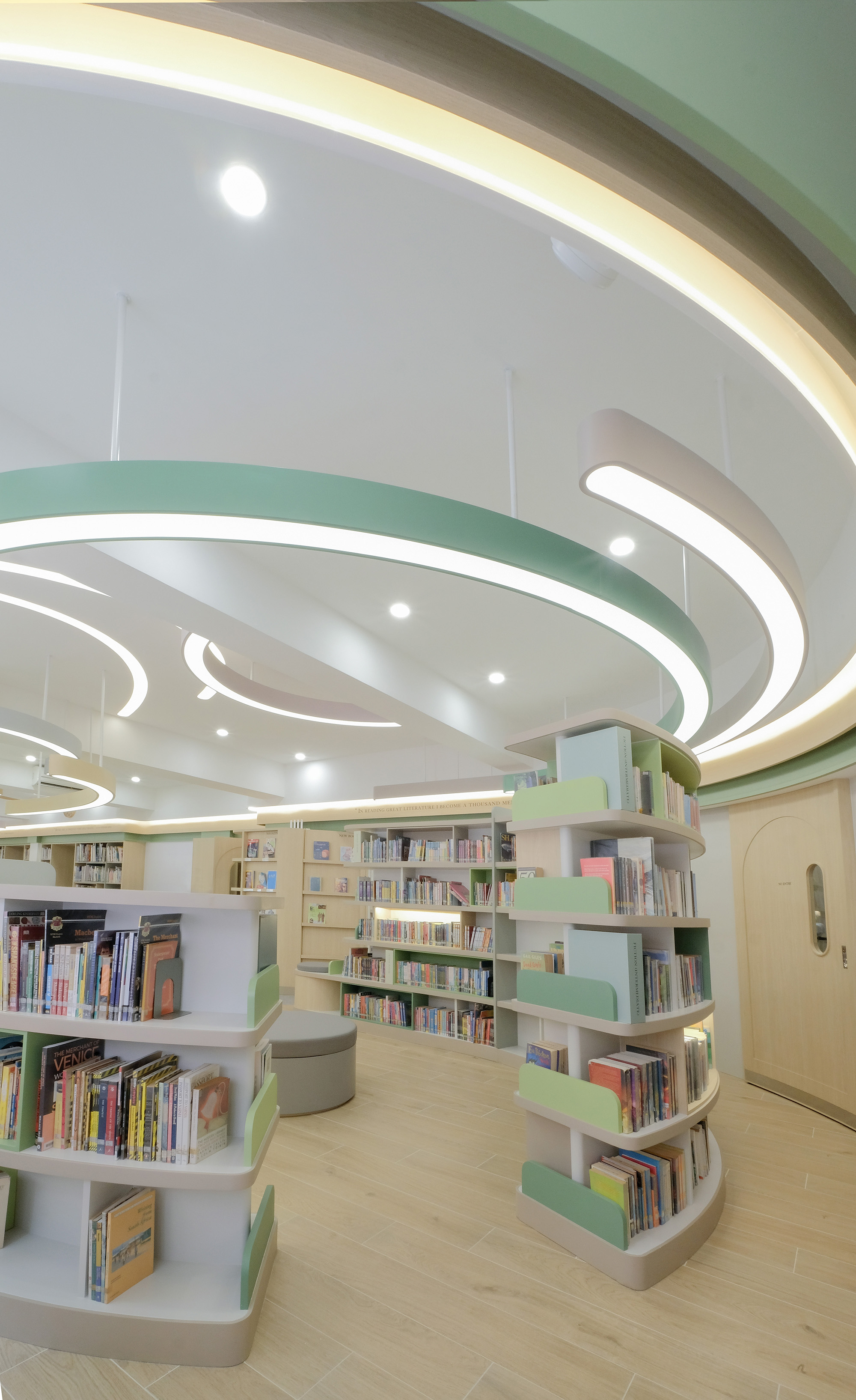 Upon entering the library, one’s eyes are immediately drawn to a vivid aerial scene. The ceiling design ingeniously uses arcs of green and beige lighting fixtures to create an effect reminiscent of a gentle breeze flowing beneath tree branches. These arc-shaped hanging lights trace flowing paths through the space, surrounding the entire library like leaves swaying in the wind. They imbue the space with rhythm and natural energy, offering students a sense of safety and embrace from nature. The overlapping green arcs resemble a soft canopy of shade, making students feel wrapped in the arms of the natural world. Meanwhile, the beige arc lights mimic warm sunlight filtering through leaf gaps, gently illuminating book pages.