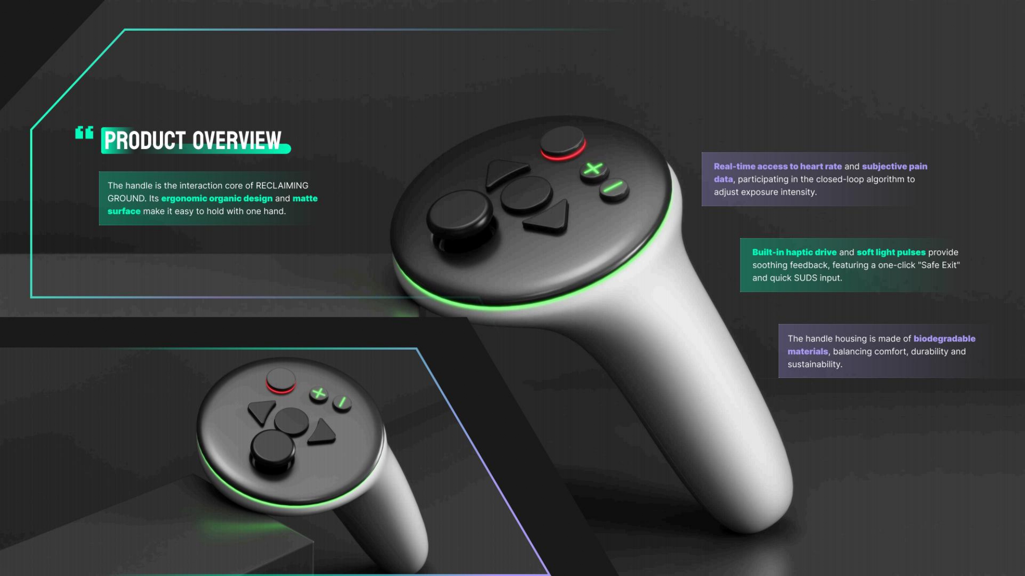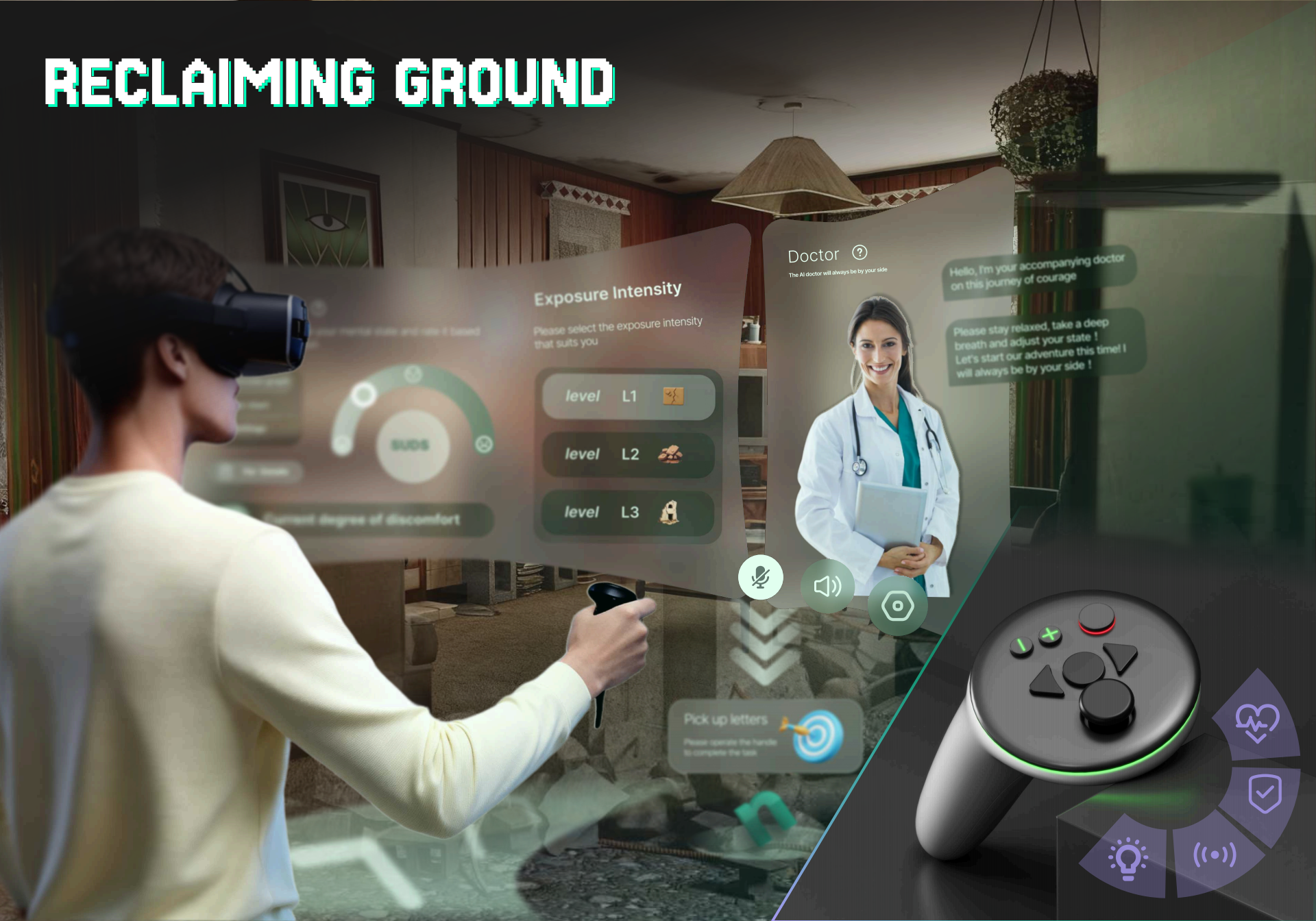 RECLAIMING GROUND is a serious-game therapy system combining AR glasses with a custom smart grip to support graduated exposure therapy for post-disaster PTSD. The project creates controlled, scalable “ruin scenarios” overlaid onto the user’s real environment while continuously monitoring heart rate and Subjective Units of Distress (SUDS). The smart grip delivers synchronized haptic cues and a calming light pulse, and includes an immediate “Safe Exit” control so users retain absolute agency. Data from physiological signals and self-reported SUDS feed a closed-loop algorithm that adjusts intensity and provides multi-sensory interventions (guided-breathing visuals, soothing vibration) when anxiety rises. The grip’s casing is manufactured from biodegradable materials to reduce environmental impact and support the project’s sustainability goals. Designed for clinical integration and home use, RECLAIMING GROUND reframes exposure therapy into a safer, data-driven, and user-empowering journey toward rebuilding emotional tolerance and a sense of safety.