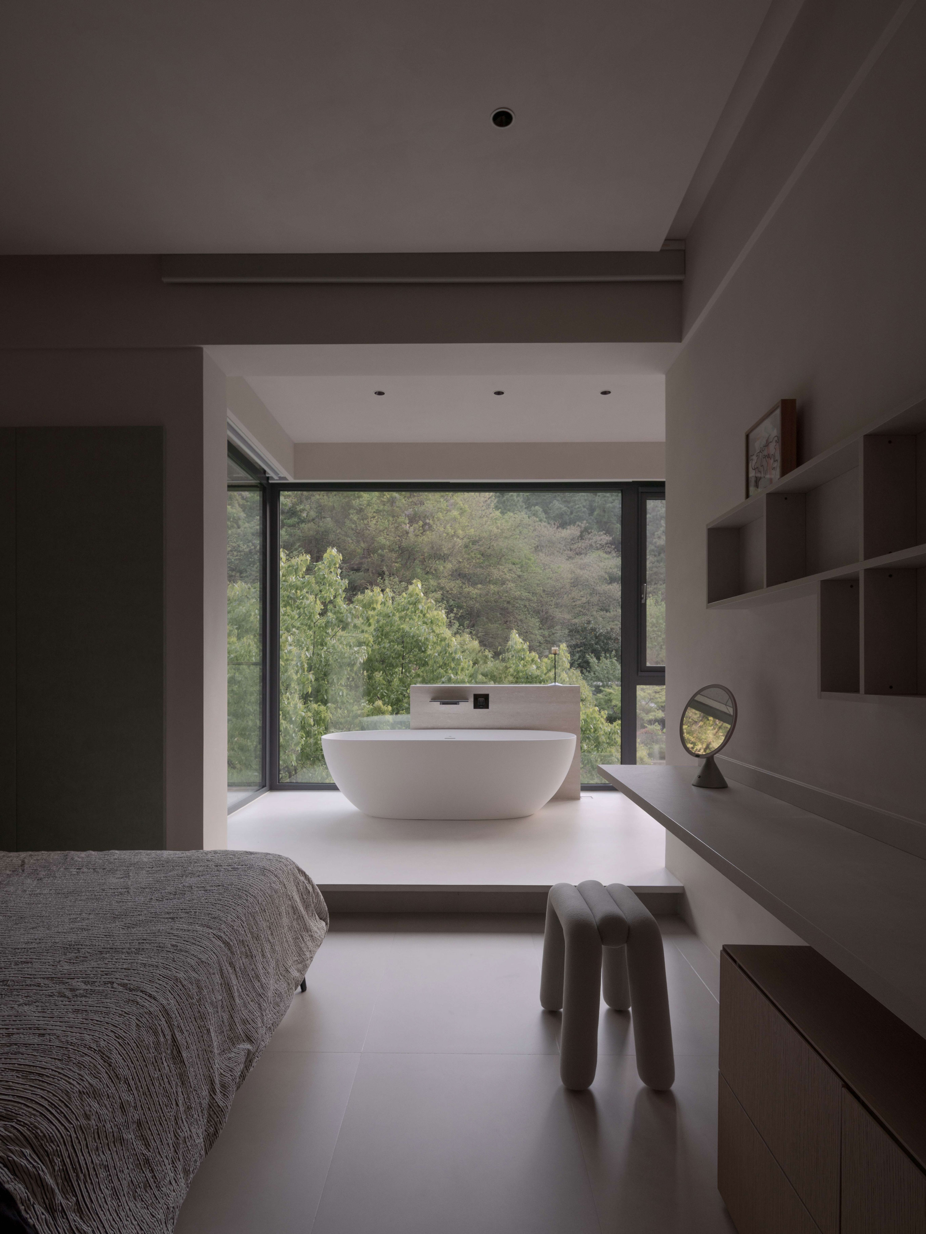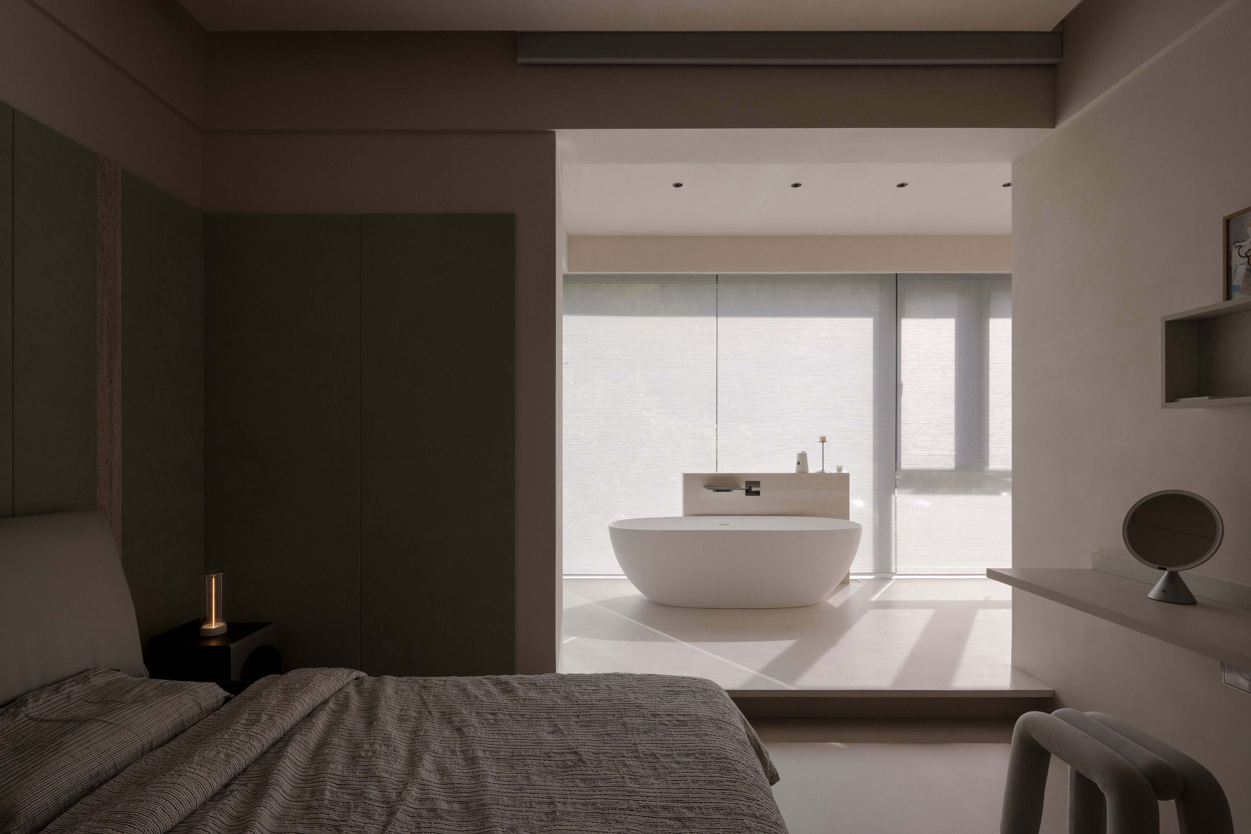 The master suite continues the dialogue of earth tones, with headboard and cabinetry forming an embracing haven. Bedroom, study, and balcony connect seamlessly, while the terrace bathtub opens to nature, turning bathing into a ritual across seasons.