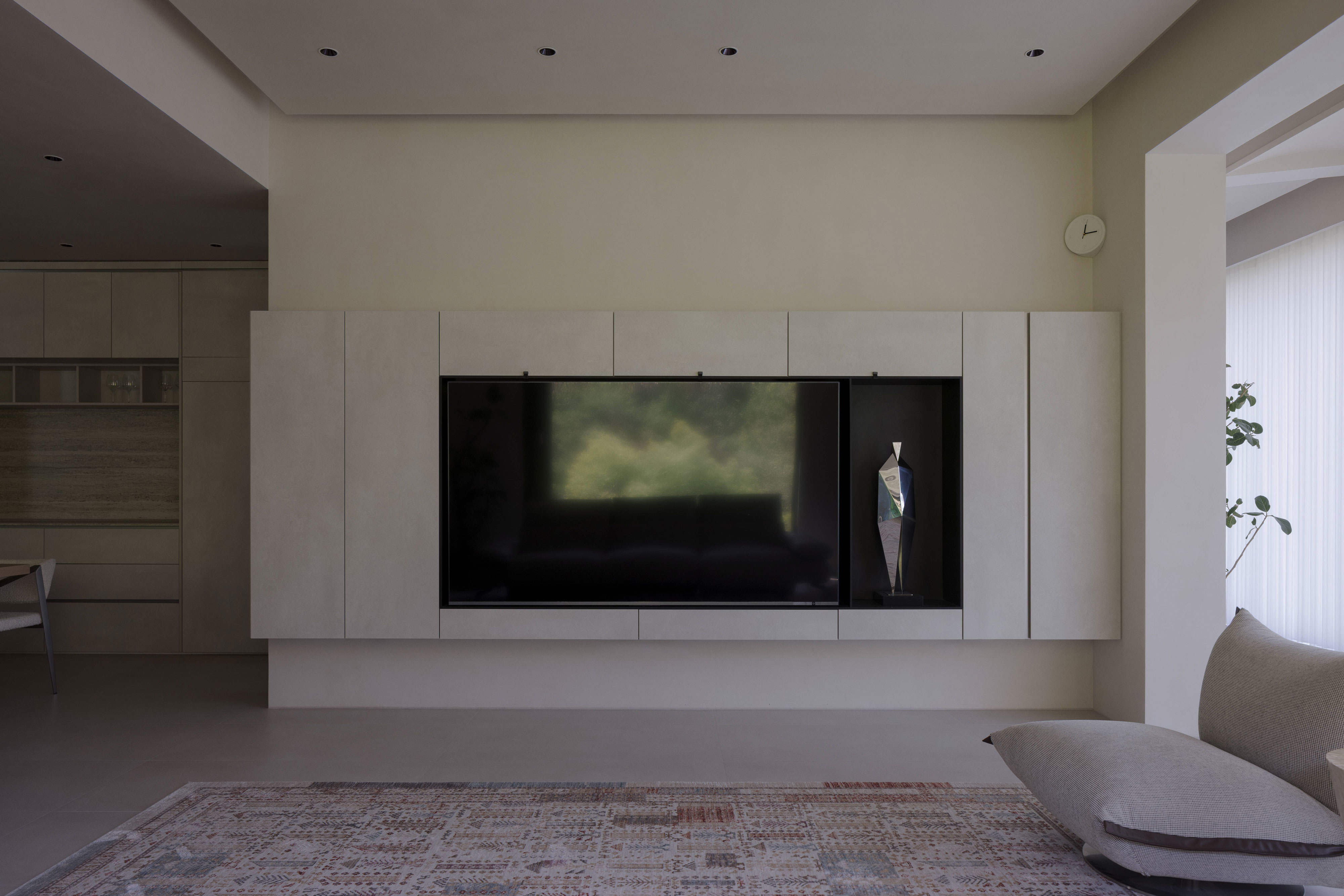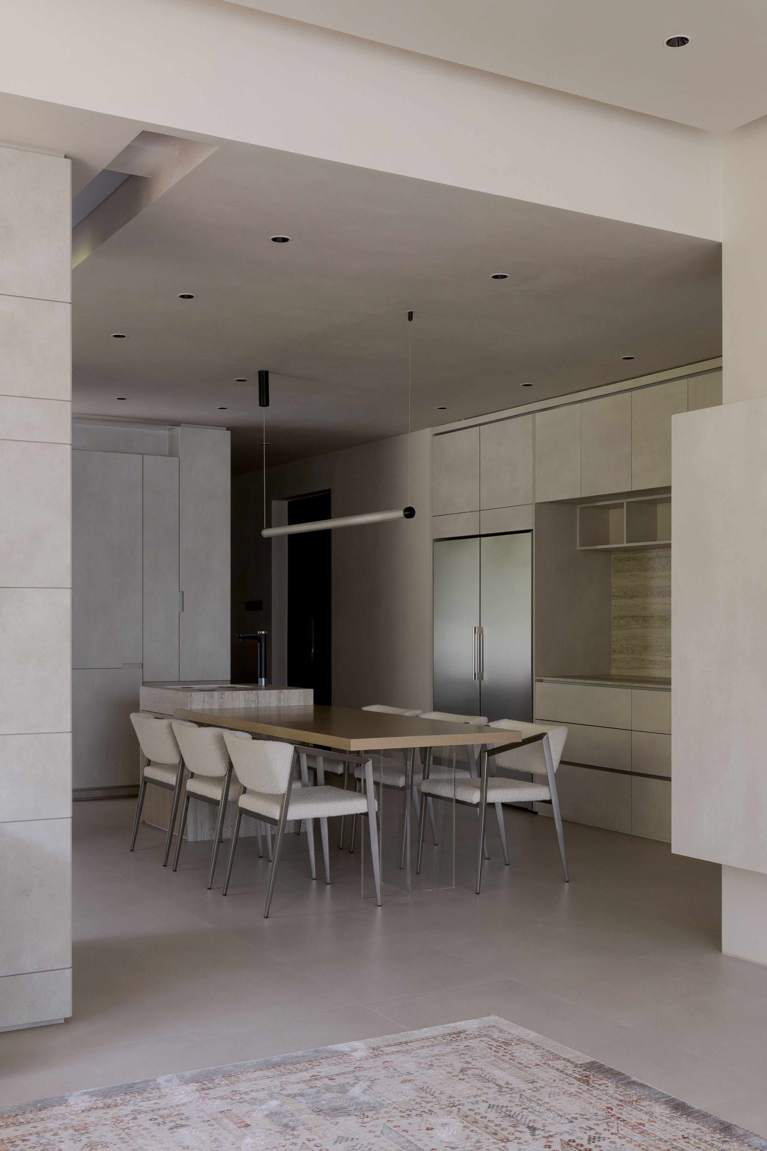 Custom cabinets define a dual circulating flowing through the home like a stream. Daily movements become fluid, and natural interactions transform the house into a theater of life.