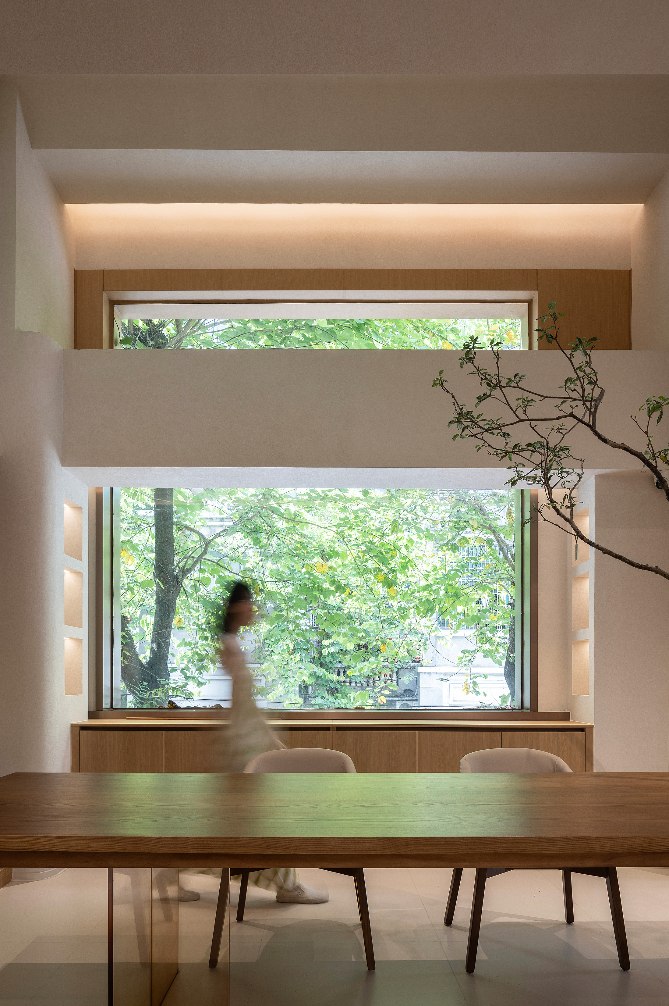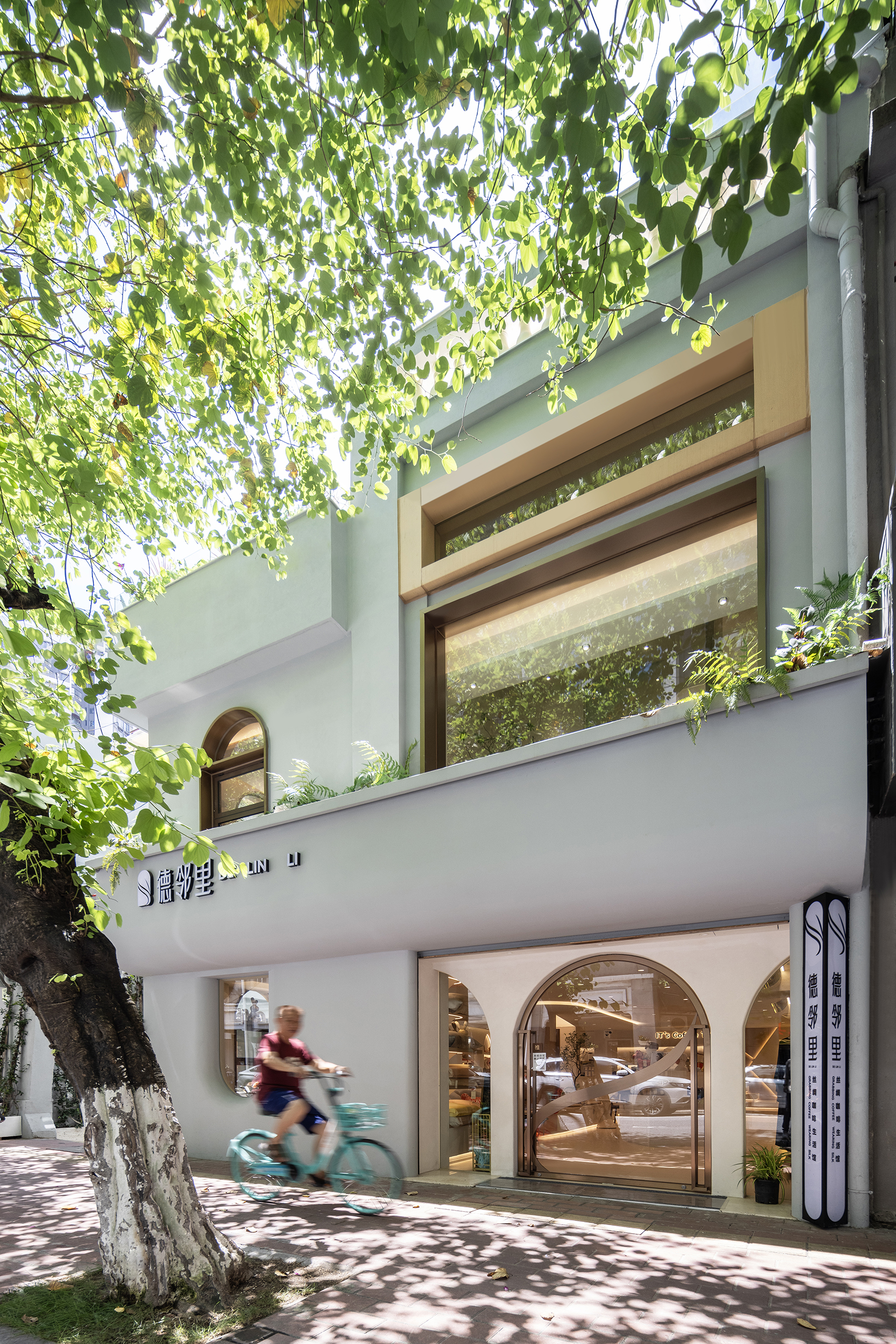 The design thoughtfully integrates with the existing building structure. A unified semi-arc shape was applied to the façade openings, establishing a rhythmic and highly recognizable architectural language that enhances the shop's street presence. To soften the building's robust lines, warm grey paint and abundant greenery are used indoors, cultivating a serene atmosphere.