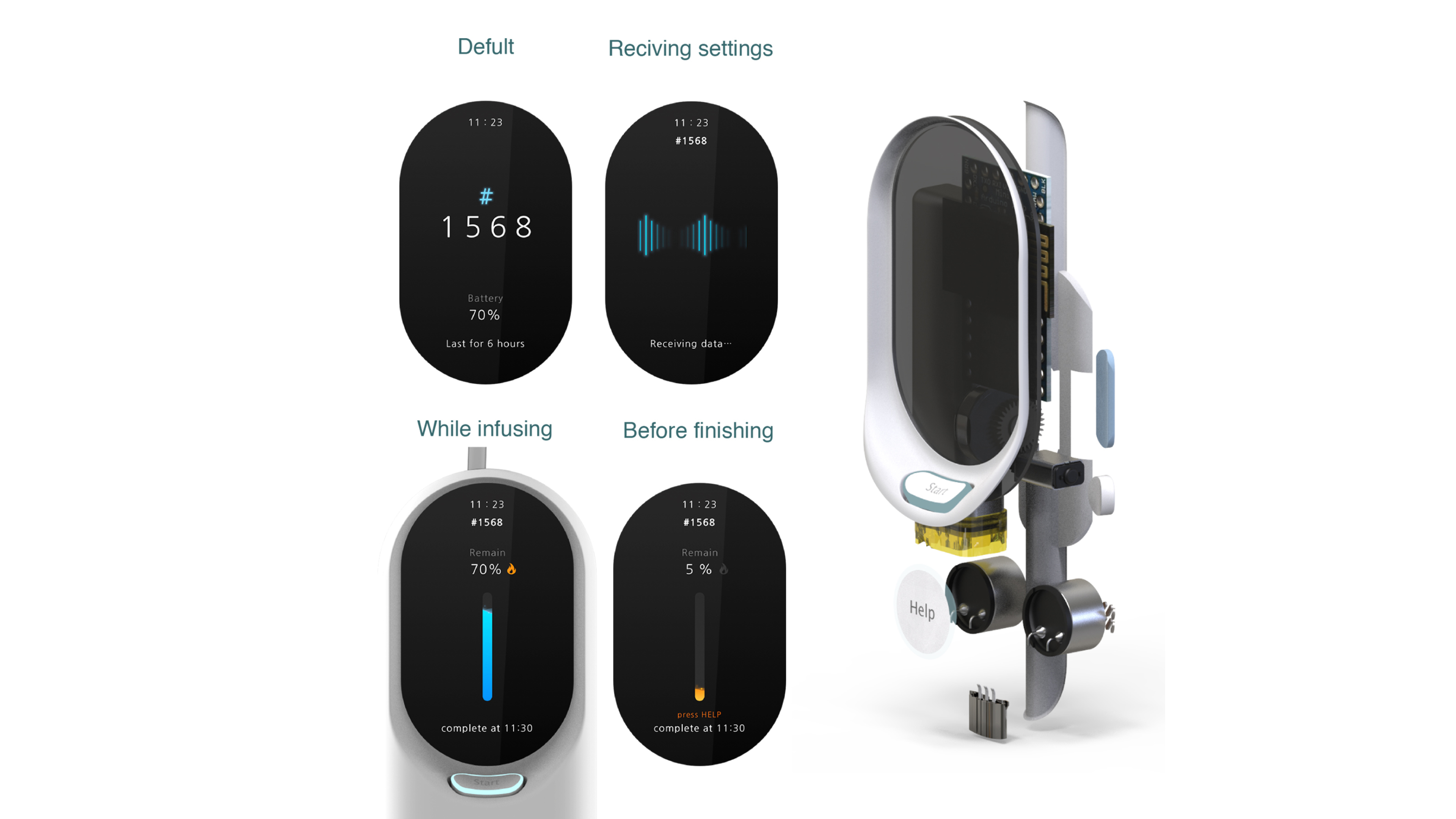 Infusion Guard adopts a modular design internally, integrating cutting-edge technologies such as central processing chip, Wi Fi module, micro motor, heating wire, battery, etc., with a compact structure that is easy to operate and maintain. The shell is made of biodegradable plastic, which balances environmental protection and human contact safety, reduces equipment weight, and improves grip and installation comfort. The operation interface is simple, with clear "start" button and "help" button, which can be used without complex learning, making it easy for patients and nurses to quickly identify and operate. Equipped with heating function, the medicine is heated through a heating wire to avoid discomfort caused by low-temperature infusion and improve the patient's physiological comfort. Equipped with intelligent linkage function, nurses can remotely set infusion parameters through a smartwatch, and the device will automatically execute them after receiving them, reducing human intervention. At the same time, it has voice and notification reminders: in the event of infusion completion or abnormal situations, the device will send notifications to nurses, and patients can also actively call, achieving two-way simple communication.