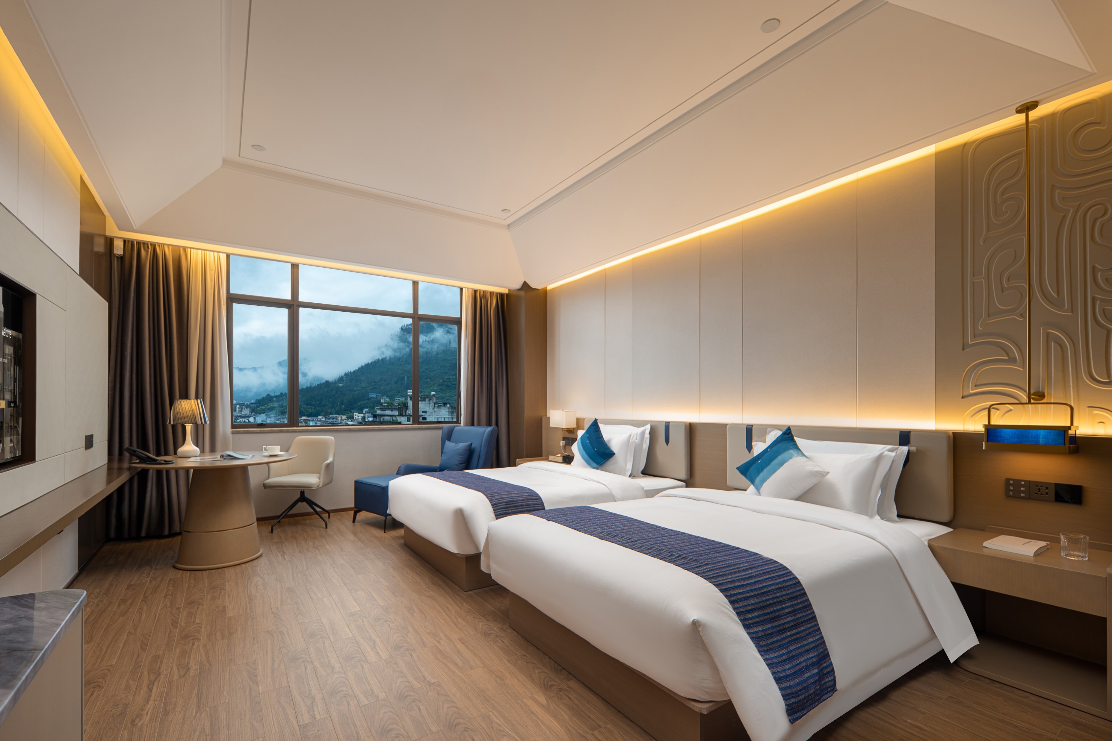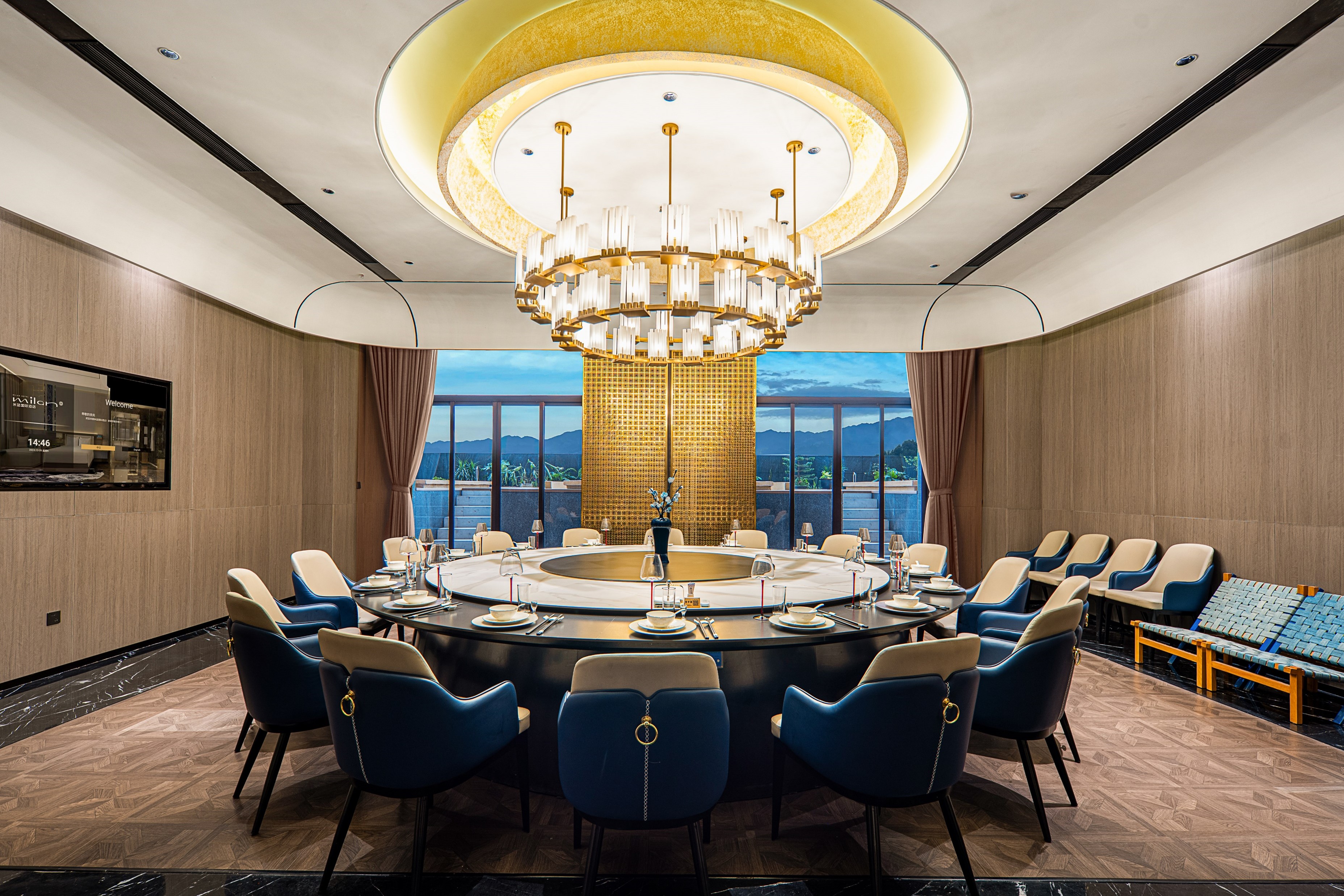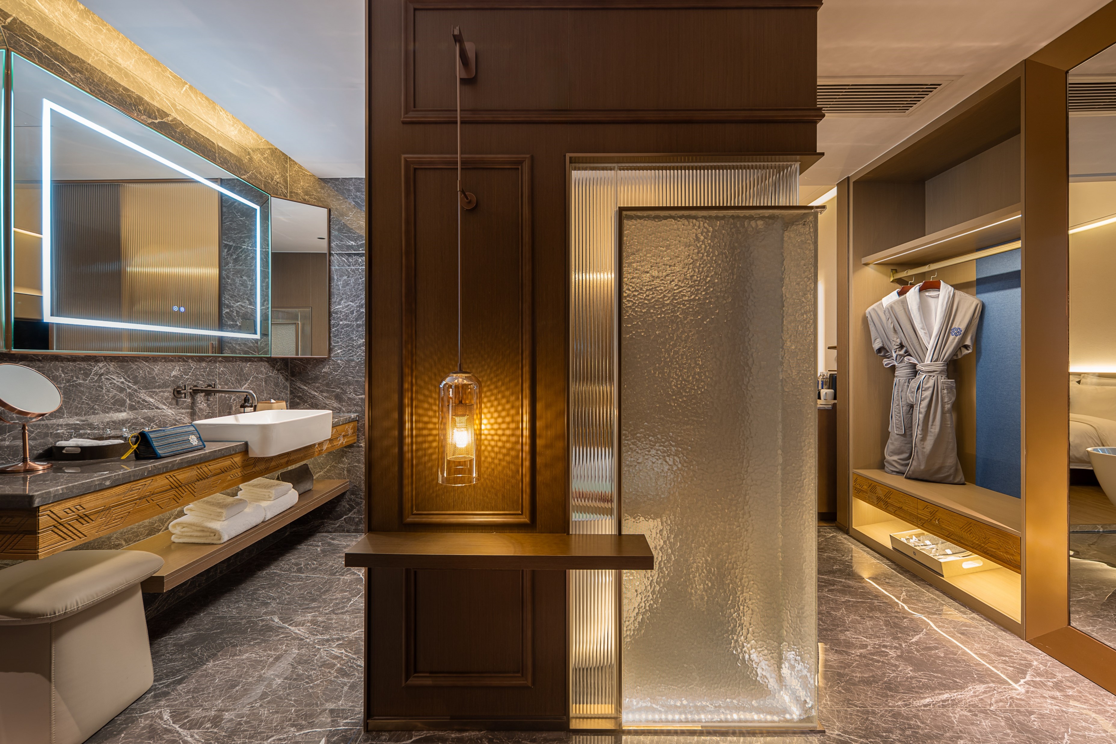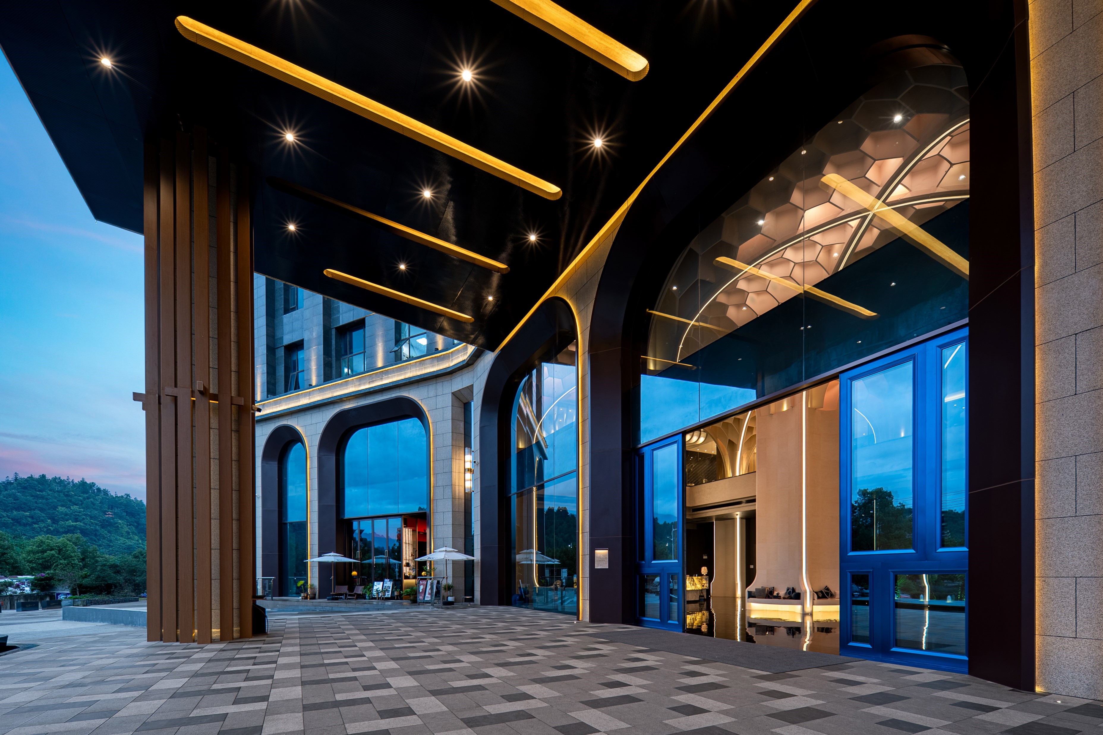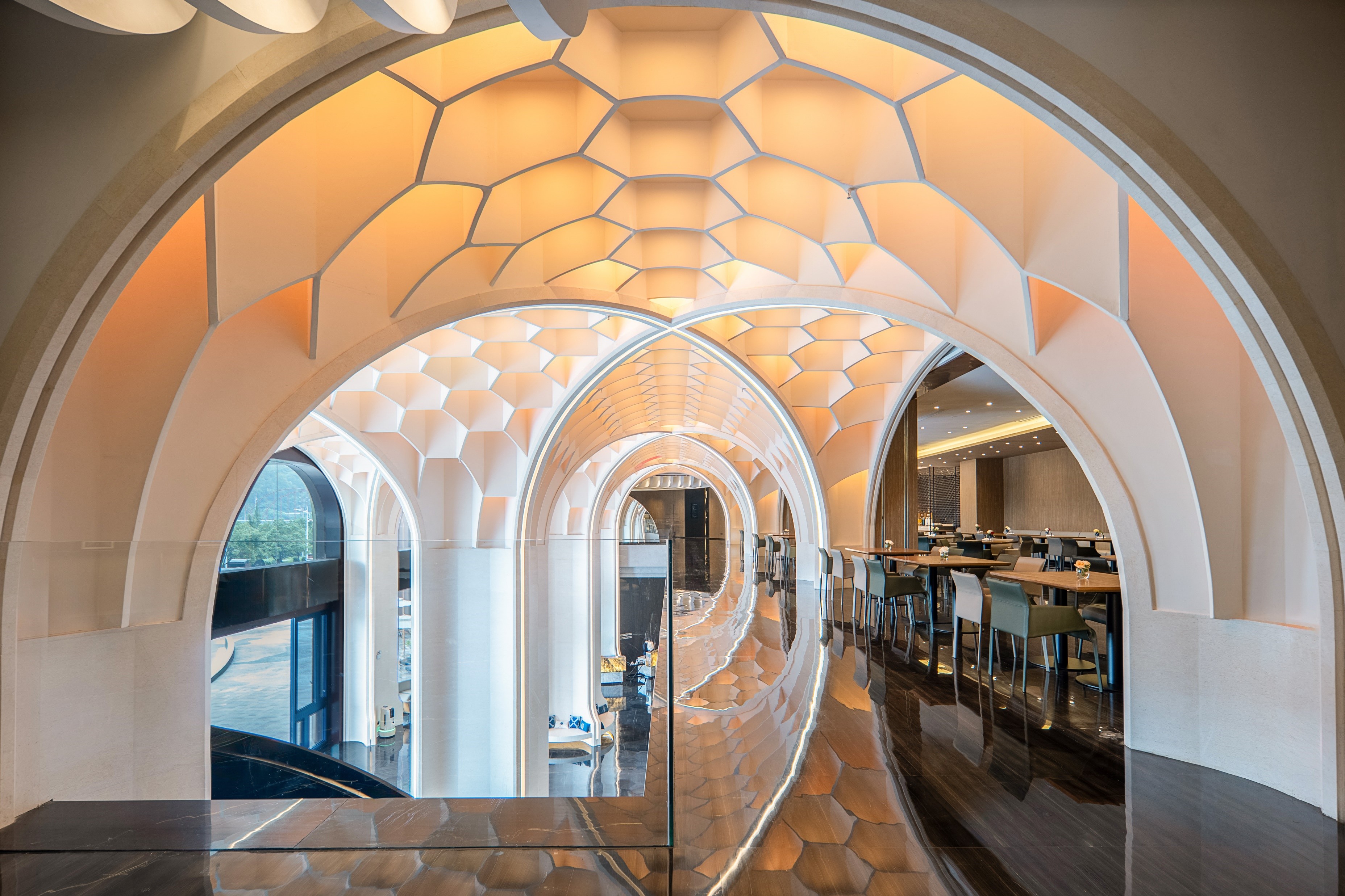 The hotel blends Eastern and Western styles. With a color palette based on black, white and gray, it is accented with cultural patterns and symbols. Cost-effective and eco-friendly materials are adopted, such as gypsum boards, wood veneers, domestic stone, local bamboo and rattan crafts, complemented by a small amount of metal edging. Using modern engineering software and gypsum, the multi-curved and multi-shaped space is crafted to mimic the texture of stone architecture.