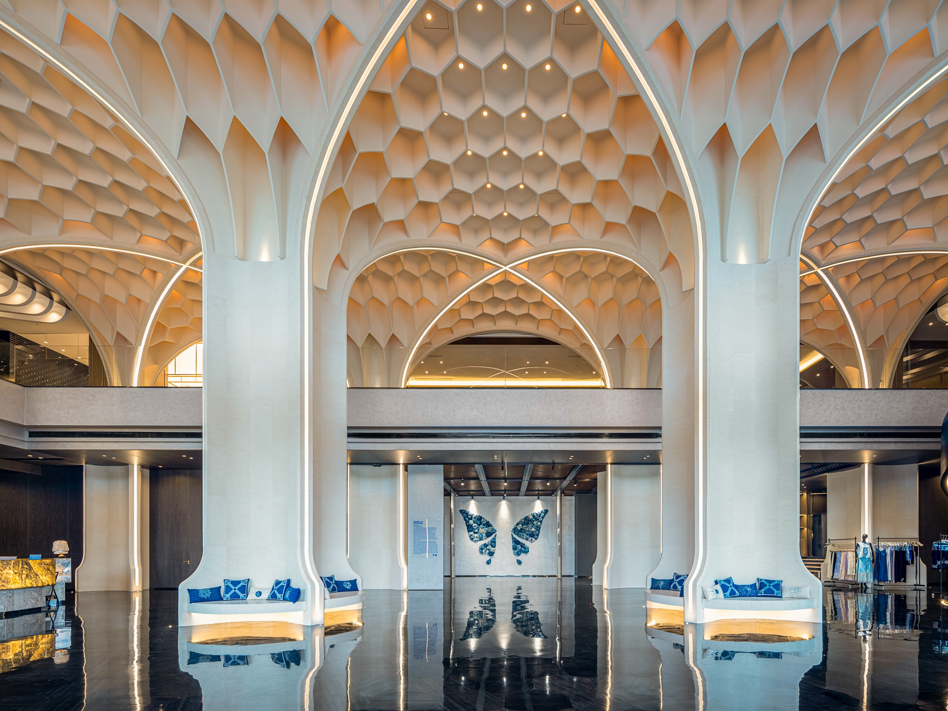 The lobby features an arch and hexagonal honeycomb structure. Over 1,000 honeycomb cells use colorful lights to simulate light filtering through tree canopies, with gradients echoing indigo layers. Arc-shaped ceilings and special column networks create a sense of depth while solving acoustic reflection issues, balancing aesthetics and functionality.