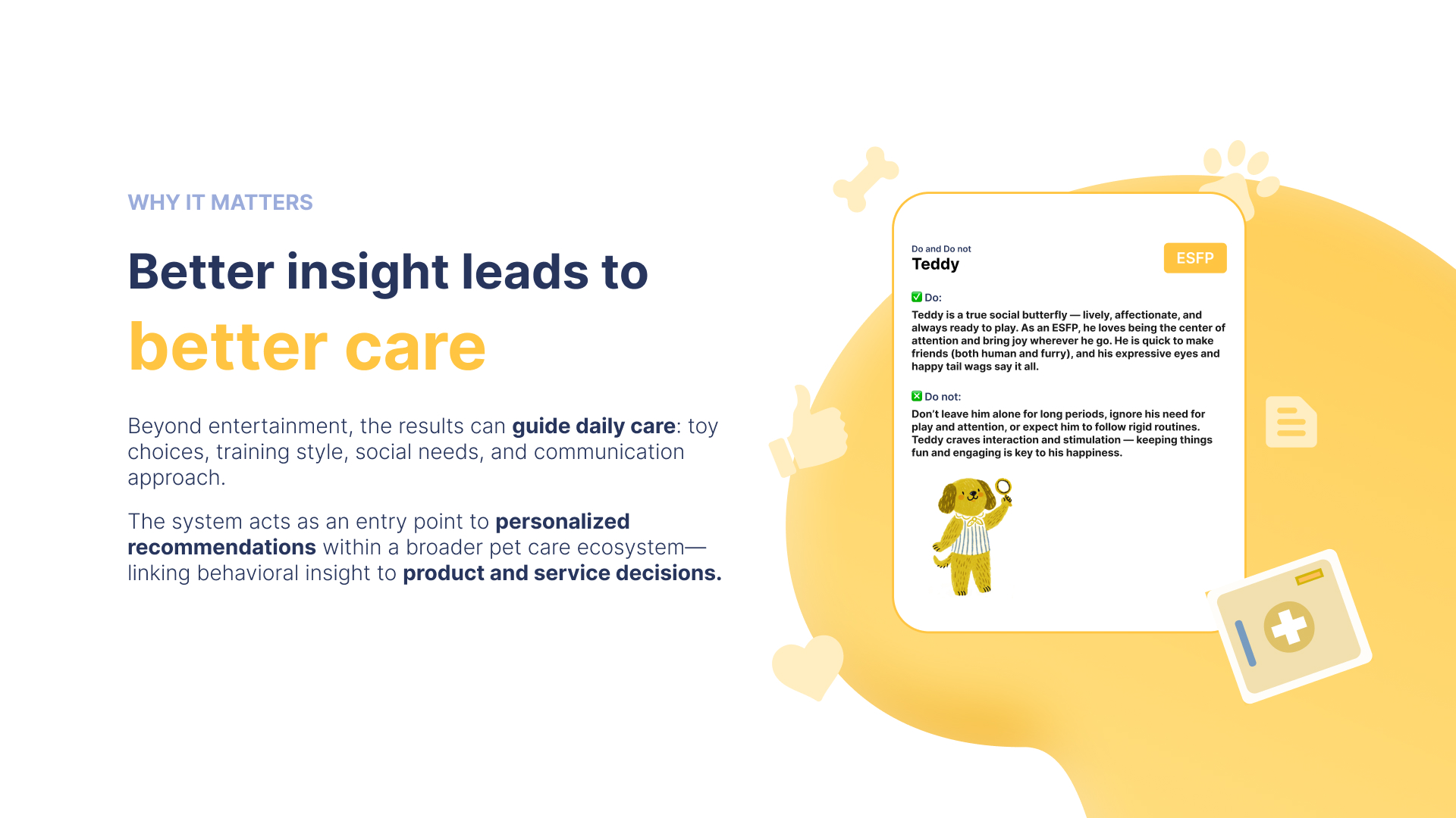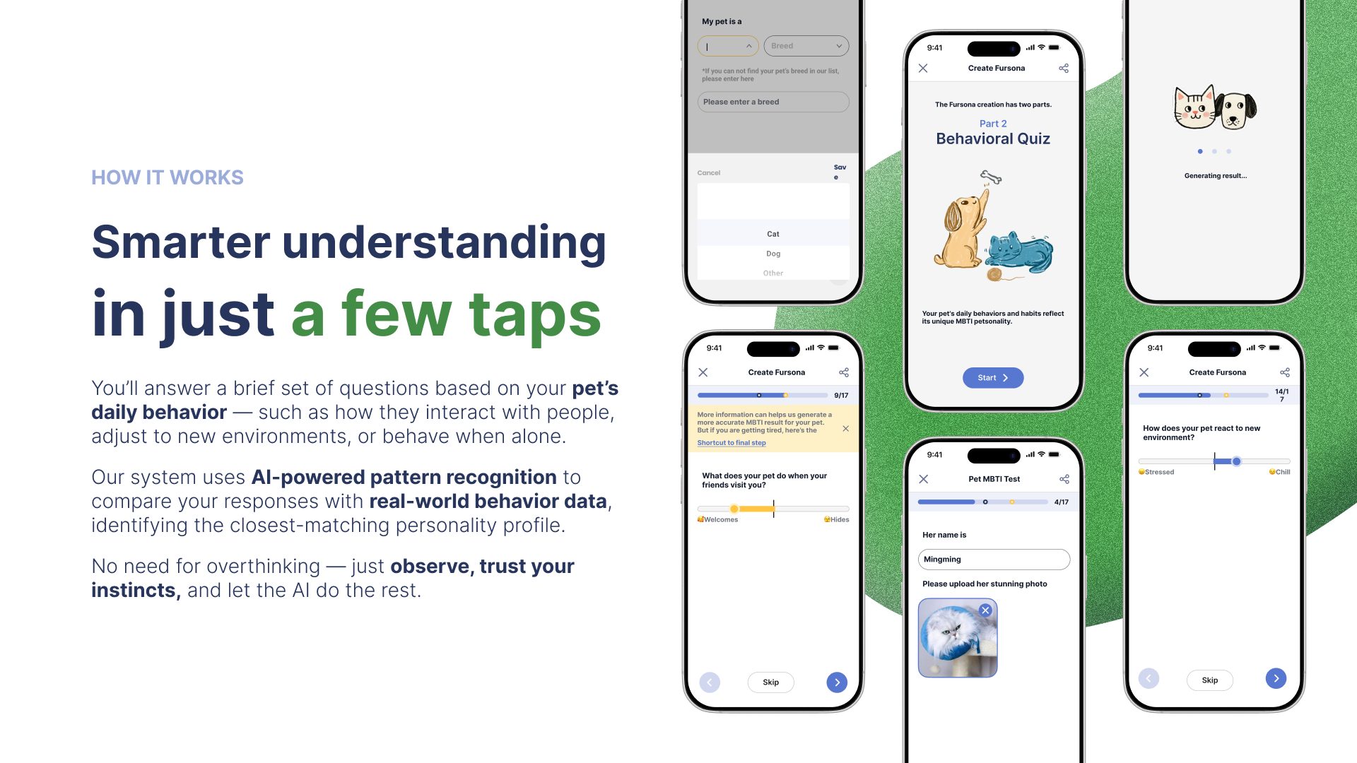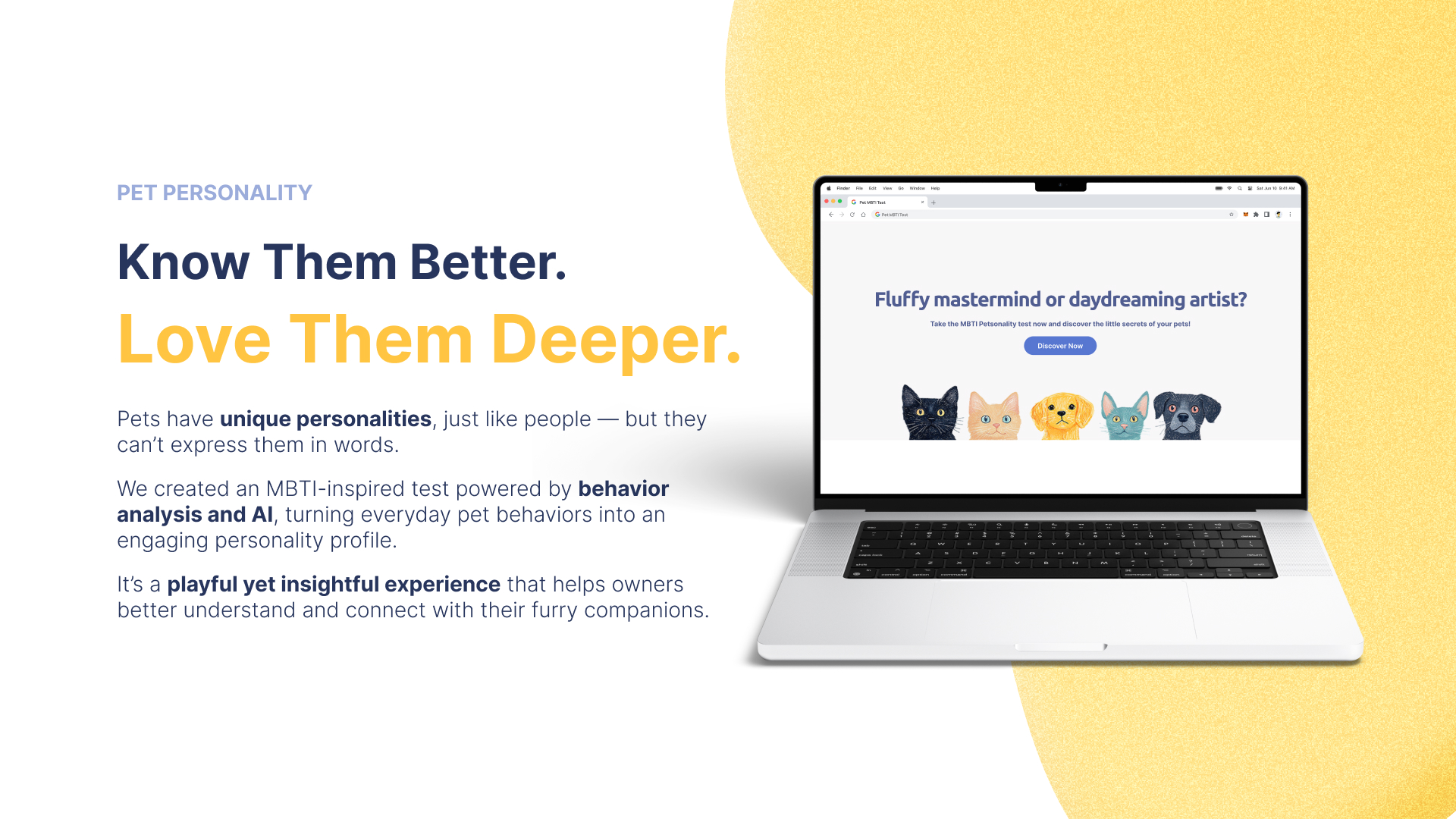 The experience is designed to be light, intuitive, and emotionally resonant. Through a series of fun prompts and guided questions, pet owners reflect on their companion’s habits — from how they respond to strangers, to how they play, rest, and seek affection. Using behavior-driven logic and a touch of AI, the system translates these inputs into a shareable personality result with charming visuals and meaningful descriptions.