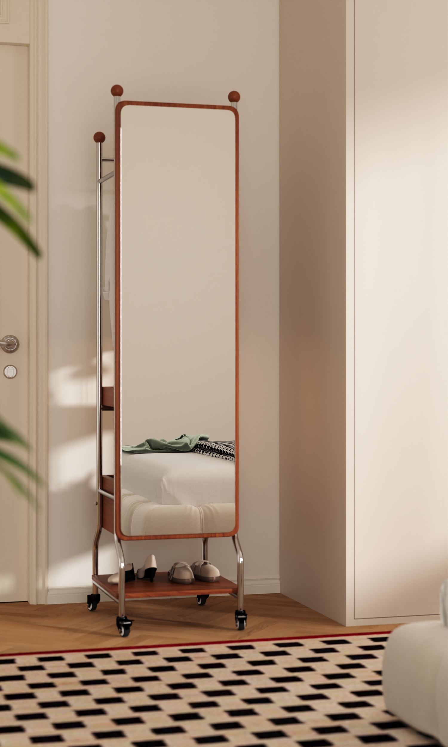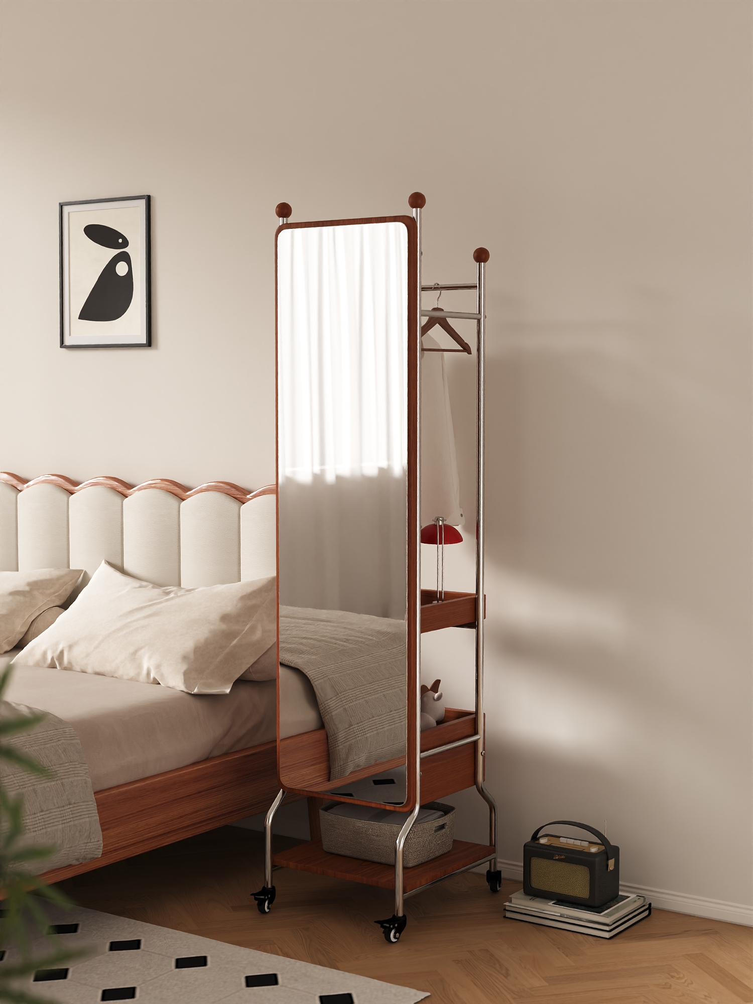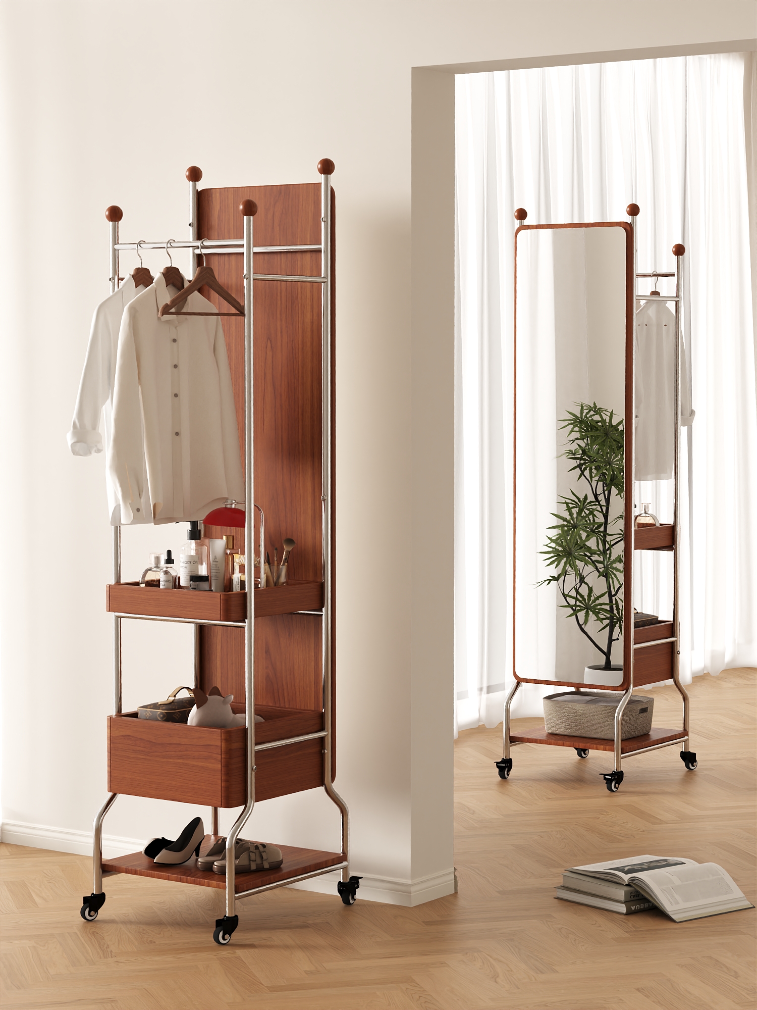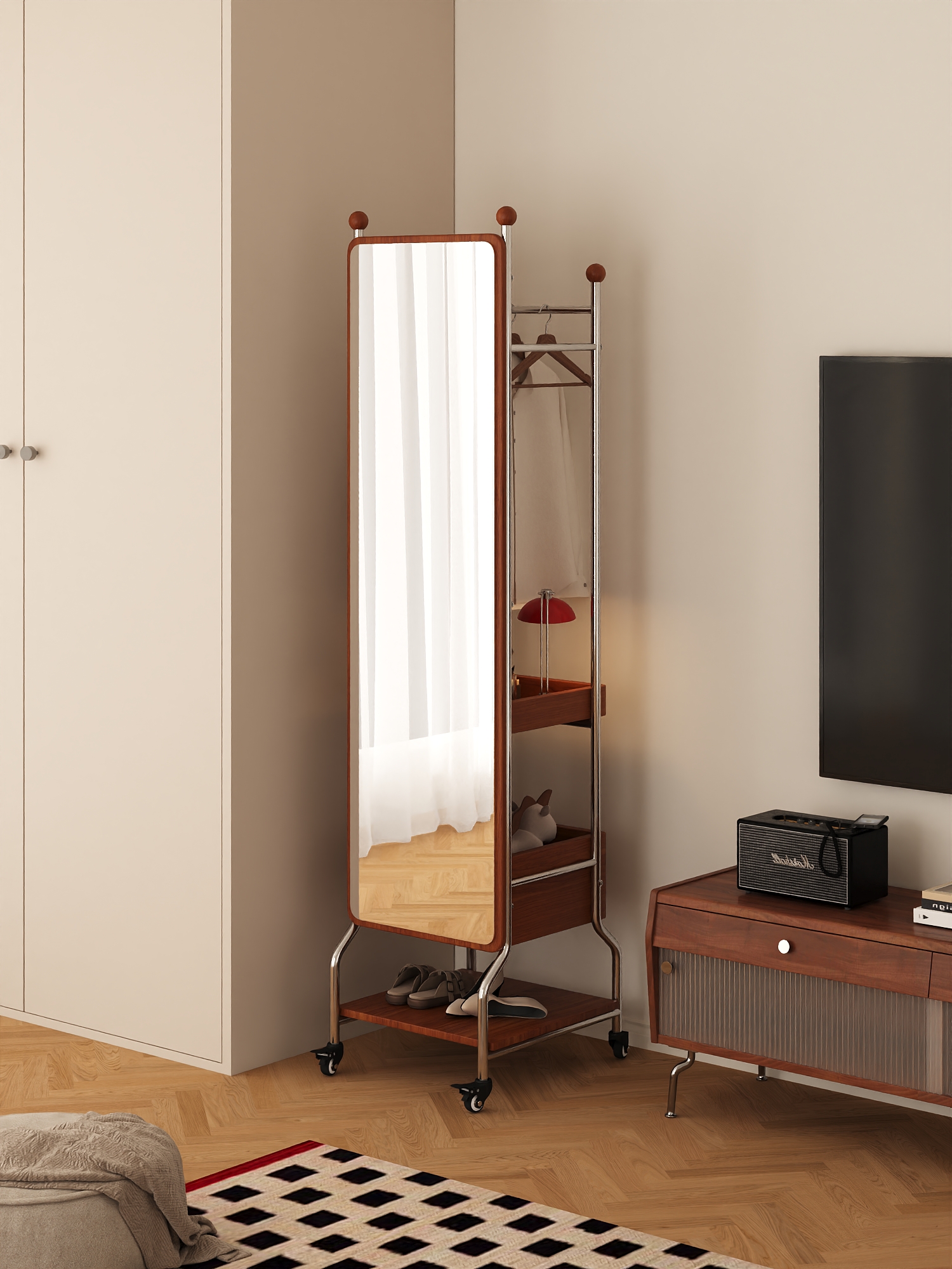 The "QiuQiu" Swivel Mirror Stand, with its extraordinary "three-in-one" functionality, saves users up to 70% of valuable space. It features a high-definition full-length mirror that provides a clear and true reflection. The mirror surface is designed with thickened explosion-proof glass, so even in the event of an accident, fragments will not scatter. The hanging rod accommodates both long dresses and short tops, and the hanging area can hold up to 30 items of clothing. Even more surprisingly, its two meticulously designed shelves ensure that every item, from skincare products and perfumes to handbags and daily footwear, finds its designated place.