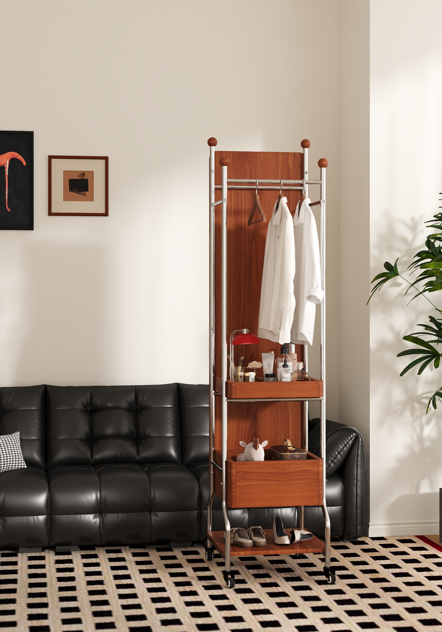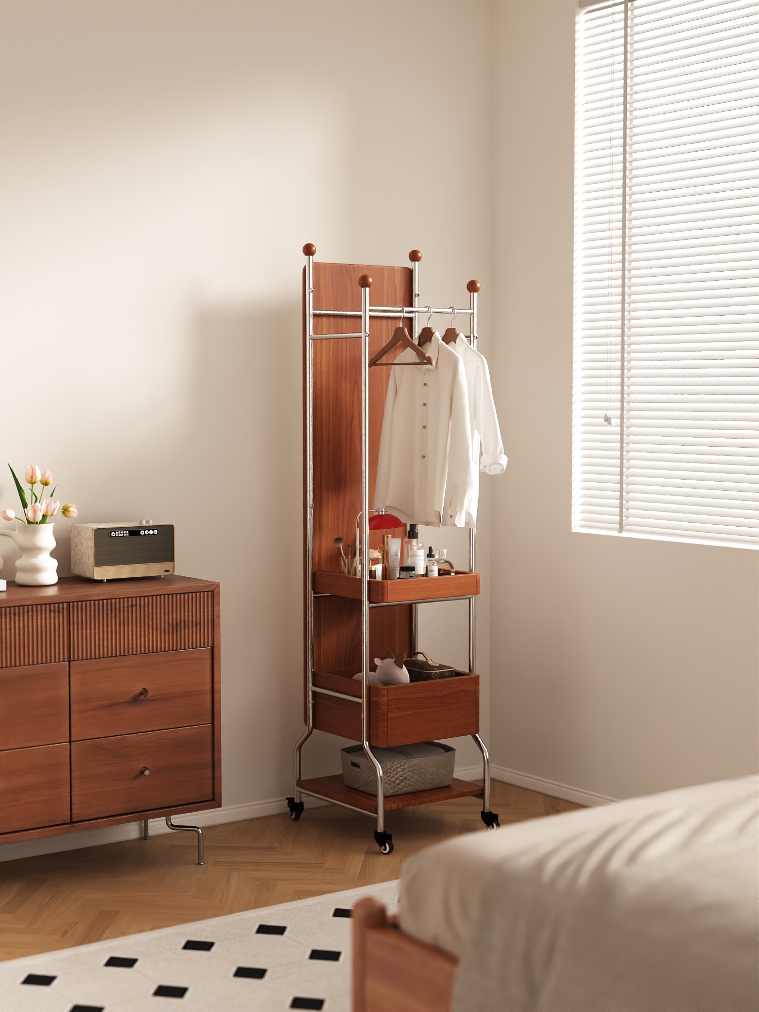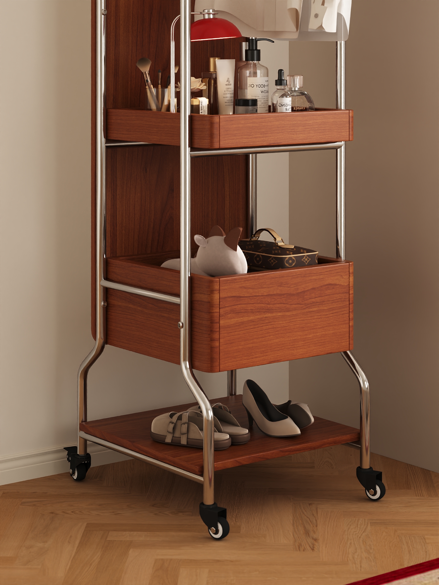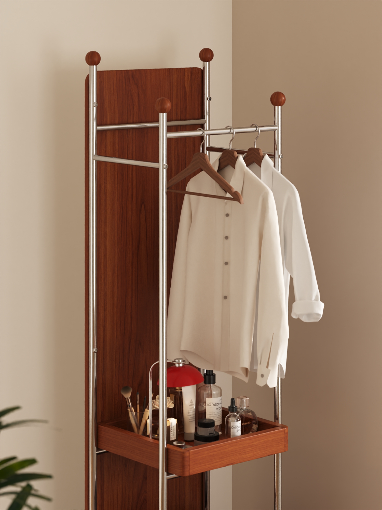 The "QiuQiu" Swivel Mirror Stand, with its extraordinary "three-in-one" functionality, saves users up to 70% of valuable space. It features a high-definition full-length mirror that provides a clear and true reflection. The mirror surface is designed with thickened explosion-proof glass, so even in the event of an accident, fragments will not scatter. The hanging rod accommodates both long dresses and short tops, and the hanging area can hold up to 30 items of clothing. Even more surprisingly, its two meticulously designed shelves ensure that every item, from skincare products and perfumes to handbags and daily footwear, finds its designated place.