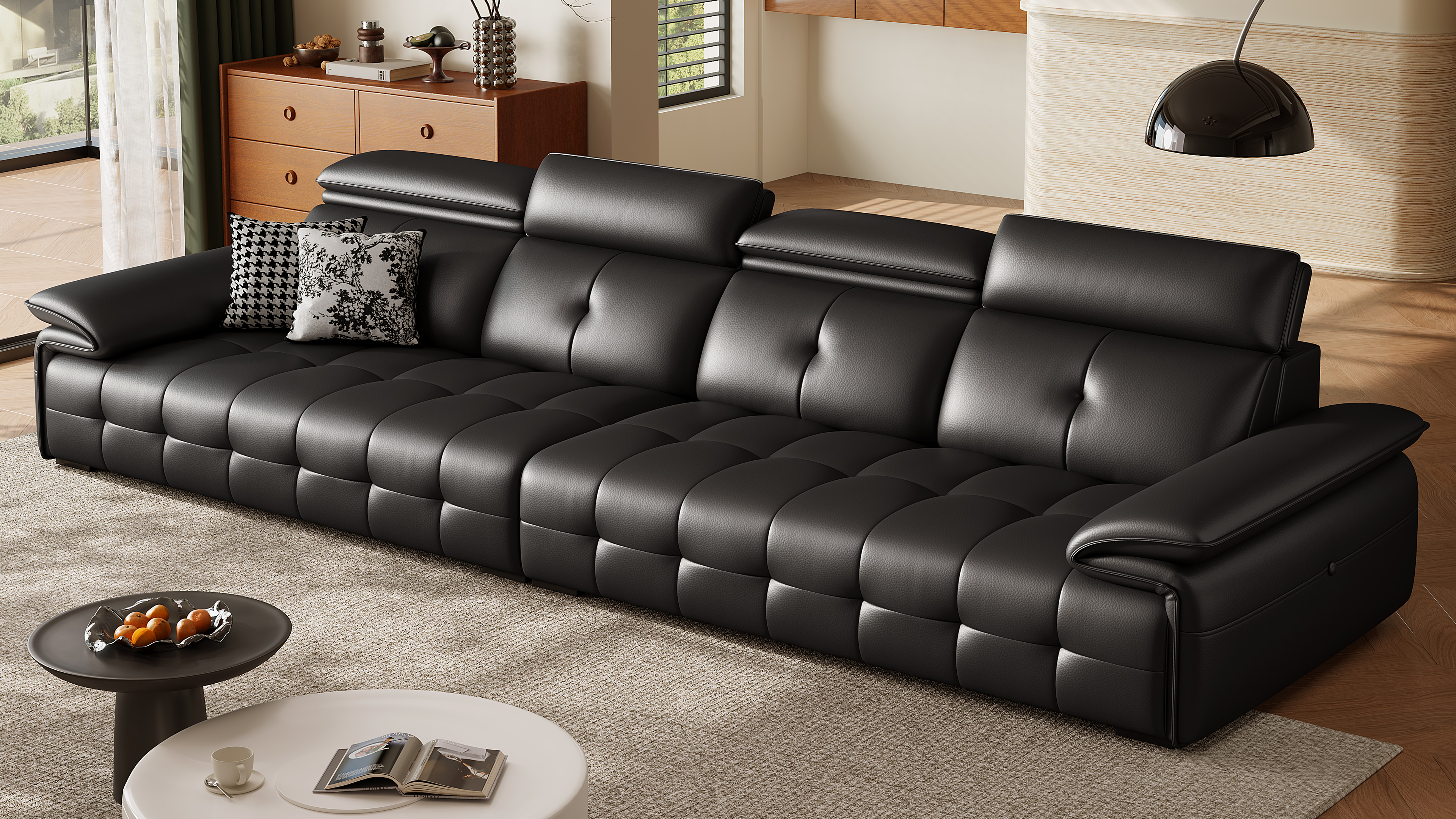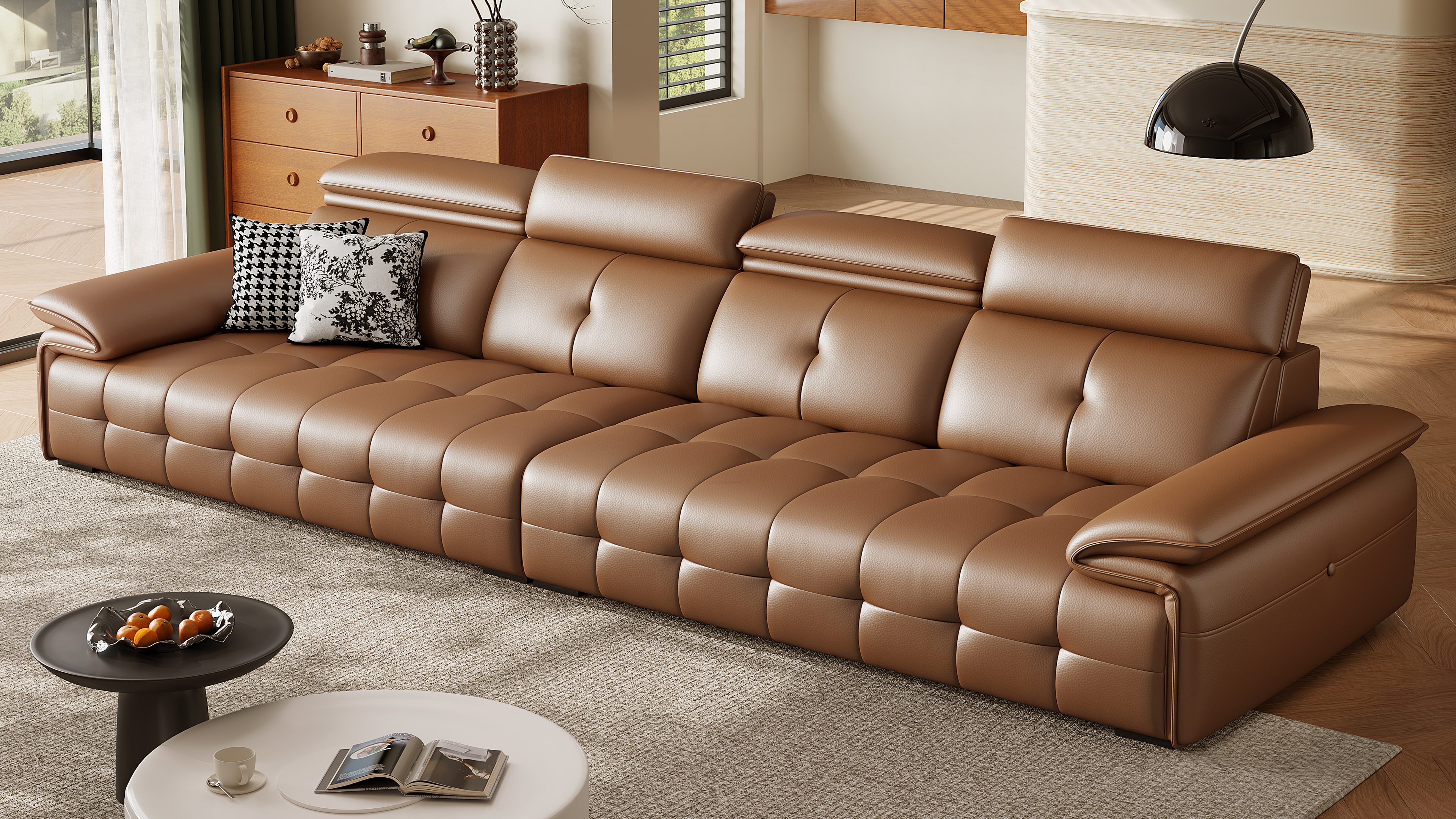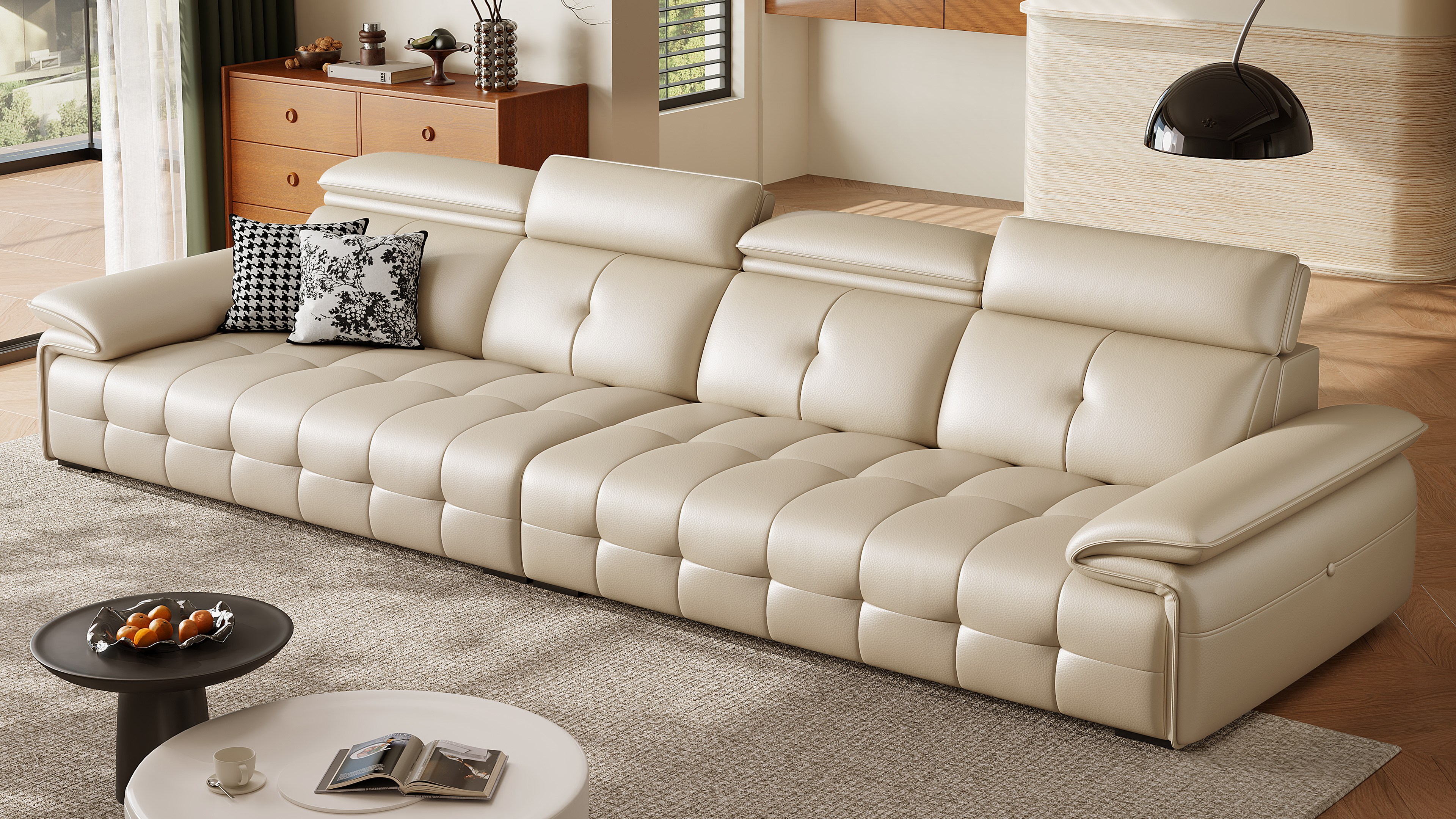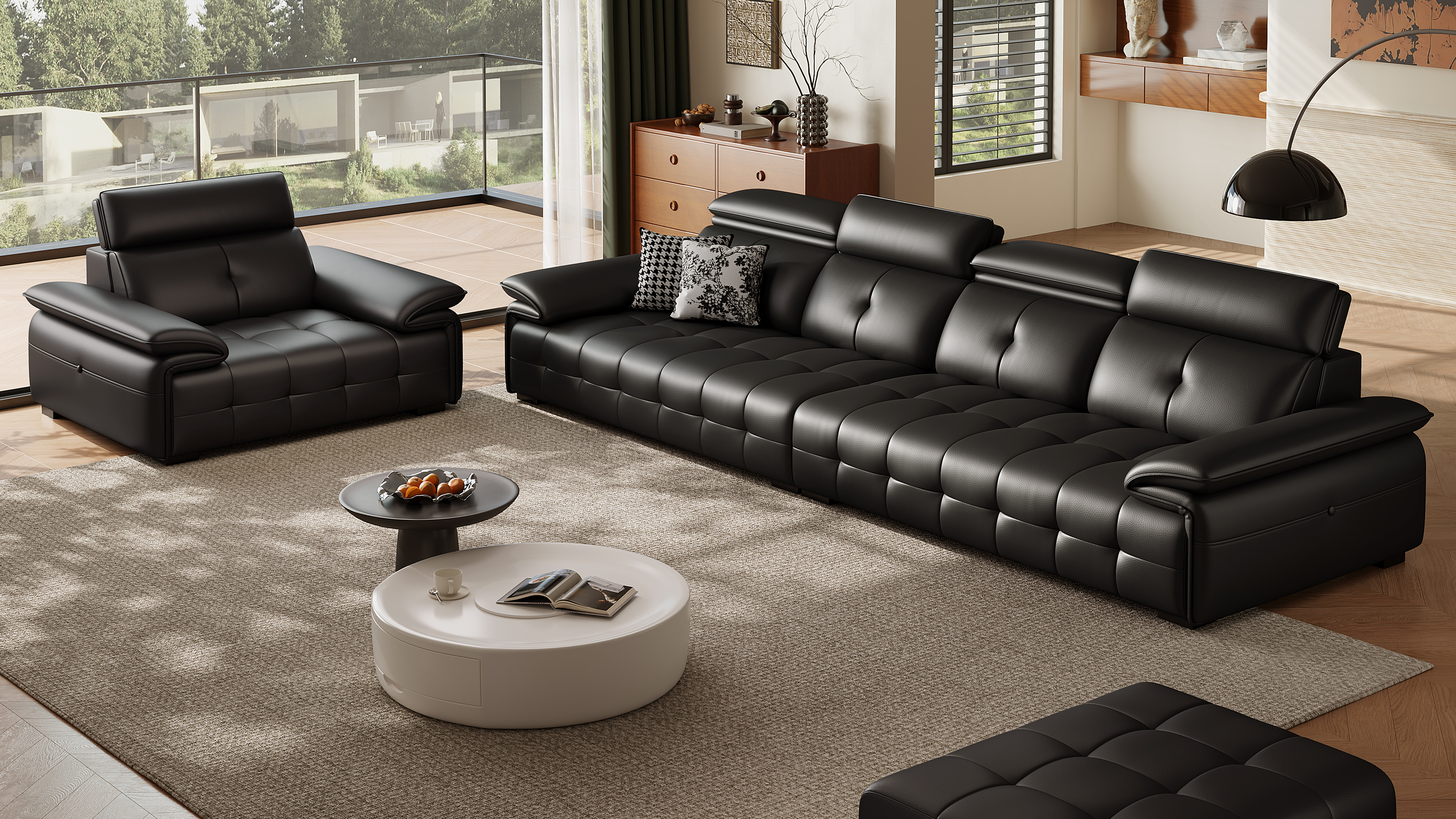 To meet the growing demand for space efficiency in urban living, the D033 ingeniously integrates two detachable leather ottomans into its side structure. When guests arrive, the ottomans offer additional seating without occupying extra space; when not in use, they tuck neatly into the sofa body, revealing a concealed storage compartment. This thoughtful integration allows users to store books, magazines, or living essentials with ease—keeping the space tidy while preserving the sofa’s clean, minimalist aesthetics. Unlike conventional modular add-ons, D033’s storage system is seamlessly built-in, achieving both practicality and design unity.