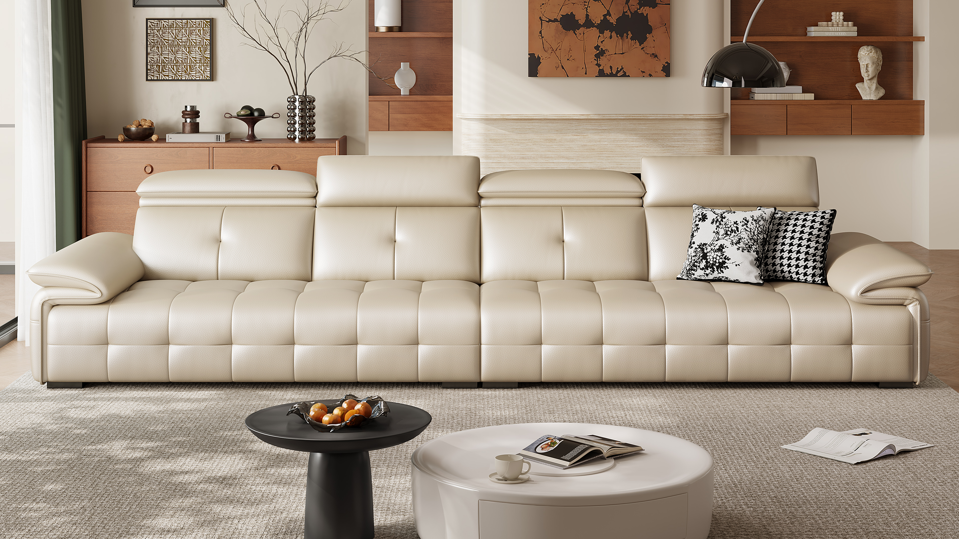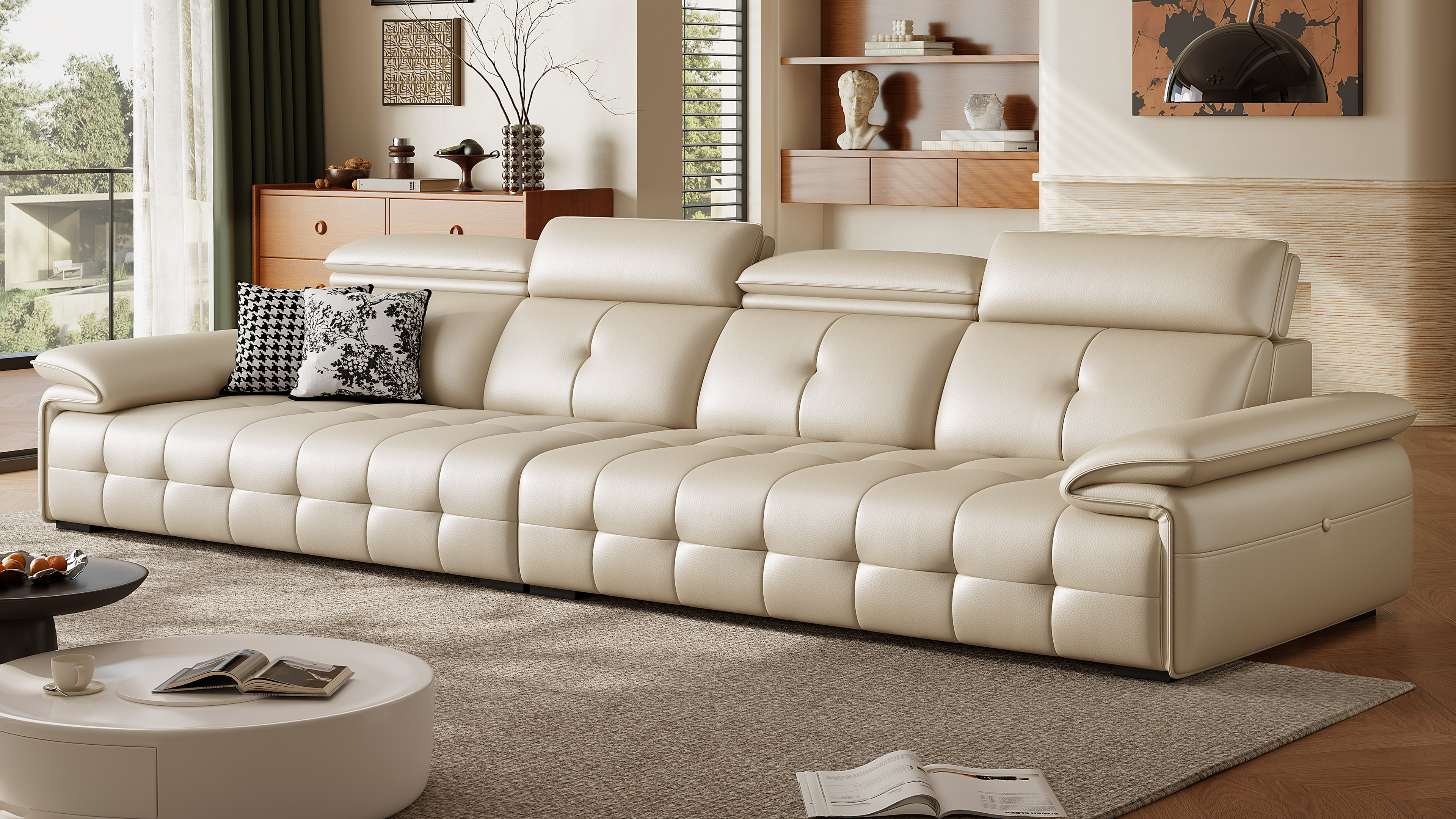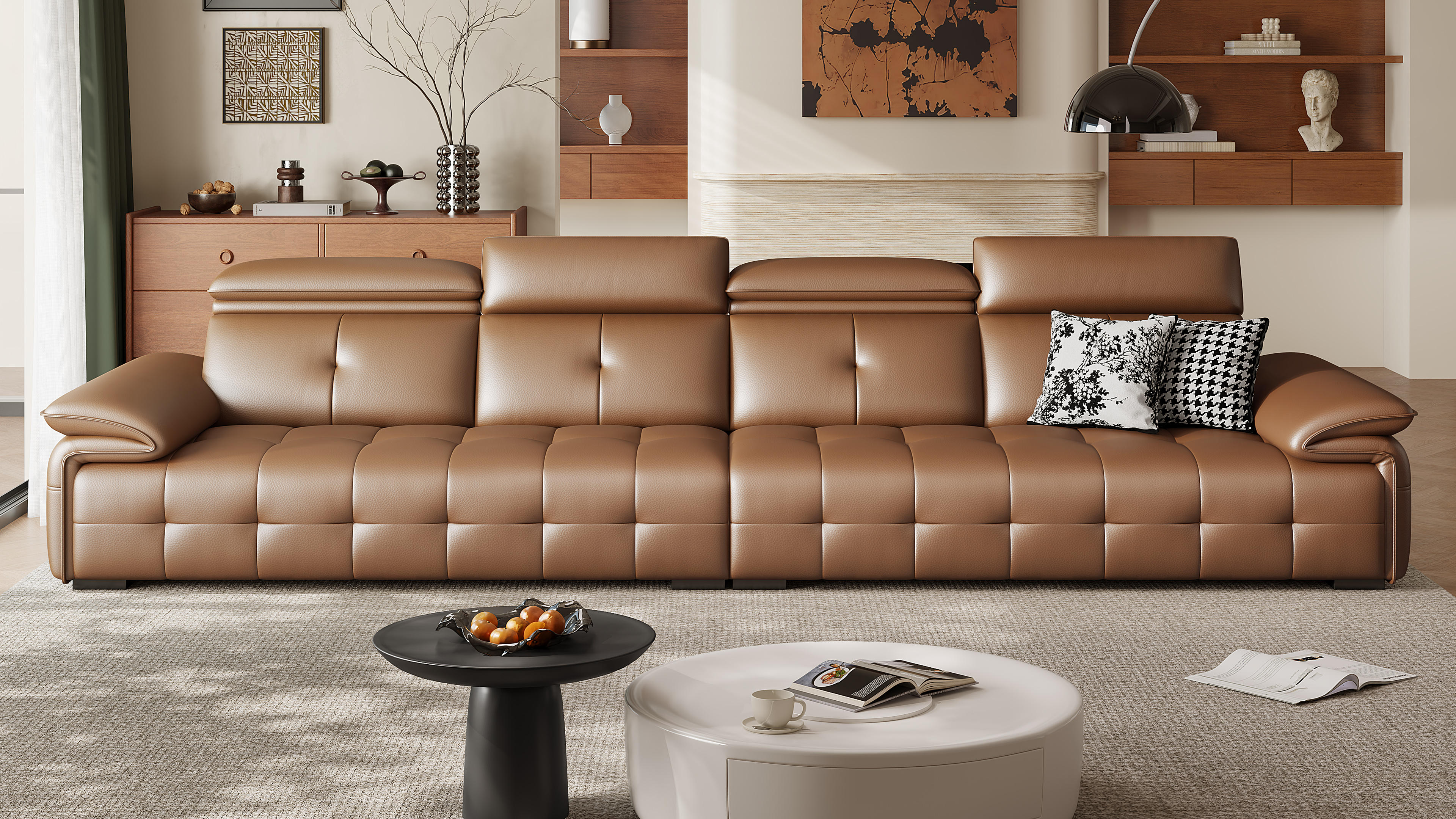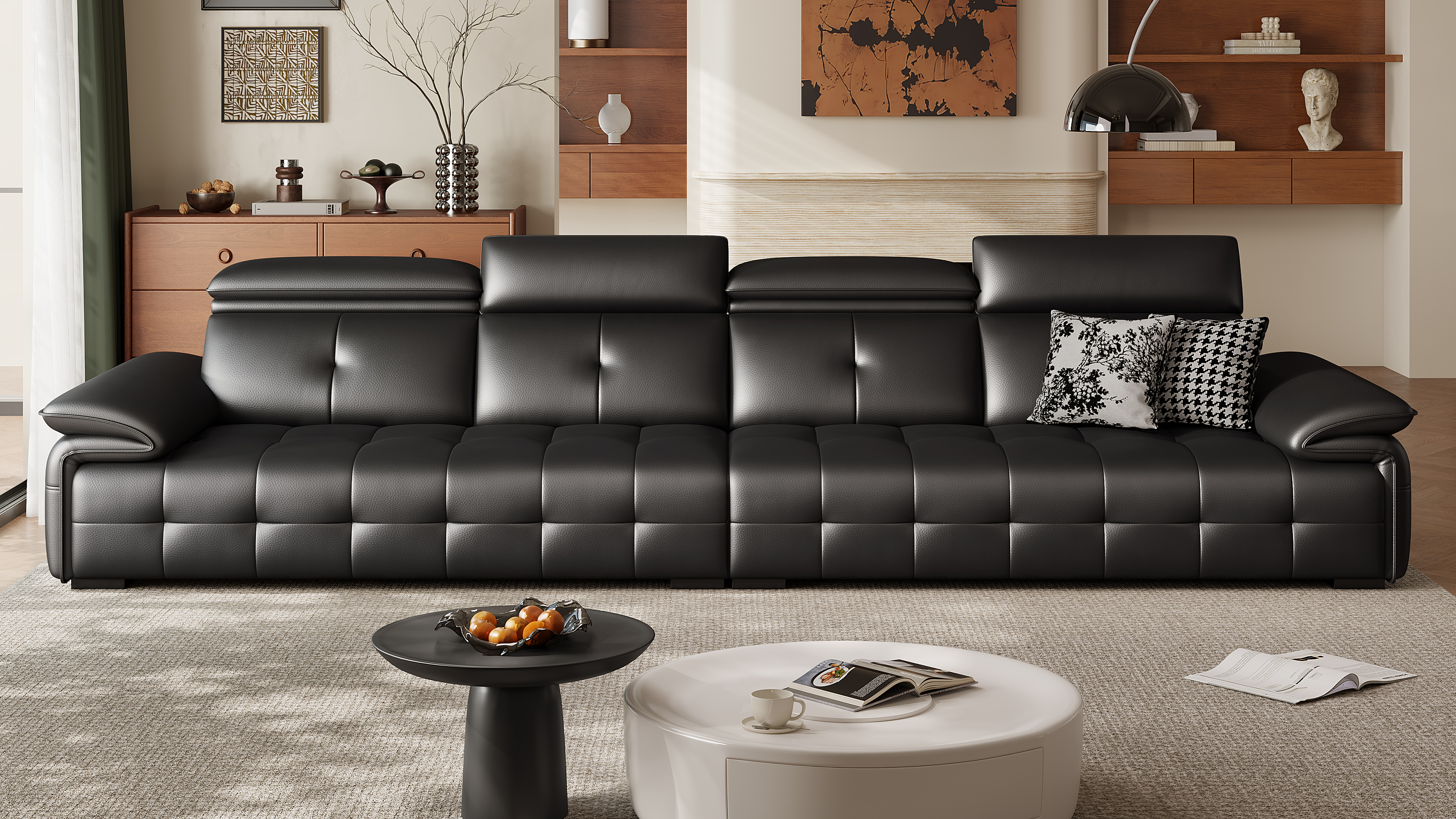 To meet the growing demand for space efficiency in urban living, the D033 ingeniously integrates two detachable leather ottomans into its side structure. When guests arrive, the ottomans offer additional seating without occupying extra space; when not in use, they tuck neatly into the sofa body, revealing a concealed storage compartment. This thoughtful integration allows users to store books, magazines, or living essentials with ease—keeping the space tidy while preserving the sofa’s clean, minimalist aesthetics. Unlike conventional modular add-ons, D033’s storage system is seamlessly built-in, achieving both practicality and design unity.