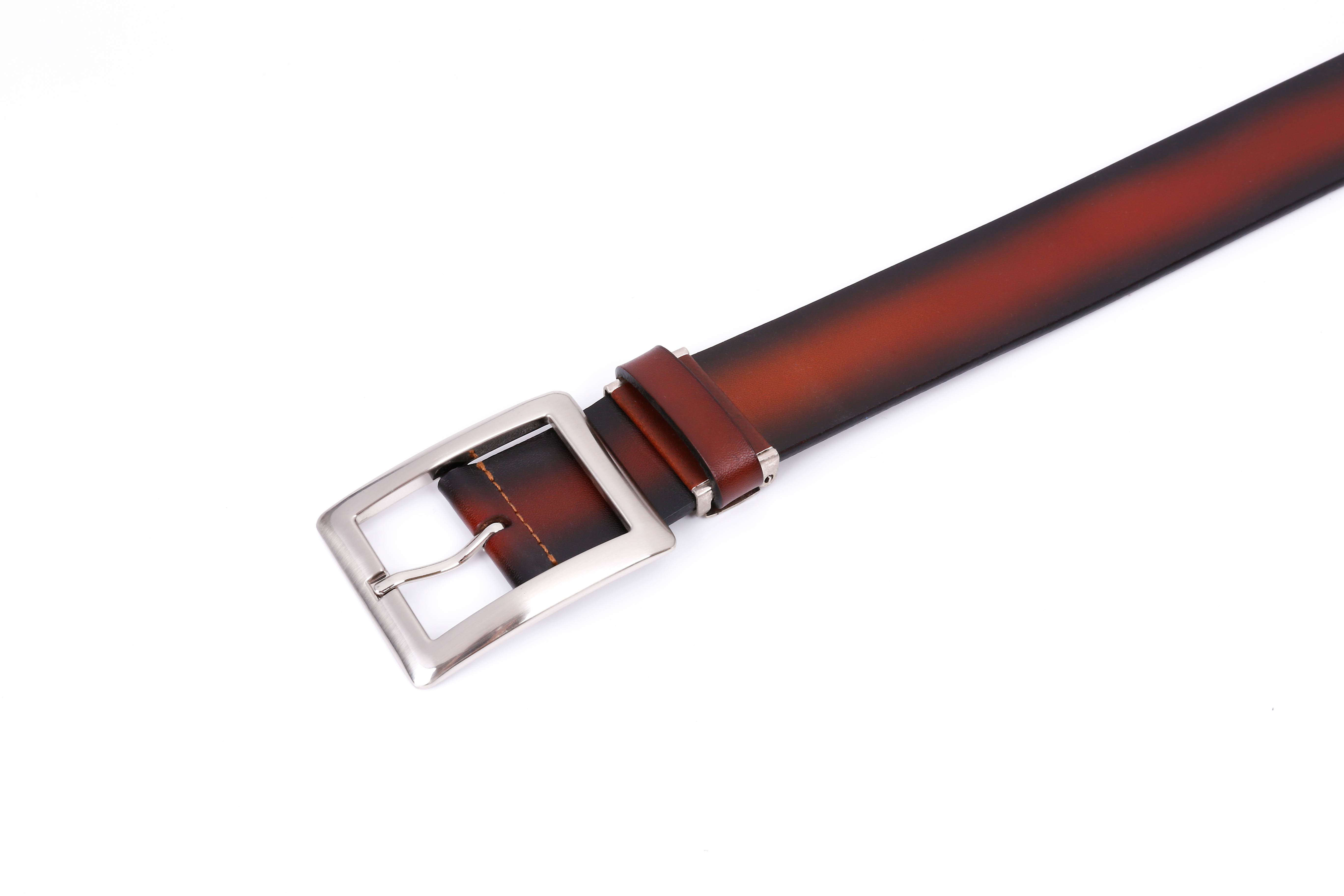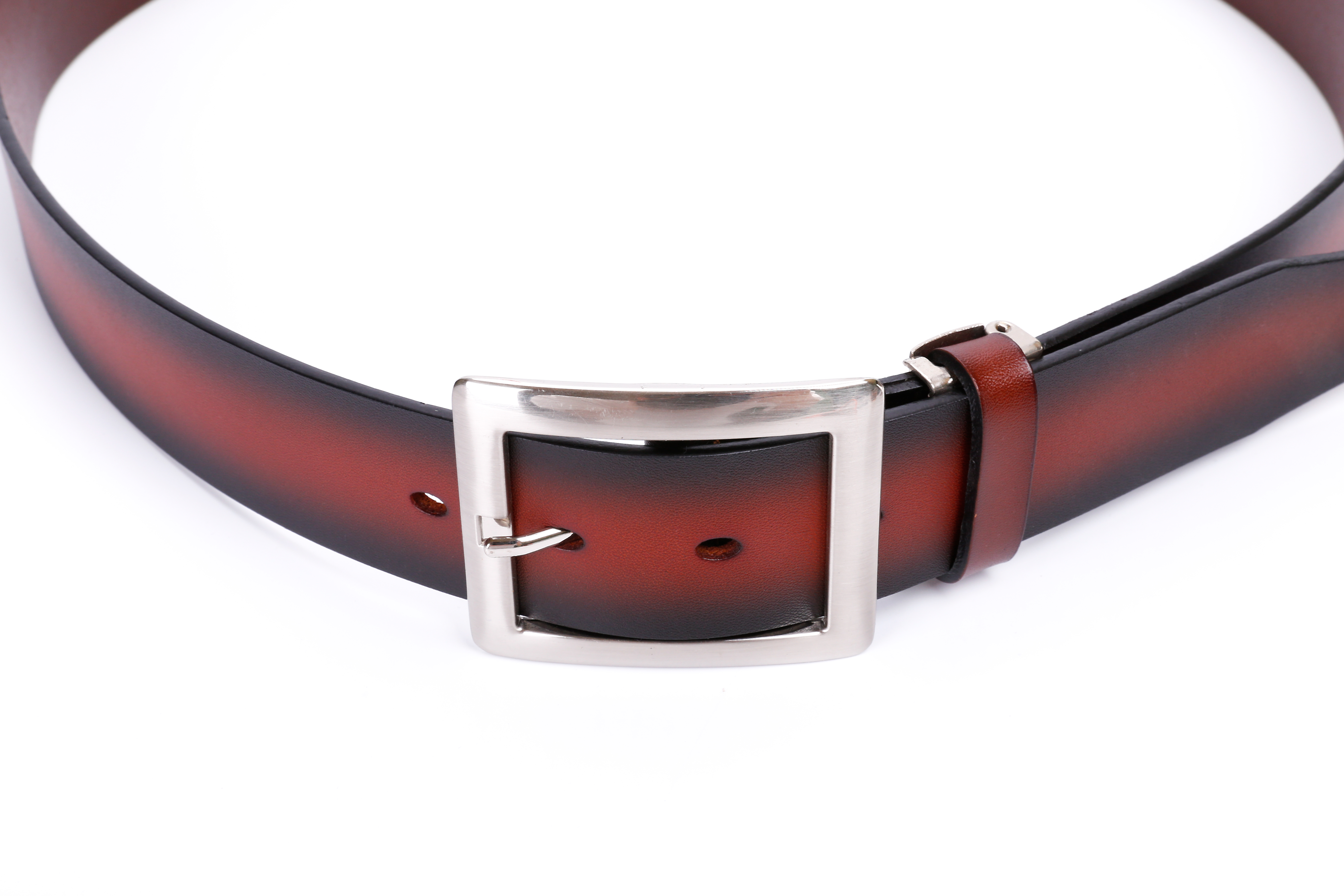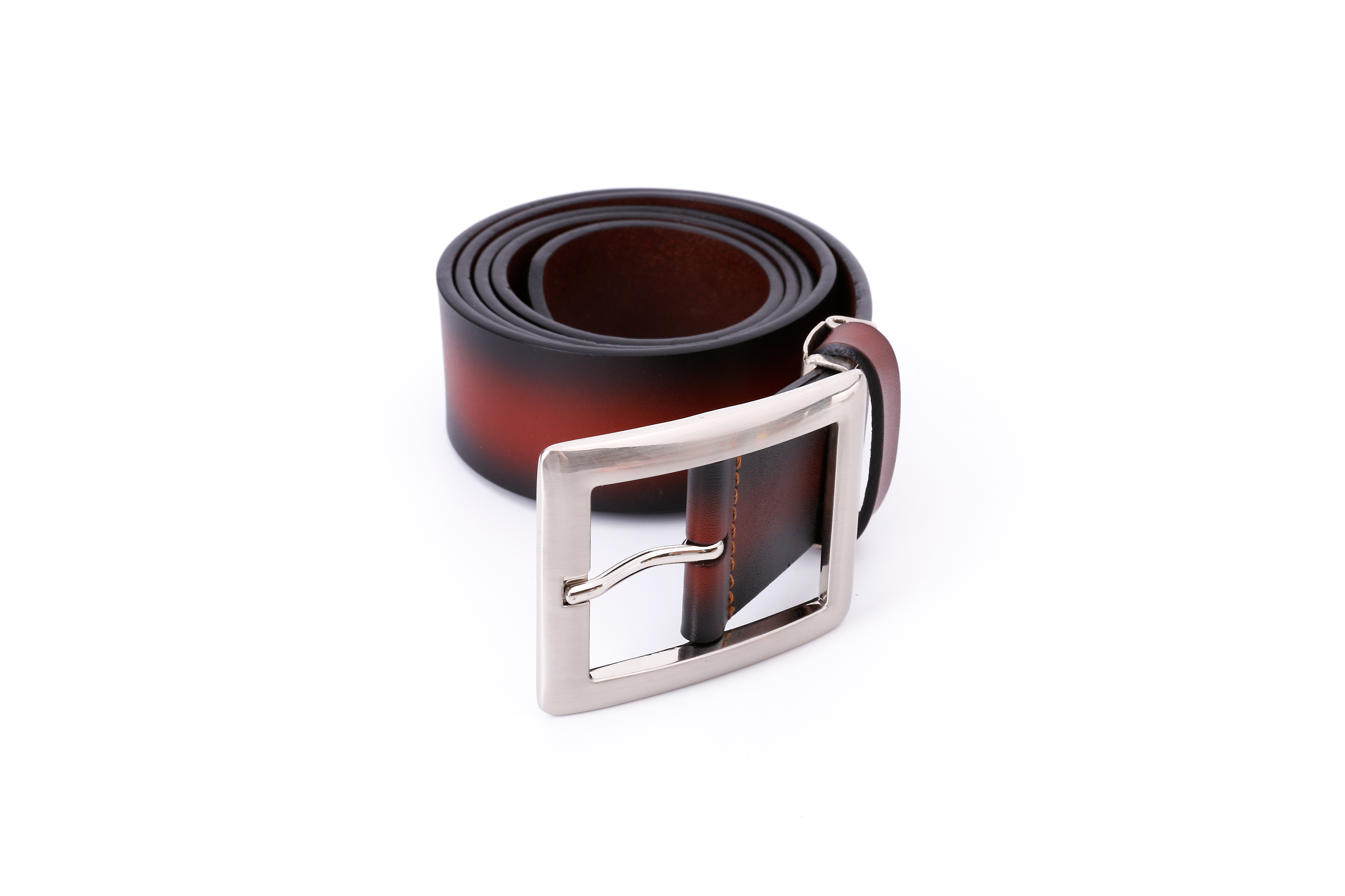 This men’s belt is crafted from premium full-grain leather, known for its exceptional strength, durability, and natural texture. The surface retains the original grain of the hide, providing a soft yet firm feel and a rich, sophisticated appearance that improves with age. The leather has been carefully hand-finished with a gradient brown tone, giving it a distinctive depth of color that transitions smoothly from deep brown edges to a warm reddish center. This refined design makes it an ideal accessory for both business attire and casual wear.