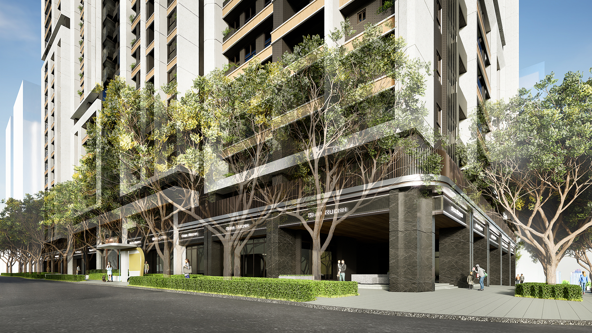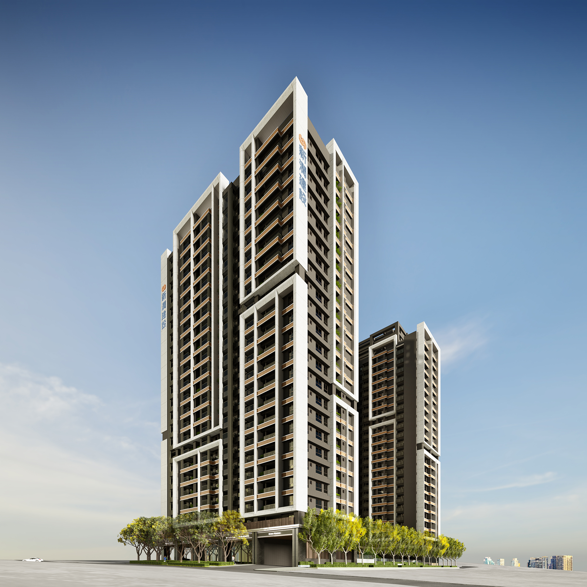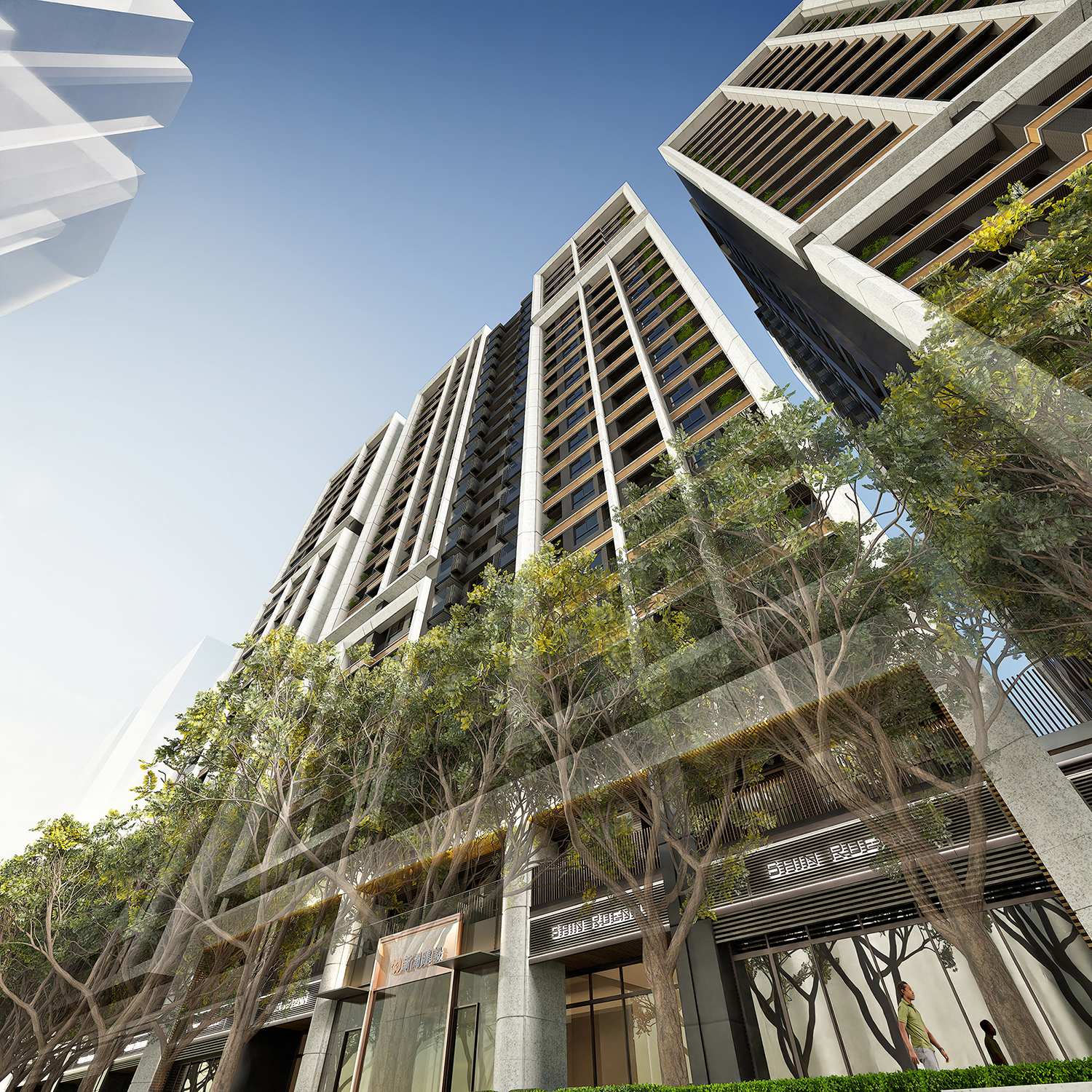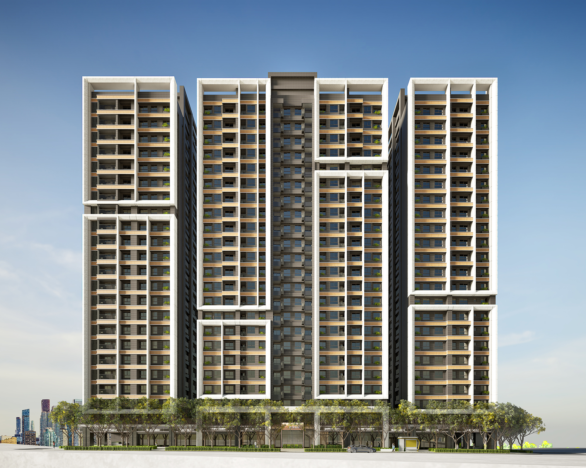 Moreover, the external facade design draws inspiration from successful vertical segmentation techniques seen in prominent international residential projects. This strategic simplification of the towers' mass effectively diminishes their imposing presence, allowing them to blend harmoniously into the skyline. Featuring clean lines, natural stone, and warm-toned metals, the facade artfully interacts with light and shadow, creating a visually striking and layered effect. At the street level, the emphasis shifts toward transparency and connectivity. With inviting transparent facades and lush greenery, the design cultivates a pedestrian-friendly environment that encourages positive interactions between the development and its surrounding neighborhoods. This thoughtful approach not only enhances the aesthetic appeal but also promotes a vibrant community atmosphere.