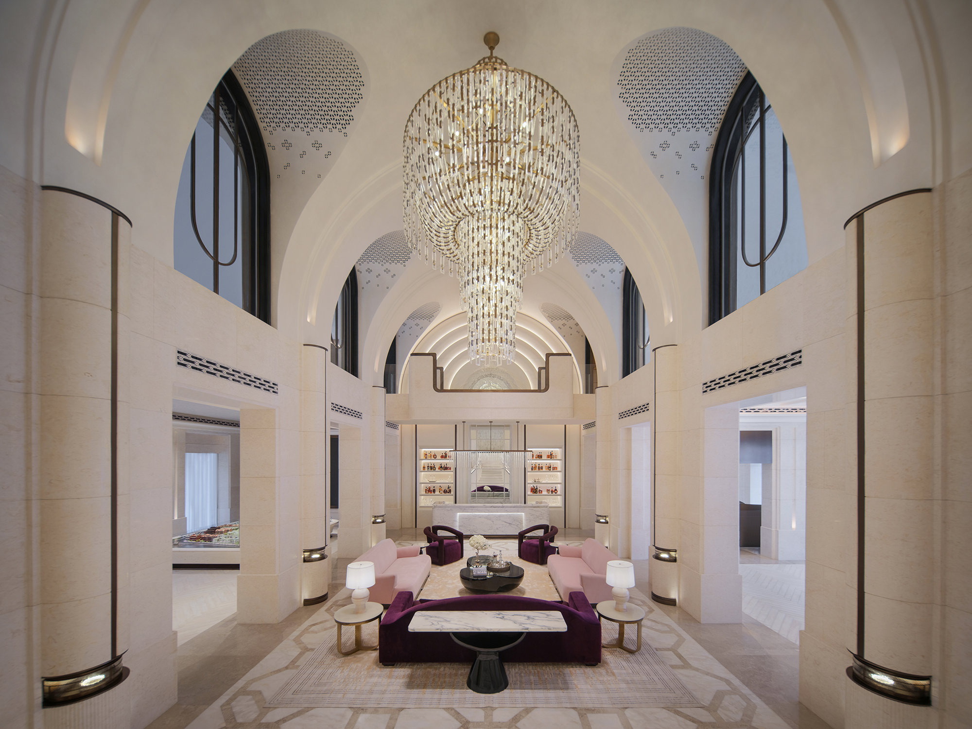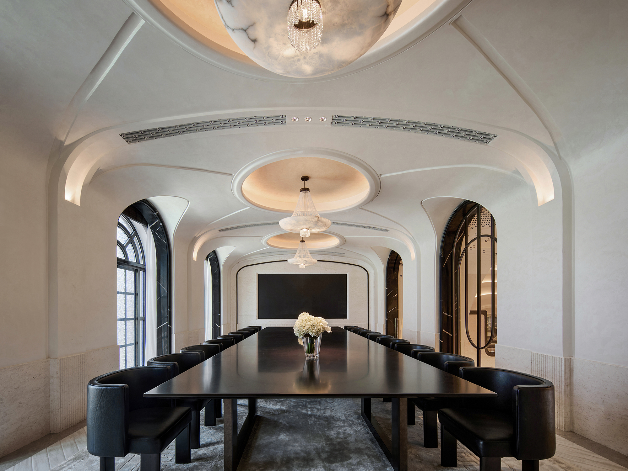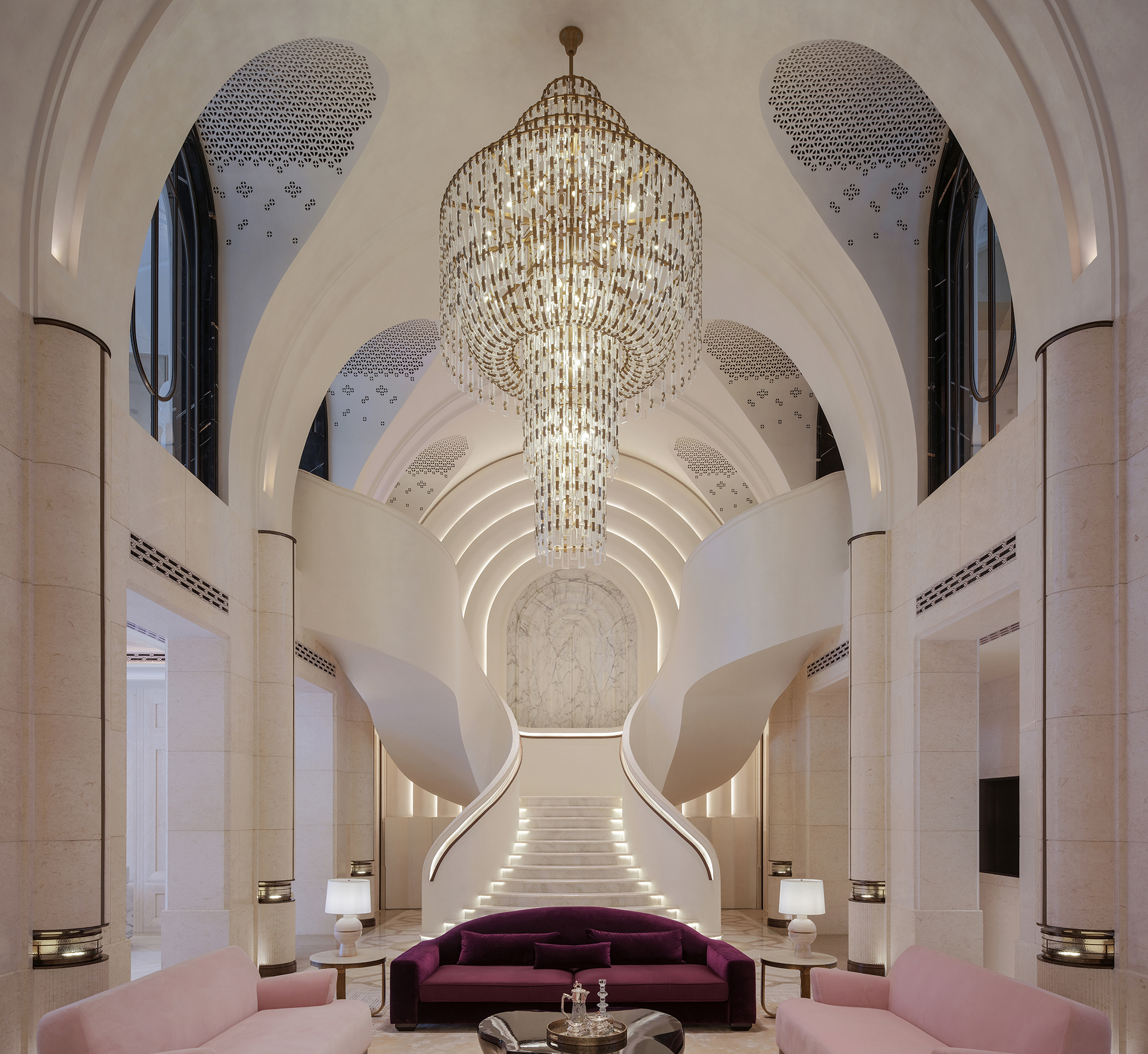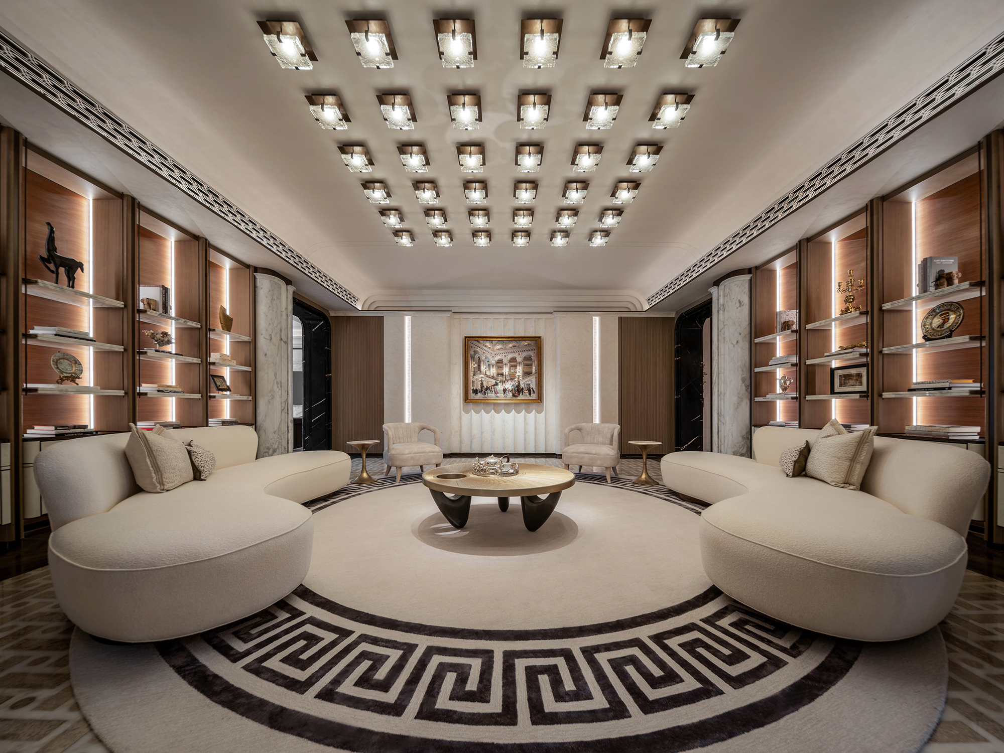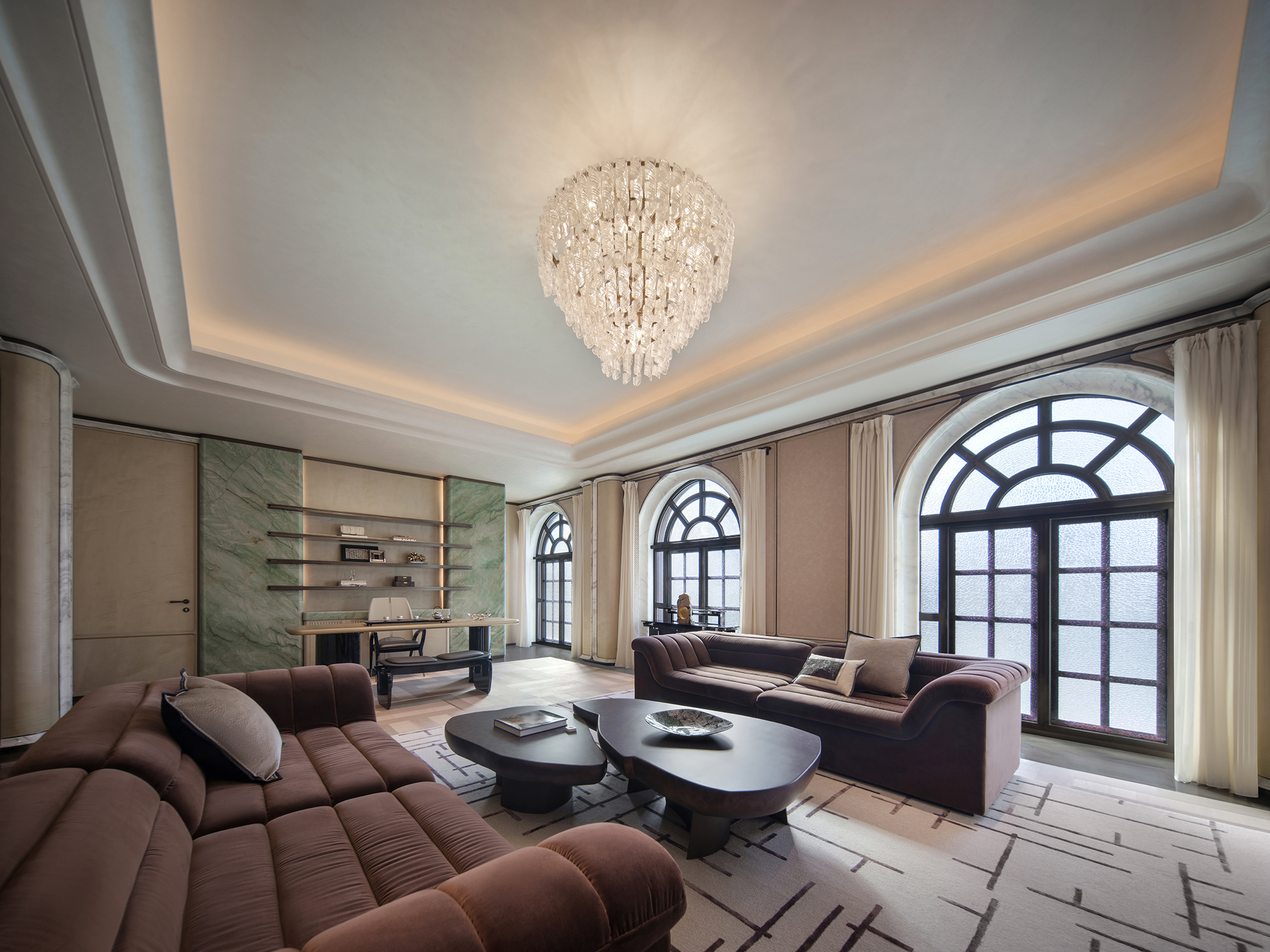 The design constructs spatial depth through Art Deco-inspired stone inlays, unfolding an environmental opera of proportion and light. On the ground floor, the reception foyer and lobby unfold in ivory stone textures, intricately woven with metallic trim and suspended crystal chandeliers that articulate a sense of stately grandeur. The facades employ symmetry as compositional language, where metal fixtures and stone surfaces echo one another in luminous dialogue. Sight lines ascend along the curved staircase in graceful arcs, allowing curves and crystalline radiance to compose into a living tableau. Meanwhile, the ceiling integrates property’s logo motifs, translating corporate identity into spatial vernacular. The flooring features cobblestone paving, its dimensional texture narrating the historical imprint of trading houses and merchant guilds. In the elevator hall, vintage floor indicators illuminate cultural warmth through considered detail.