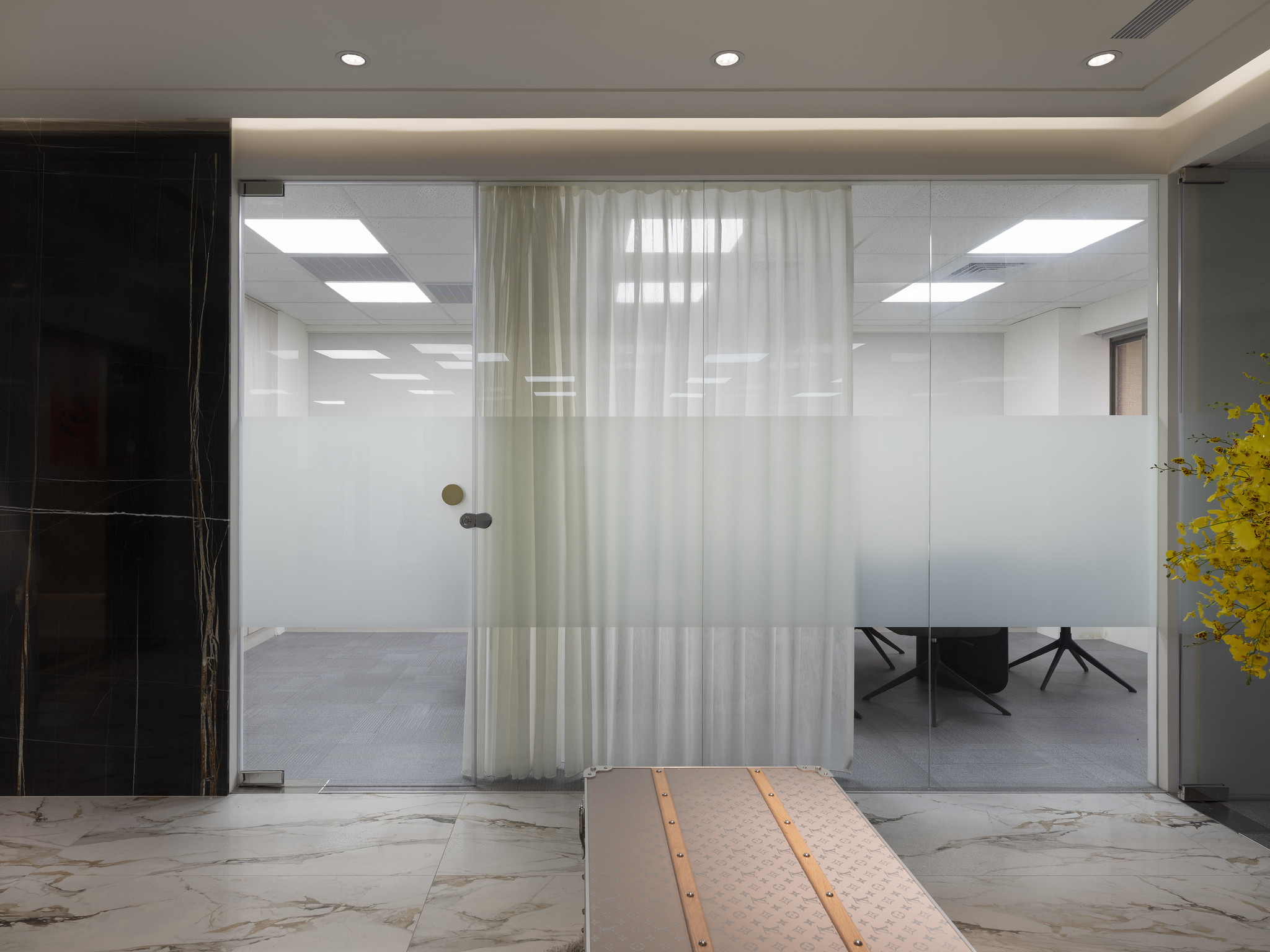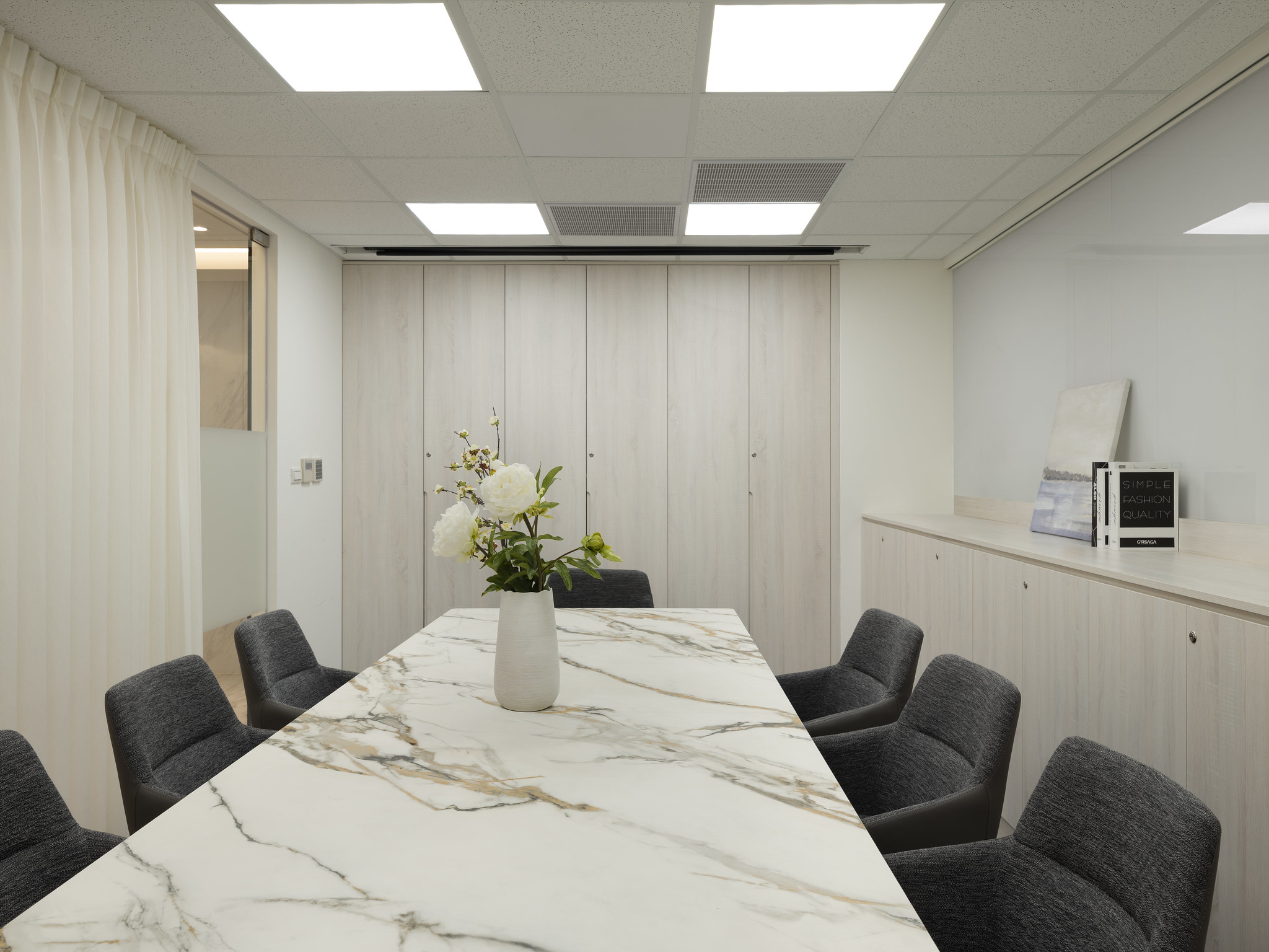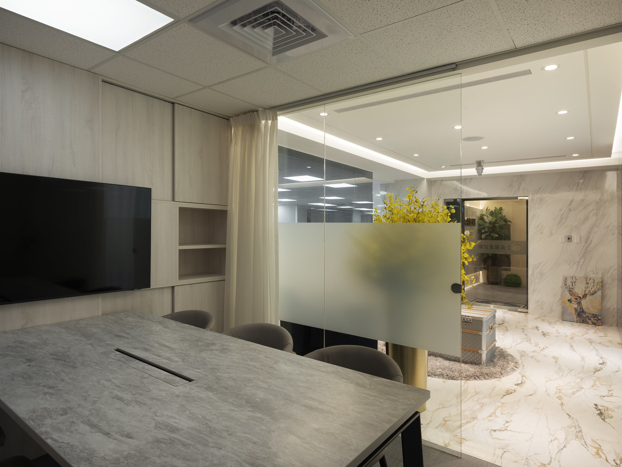The company primarily handles large and complex business operations such as securities market-related matters and corporate meetings. It was crucial that the client perceive a professional and elegant image from the very first glance. As this was a renovation of an old office and required the addition of restrooms, the designer's expertise and aesthetic sense were showcased in how to simultaneously ensure the integrity and safety of the basic infrastructure while creating an elegant and spacious environment.