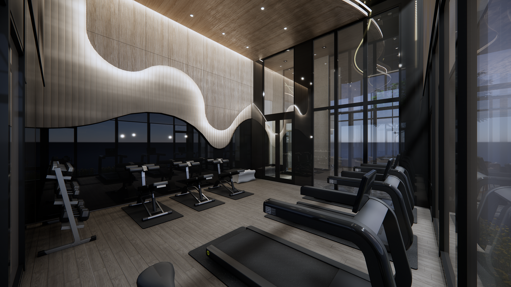 Moreover, the children’s play area bursts with vibrant yellows and greens, creating an engaging atmosphere that encourages play and creativity. In contrast, the gym employs a striking black and white color palette, accentuated by wavy light strips that introduce layers of rhythmic movement, promoting both focus and dynamism. Additionally, the design beautifully interprets the imagery of flowing water, transforming it into gentle, curved forms that infuse the environment with vibrant energy. This results in a serene yet life-affirming setting, where every element is purposefully curated to enhance the overall experience of well-being and connection to nature.