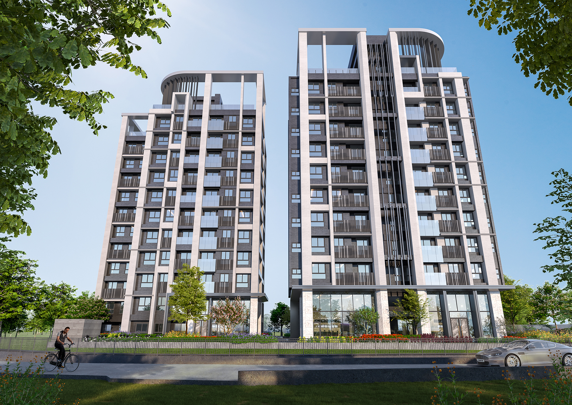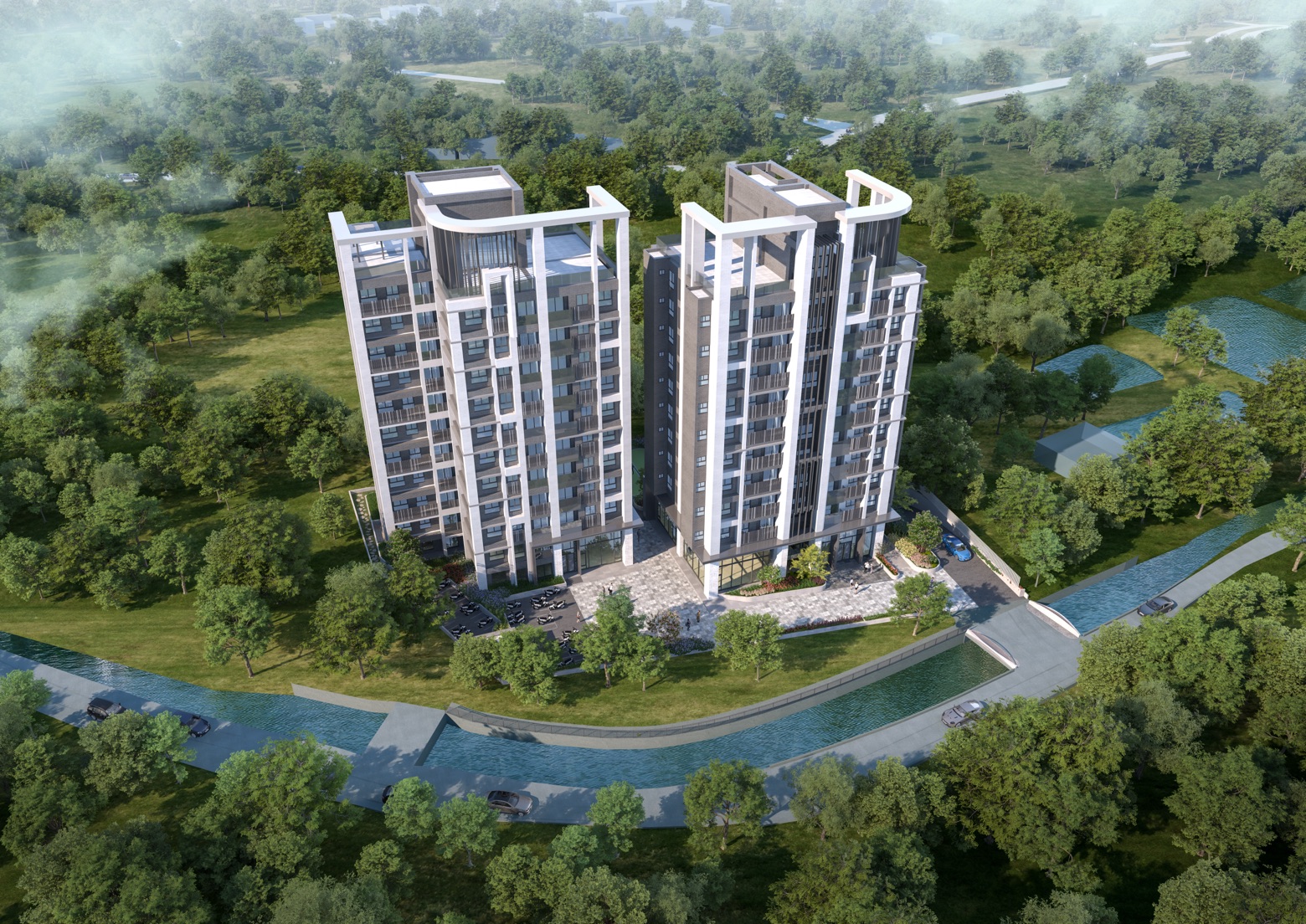 The architecture features two elegantly interlocking towers, gracefully rising beside a picturesque mountain stream. This harmonious blend of majestic mountain vistas and the gentle charm of flowing water cultivates a serene atmosphere that deeply resonates with the surrounding natural landscape. The design thoughtfully employs understated materials and a soft color palette, which allows the architectural expression to seamlessly integrate with the environment, evoking a profound sense of warmth and nostalgia akin to returning home. Moreover, the communal spaces are crafted with a human-centered approach, where warm wood tones and pure white accents intricately interplay, harmonized by deeper, richer hues. This delicate balance of light and color weaves a rich tapestry of rhythms and aesthetic beauty.