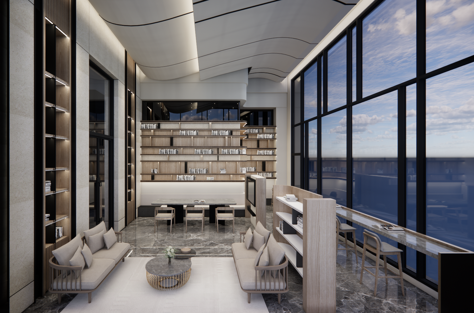 The atrium and open balconies graciously invite an abundance of light and fresh air, seamlessly blending indoor and outdoor elements to create a harmonious environment for daily living. To enhance this experience, the design team thoughtfully planned transparent circulation paths that deepen visual connections, cultivating a comfortable and inviting atmosphere that honors the original intention of harmonizing people with their surroundings. As one steps inside, the design language unfolds in a captivating manner: facades, ceilings, and light strips all exhibit elegant, streamlined forms that weave a dynamic rhythm through their intersecting lines. In the reading nook, a rich blend of wood and stone creates a warm refuge where sunlight cascades through expansive floor-to-ceiling windows, melding the scent of books with breathtaking views that evoke a living painting.