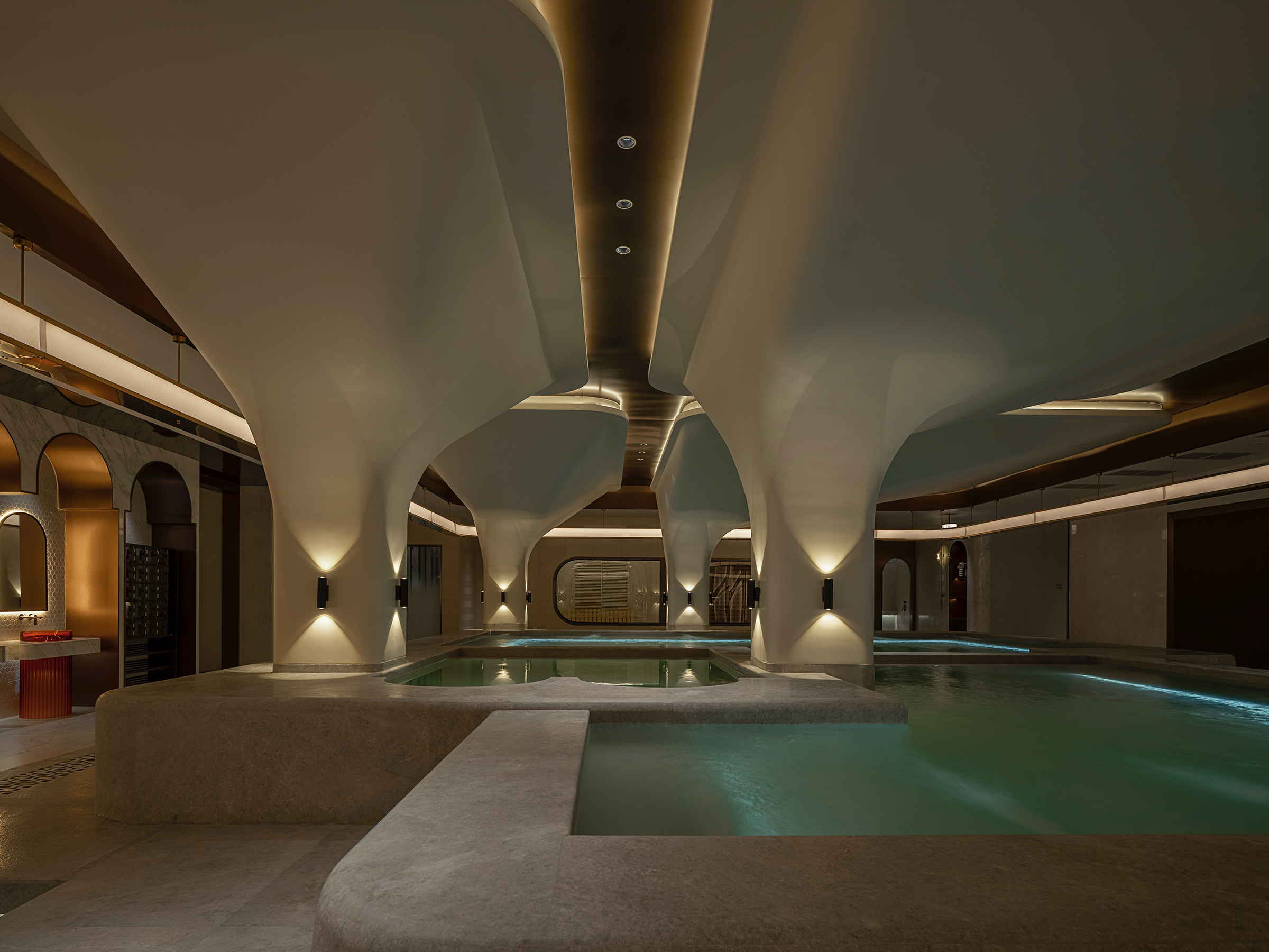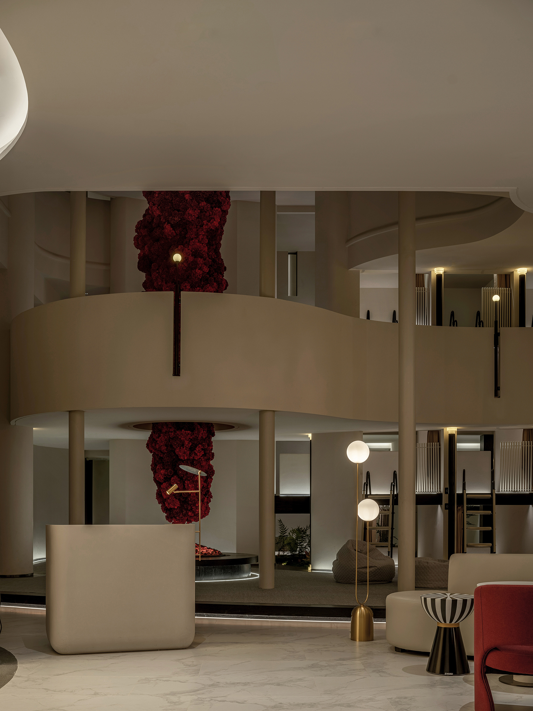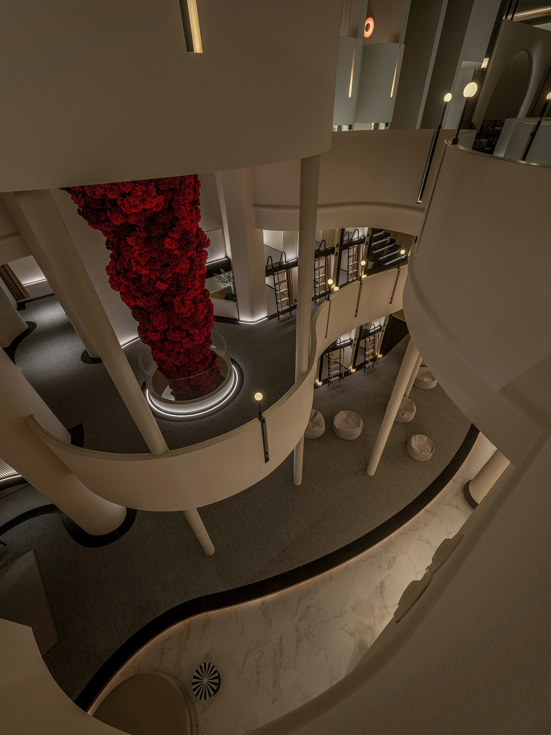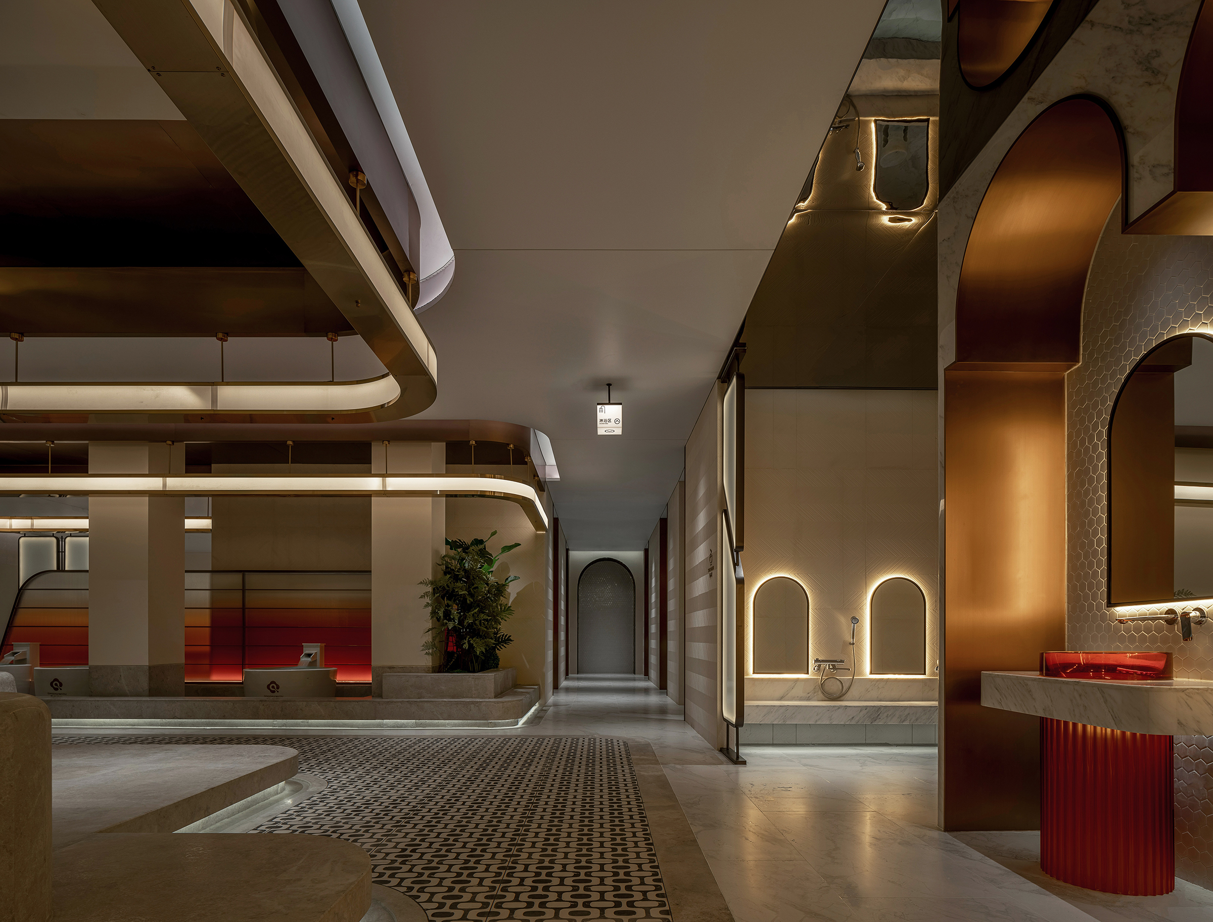 Located in the coastal city of Dalian, this collaborative design adopts a relaxed and poetic architectural language to create the "Qingshui Tile Terrace"—a space that captures the rhythm of life through immersive and artistic spatial narratives. The lobby serves as both a functional service center and a symbolic stage for a journey into flowing water and time. A long fireplace echoes the surrounding water, balancing fire and water elements to evoke imagination and emotion. The entire space unfolds like a grand drama. Concrete shapes and fluid forms encourage interaction, while detailed decorative elements evoke a dreamlike atmosphere. Gradient sunset hues light the space, casting reflections on walls and floors, and enhancing material transitions from stone to ground. Light, shadow, and time flow freely, creating emotional resonance and spatial rhythm. Curved amber metal structures, mosaic backdrops, and glowing light strips amplify the visual drama. The collision of red and white tones—calm yet vibrant—guides visitors through a narrative of light and movement. A white spiral staircase and the “Rose Waterfall” installation form the dramatic centerpiece known as the RoseWhitePagoda, highlighting the poetic depth of the curved space. Functional needs are seamlessly integrated: reading areas, sunken lounges, e-sports zones, and modular grid rooms offer varied social and personal spaces. Curved lines carve out semi-private zones, while a semi-outdoor sofa area, connected by a landscape window, extends the interaction with nature. Wooden partitions divide space with elegance, casting soft shadows that dance with plant decorations and natural light. The private hot spring area embraces organic curves and a white palette to create a pure, peaceful, and dreamlike environment. Inspired by water’s shape and flow, the design blends modern techniques with a futuristic touch to express a low-key yet emotionally rich lifestyle. The Qingshui Tile Terrace becomes a sanctuary where structure, light, and imagination merge into an unforgettable spatial experience.