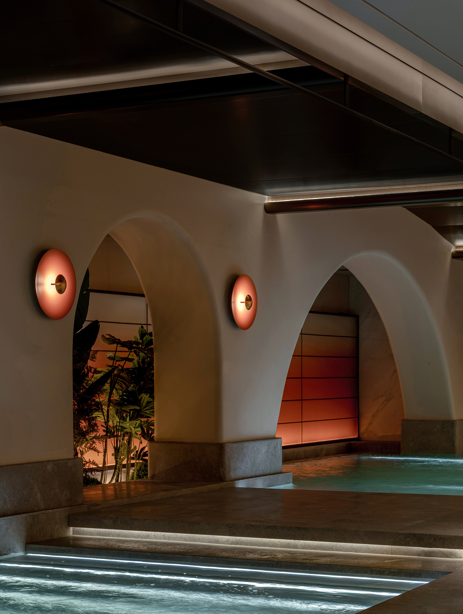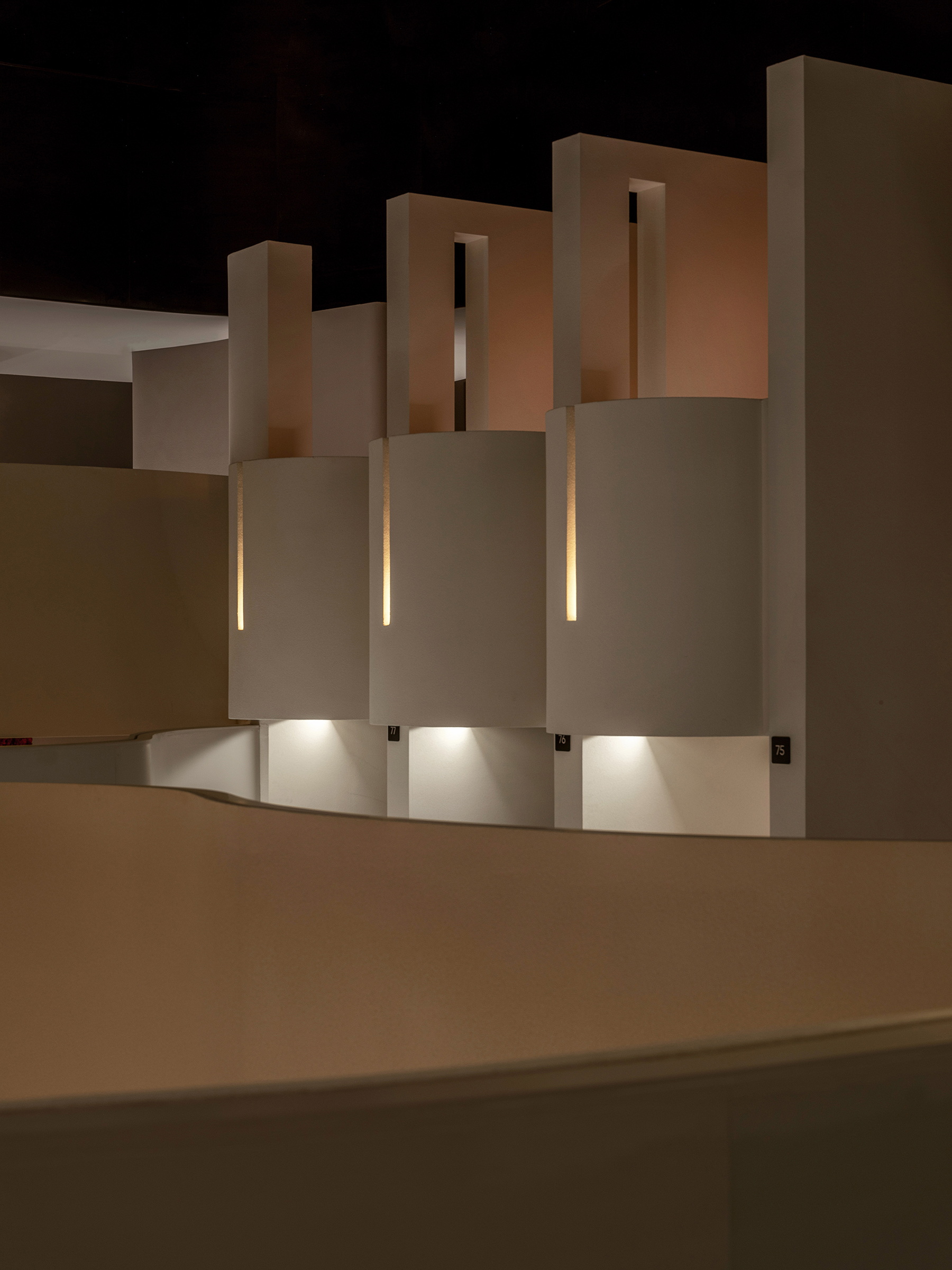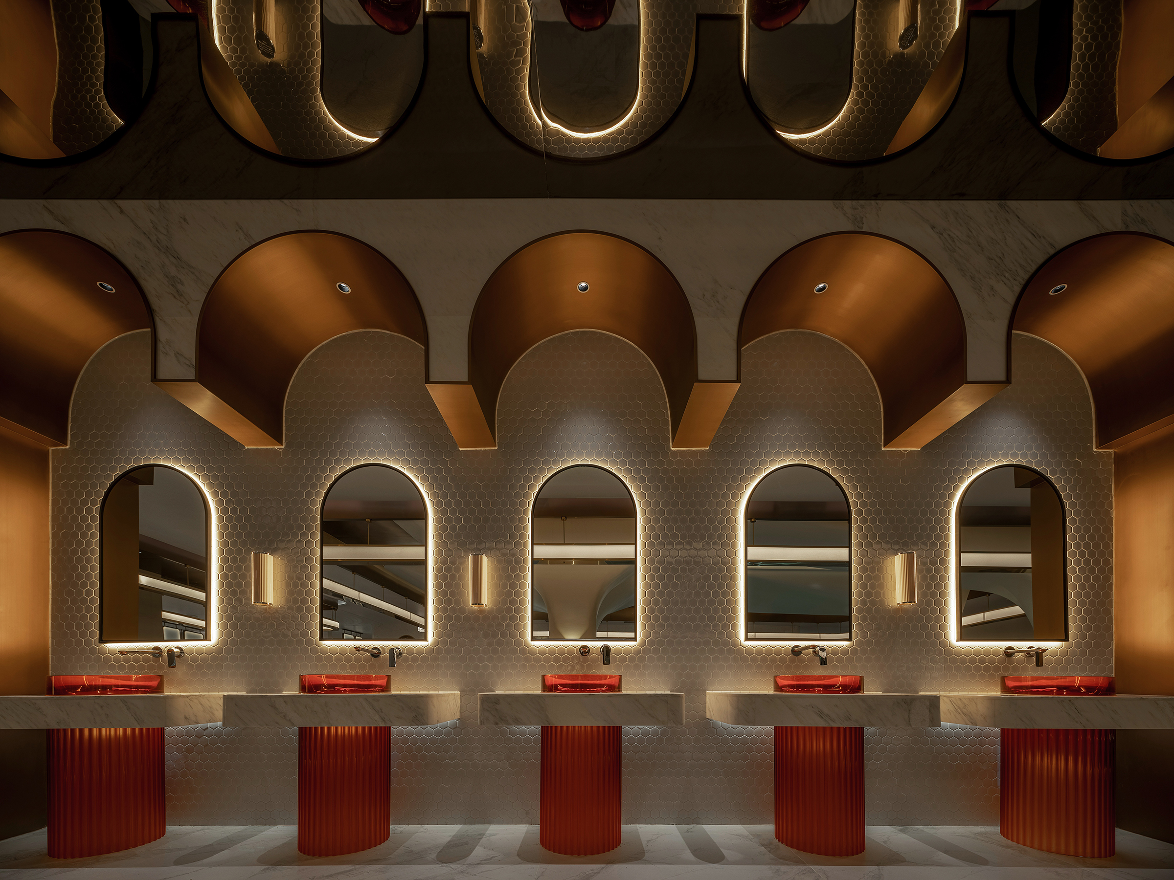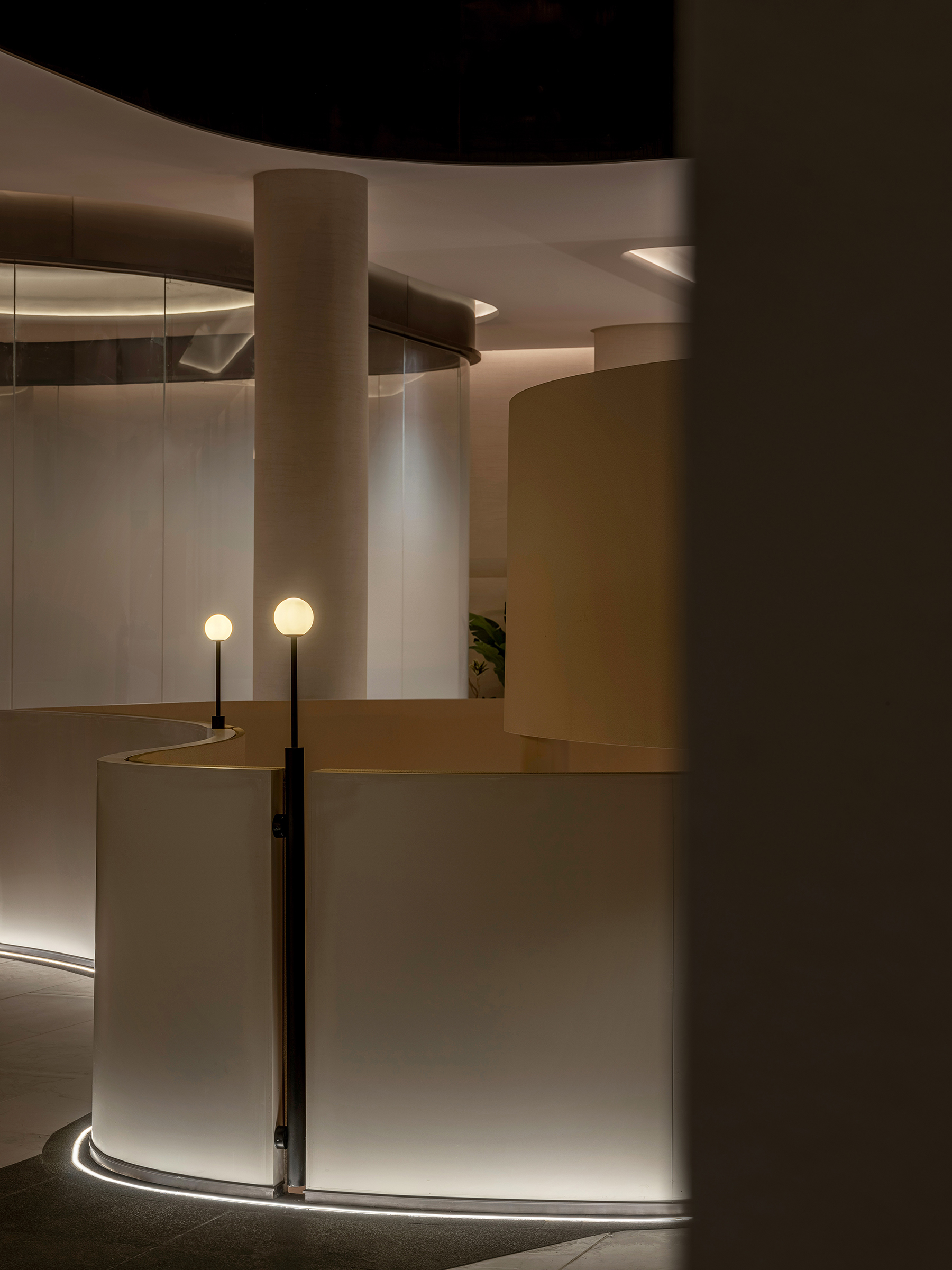 Located in the coastal city of Dalian, this collaborative design adopts a relaxed and poetic architectural language to create the "Qingshui Tile Terrace"—a space that captures the rhythm of life through immersive and artistic spatial narratives. The lobby serves as both a functional service center and a symbolic stage for a journey into flowing water and time. A long fireplace echoes the surrounding water, balancing fire and water elements to evoke imagination and emotion. The entire space unfolds like a grand drama. Concrete shapes and fluid forms encourage interaction, while detailed decorative elements evoke a dreamlike atmosphere. Gradient sunset hues light the space, casting reflections on walls and floors, and enhancing material transitions from stone to ground. Light, shadow, and time flow freely, creating emotional resonance and spatial rhythm. Curved amber metal structures, mosaic backdrops, and glowing light strips amplify the visual drama. The collision of red and white tones—calm yet vibrant—guides visitors through a narrative of light and movement. A white spiral staircase and the “Rose Waterfall” installation form the dramatic centerpiece known as the RoseWhitePagoda, highlighting the poetic depth of the curved space. Functional needs are seamlessly integrated: reading areas, sunken lounges, e-sports zones, and modular grid rooms offer varied social and personal spaces. Curved lines carve out semi-private zones, while a semi-outdoor sofa area, connected by a landscape window, extends the interaction with nature. Wooden partitions divide space with elegance, casting soft shadows that dance with plant decorations and natural light. The private hot spring area embraces organic curves and a white palette to create a pure, peaceful, and dreamlike environment. Inspired by water’s shape and flow, the design blends modern techniques with a futuristic touch to express a low-key yet emotionally rich lifestyle. The Qingshui Tile Terrace becomes a sanctuary where structure, light, and imagination merge into an unforgettable spatial experience.
