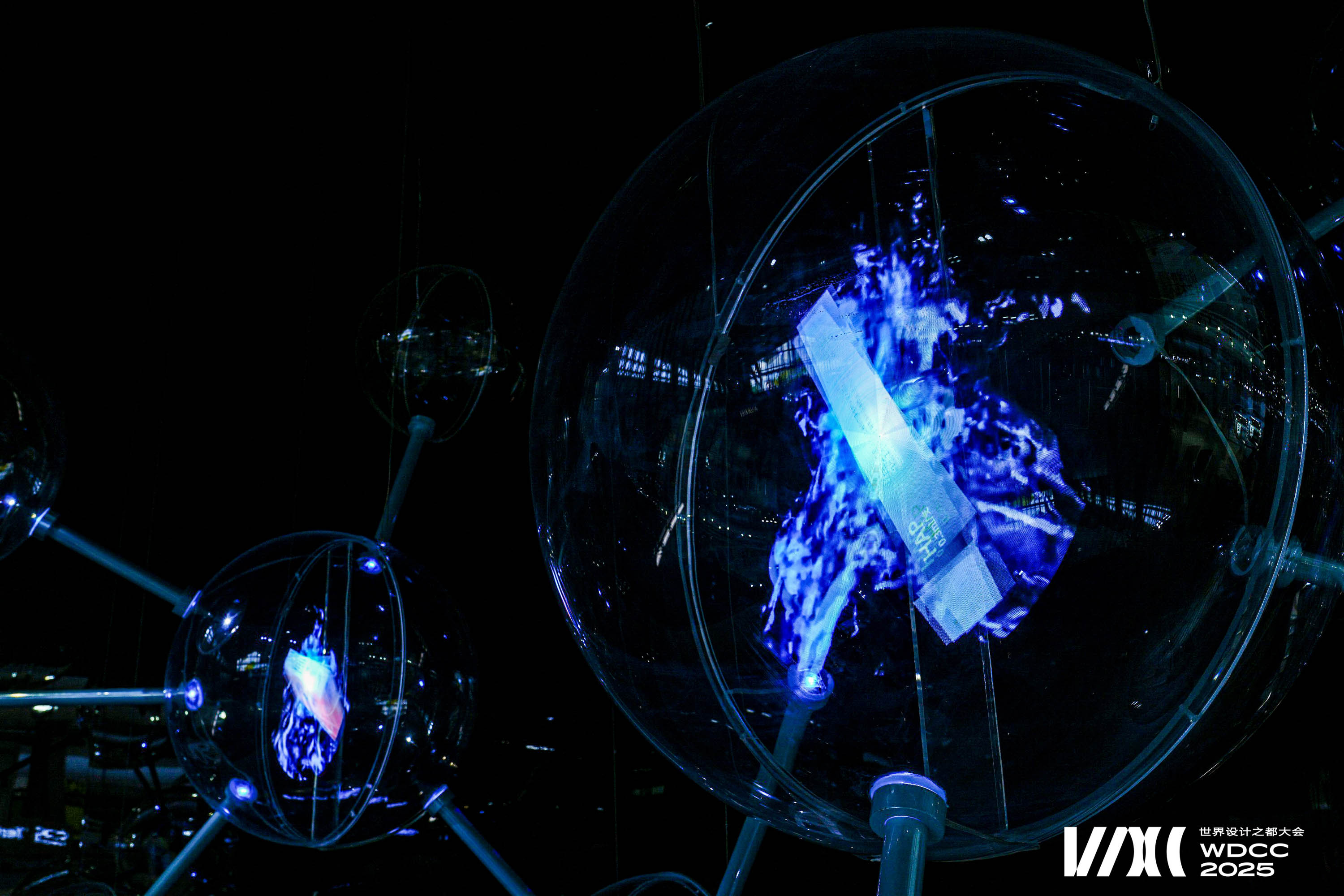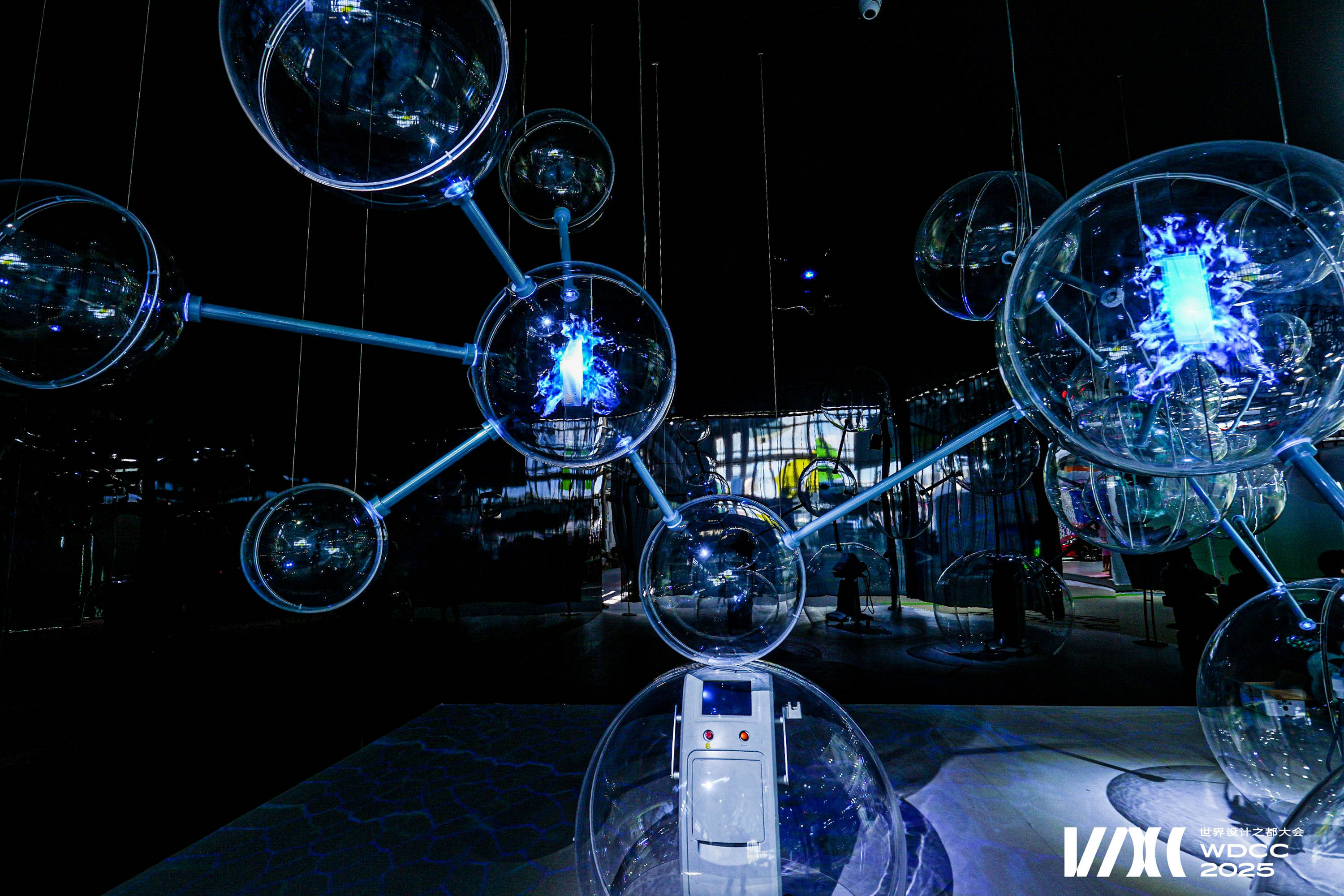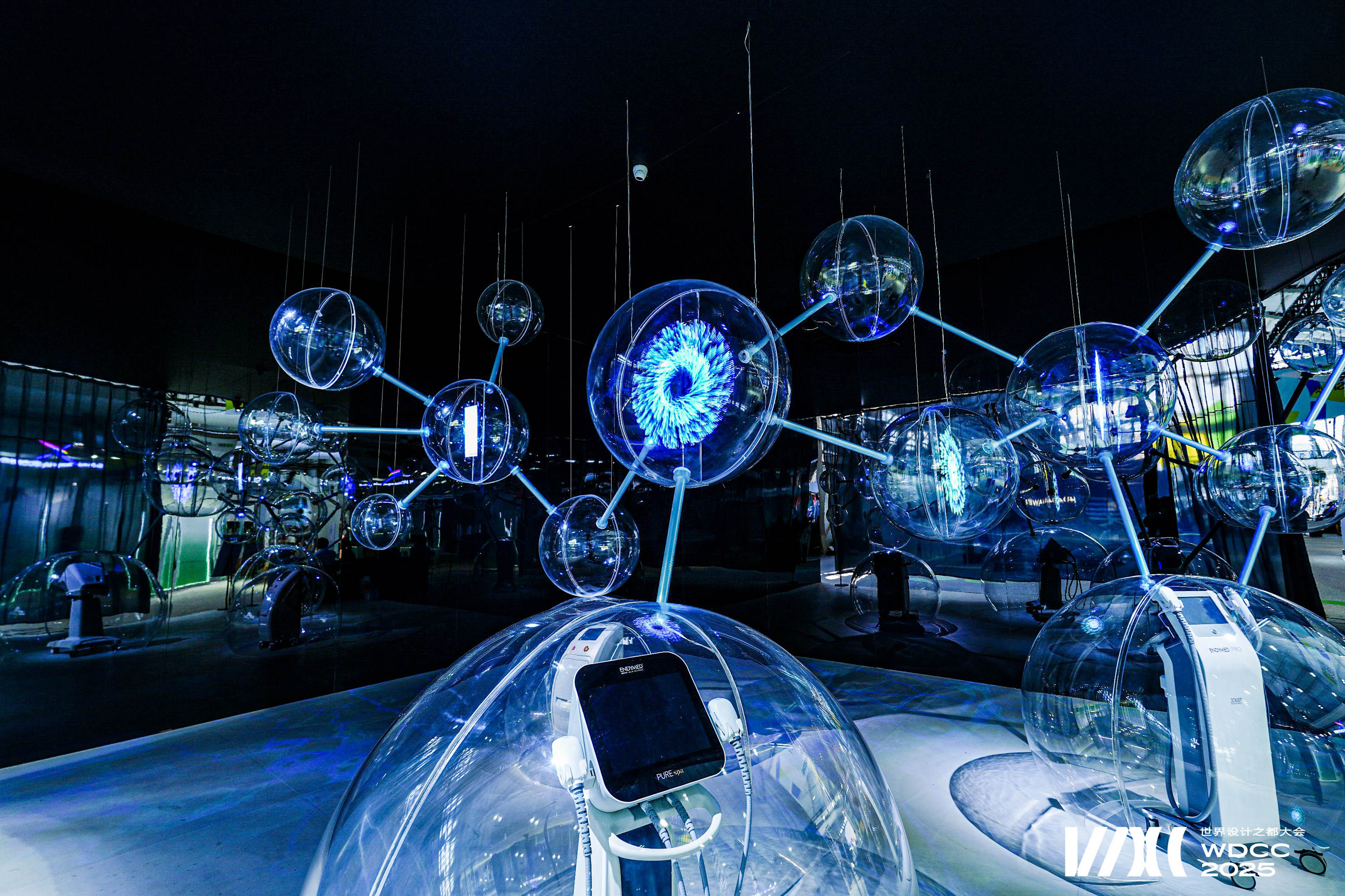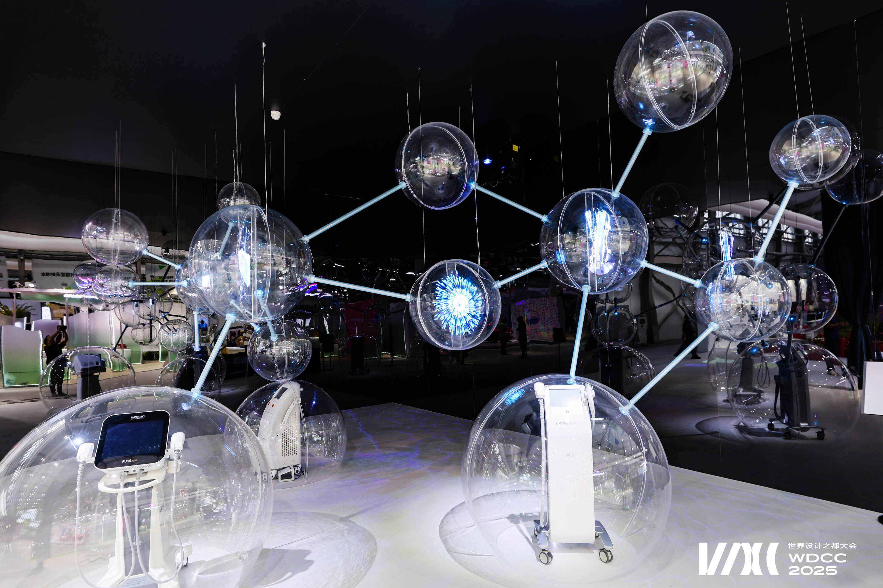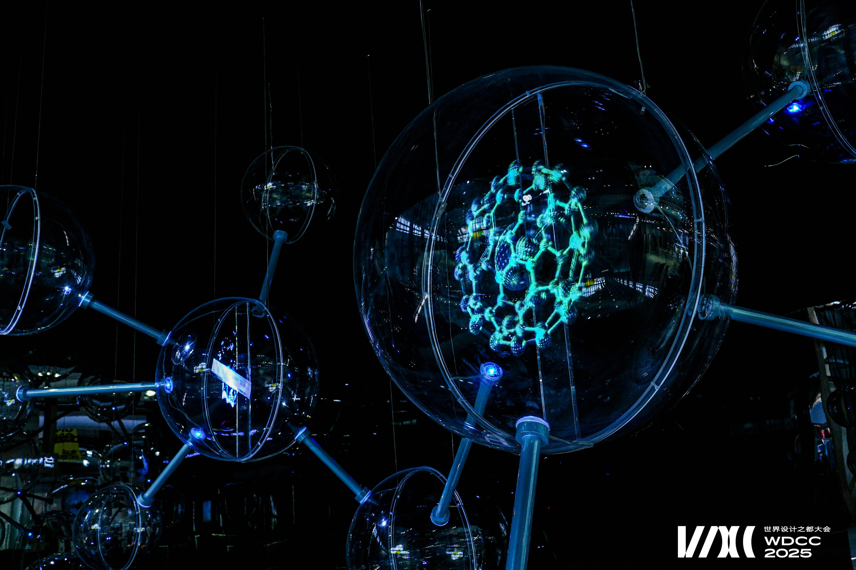 The work draws inspiration from (Big Dumb Object) BDO aesthetics and the molecular structure of cells. Sixteen transparent spheres, connected by metal rods, form a “cell network,” symbolizing the flow and resonance of life energy. At the base, three semi-circular spheres showcase the company’s three core devices in physical form, highlighting the company’s technological capabilities. In the middle section, four spheres employ holographic projections to vividly present three major product series close to everyday life, constructing a complete narrative that connects advanced technologies with real-life applications.