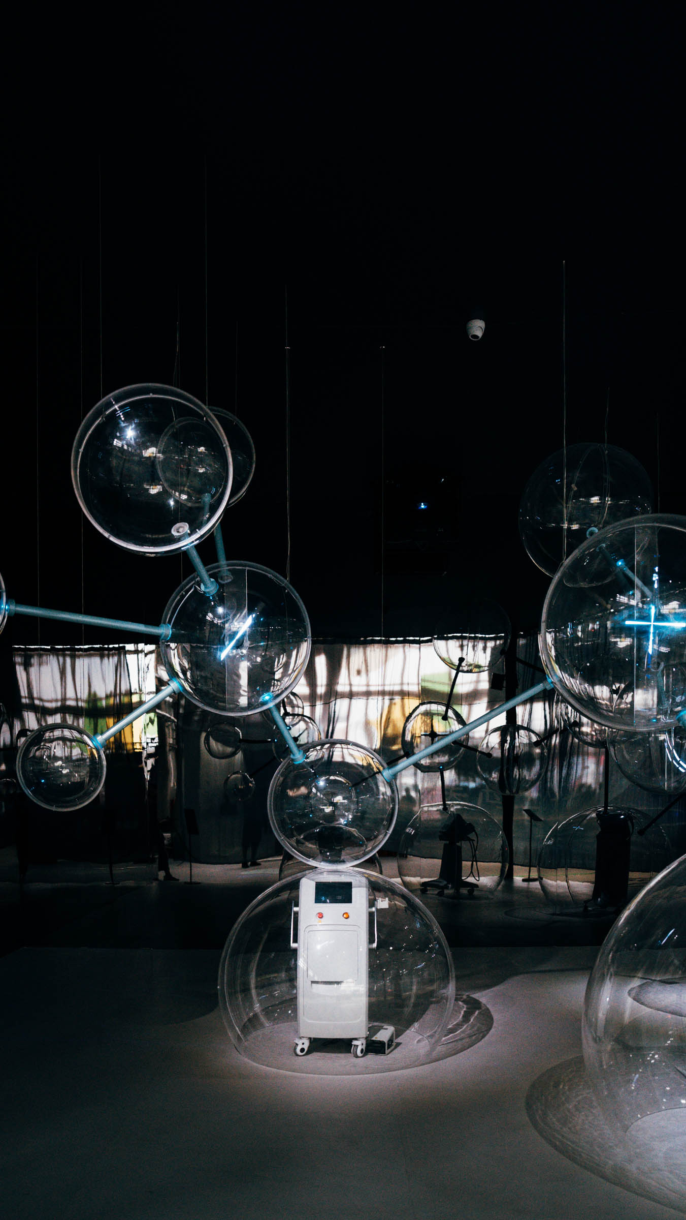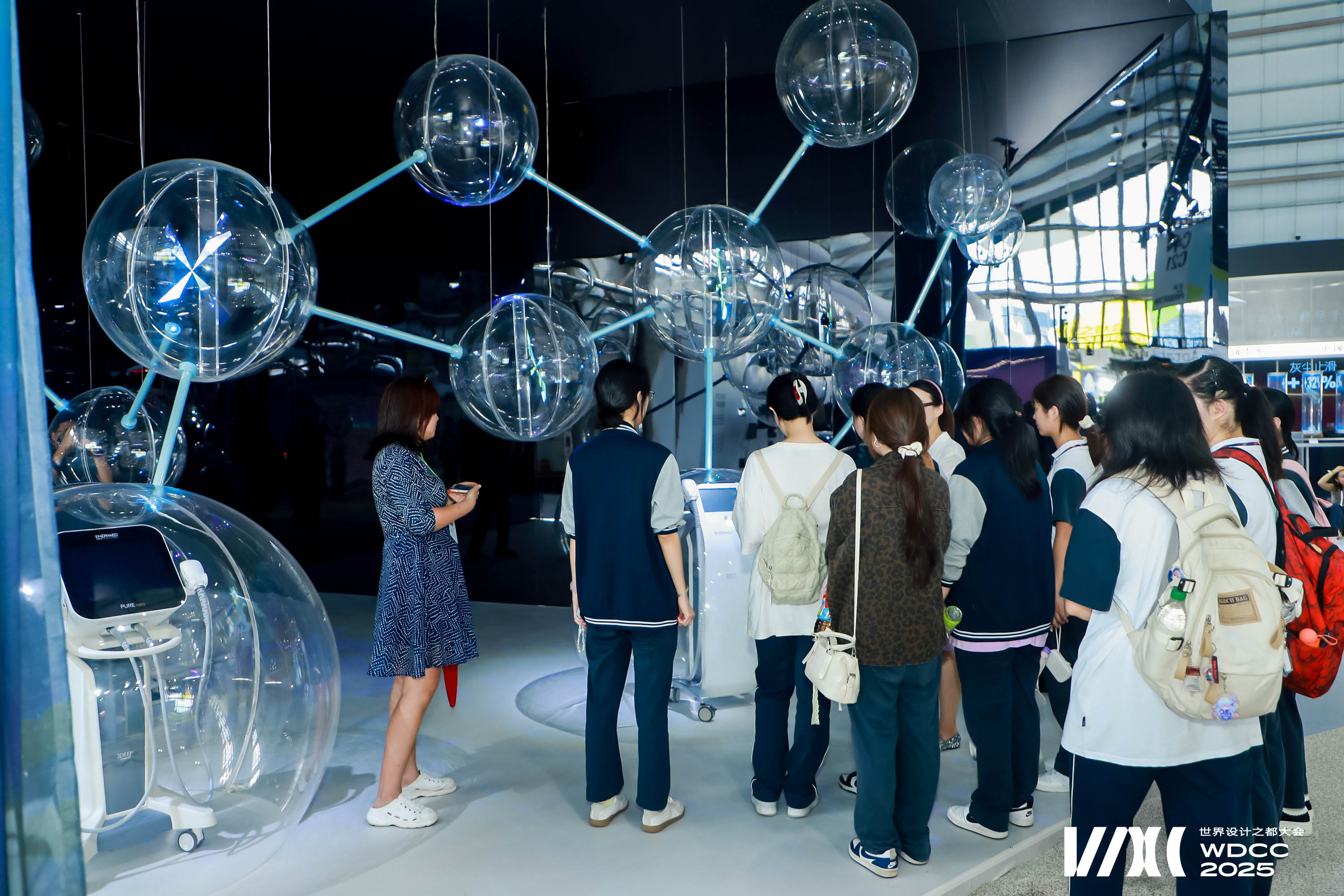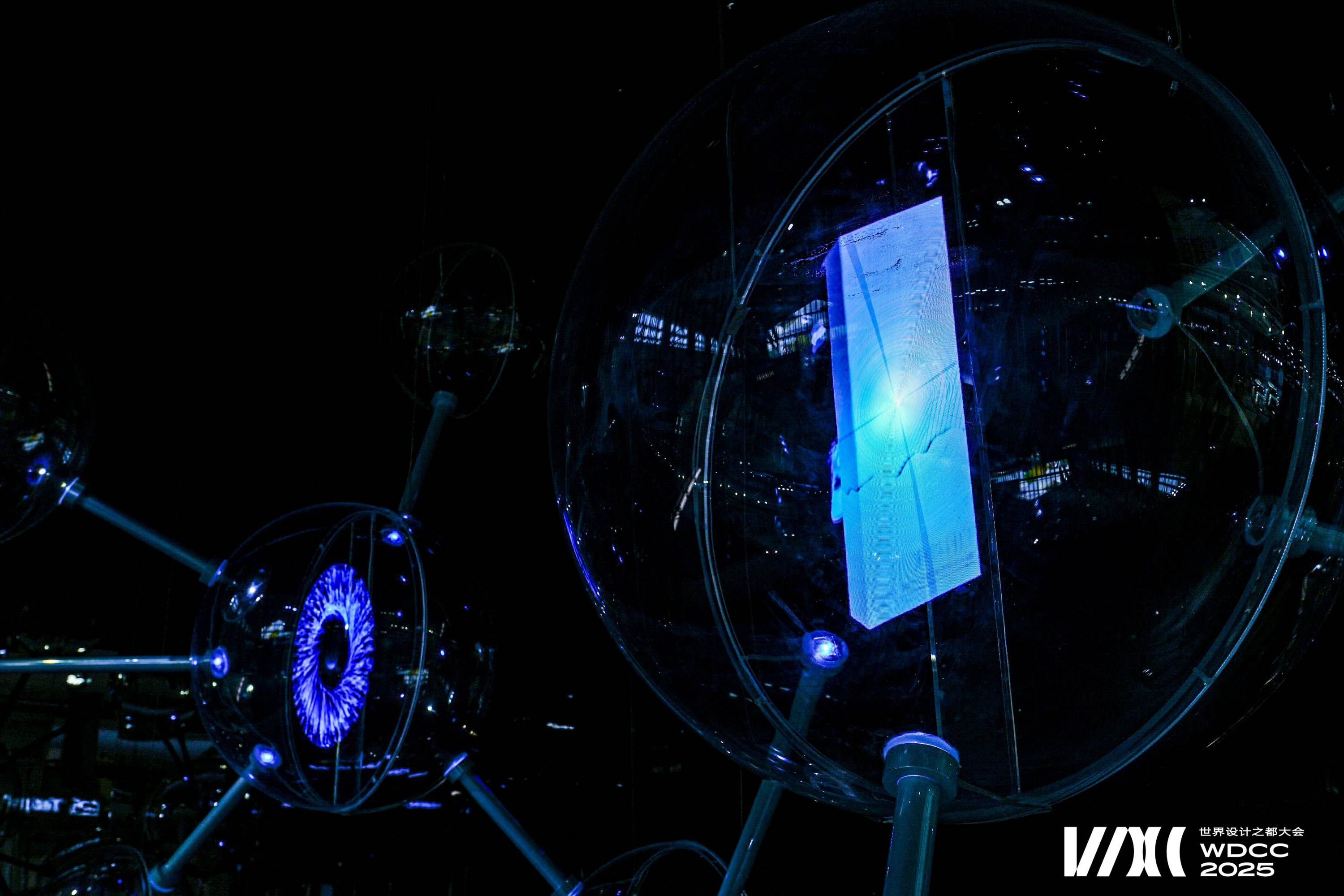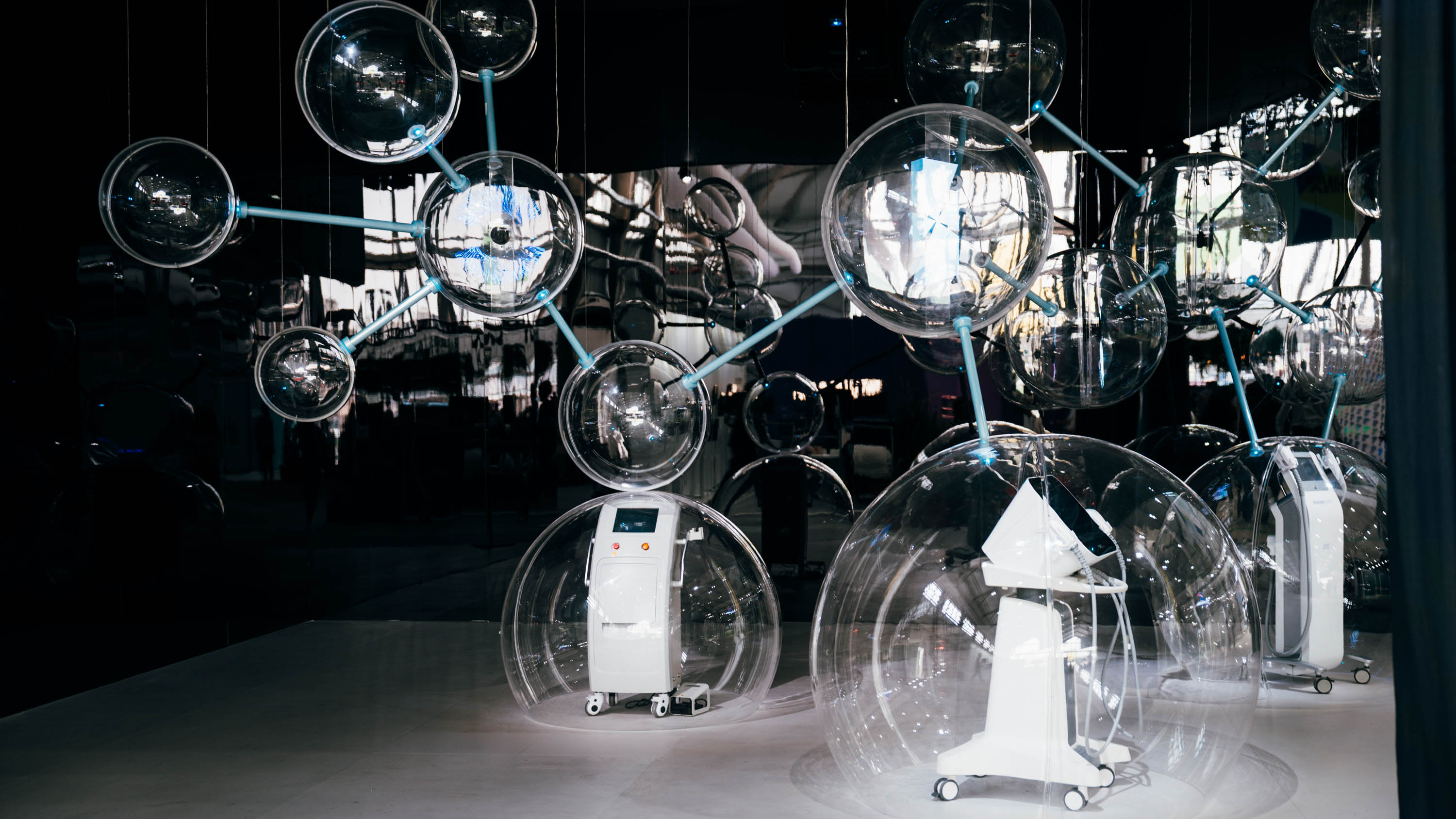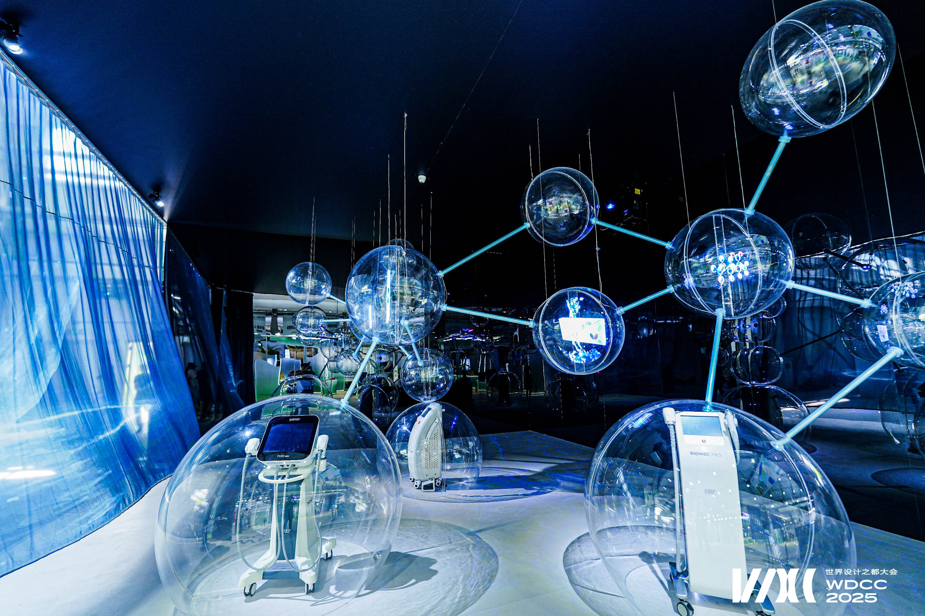 The work draws inspiration from (Big Dumb Object) BDO aesthetics and the molecular structure of cells. Sixteen transparent spheres, connected by metal rods, form a “cell network,” symbolizing the flow and resonance of life energy. At the base, three semi-circular spheres showcase the company’s three core devices in physical form, highlighting the company’s technological capabilities. In the middle section, four spheres employ holographic projections to vividly present three major product series close to everyday life, constructing a complete narrative that connects advanced technologies with real-life applications.