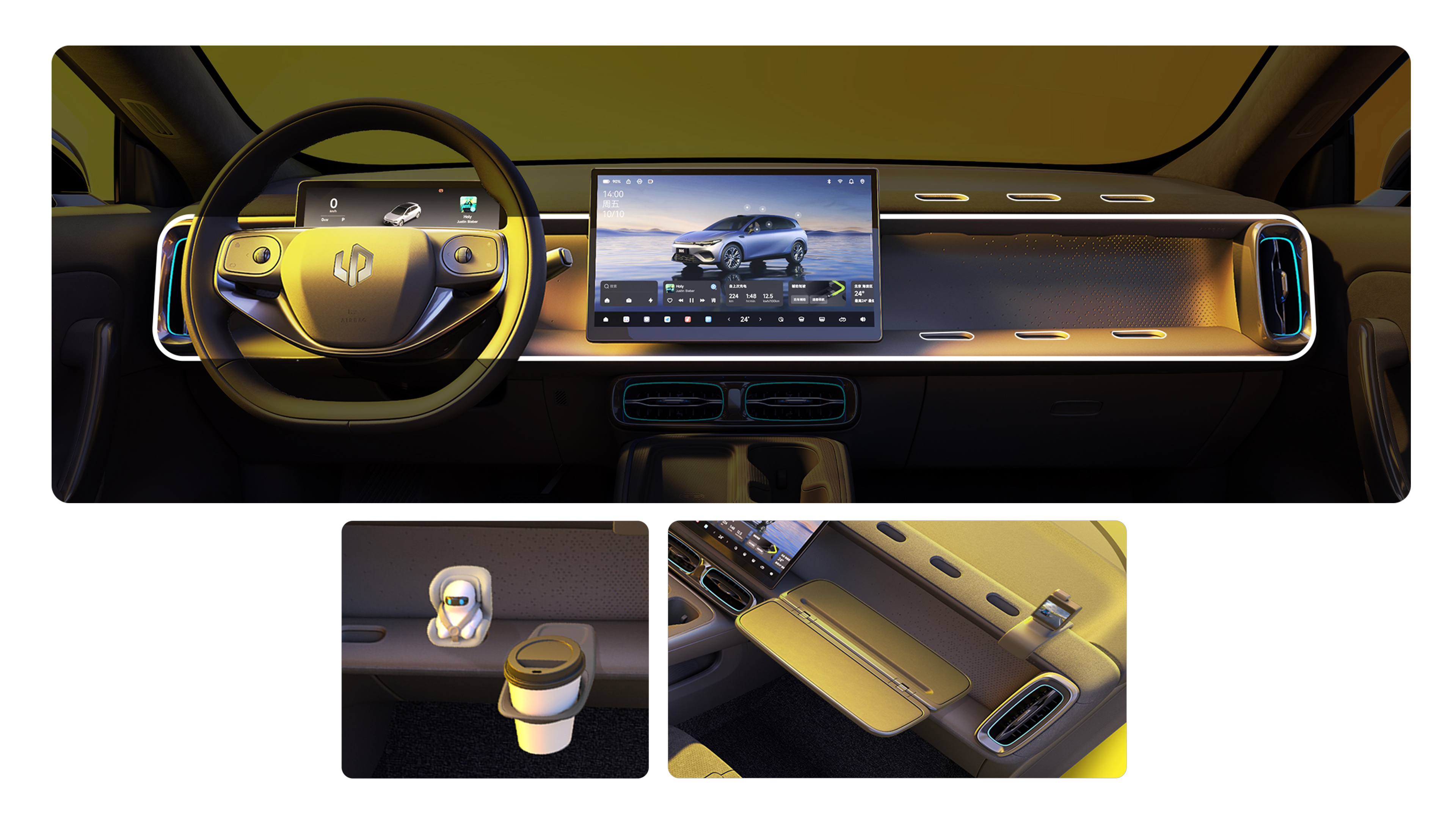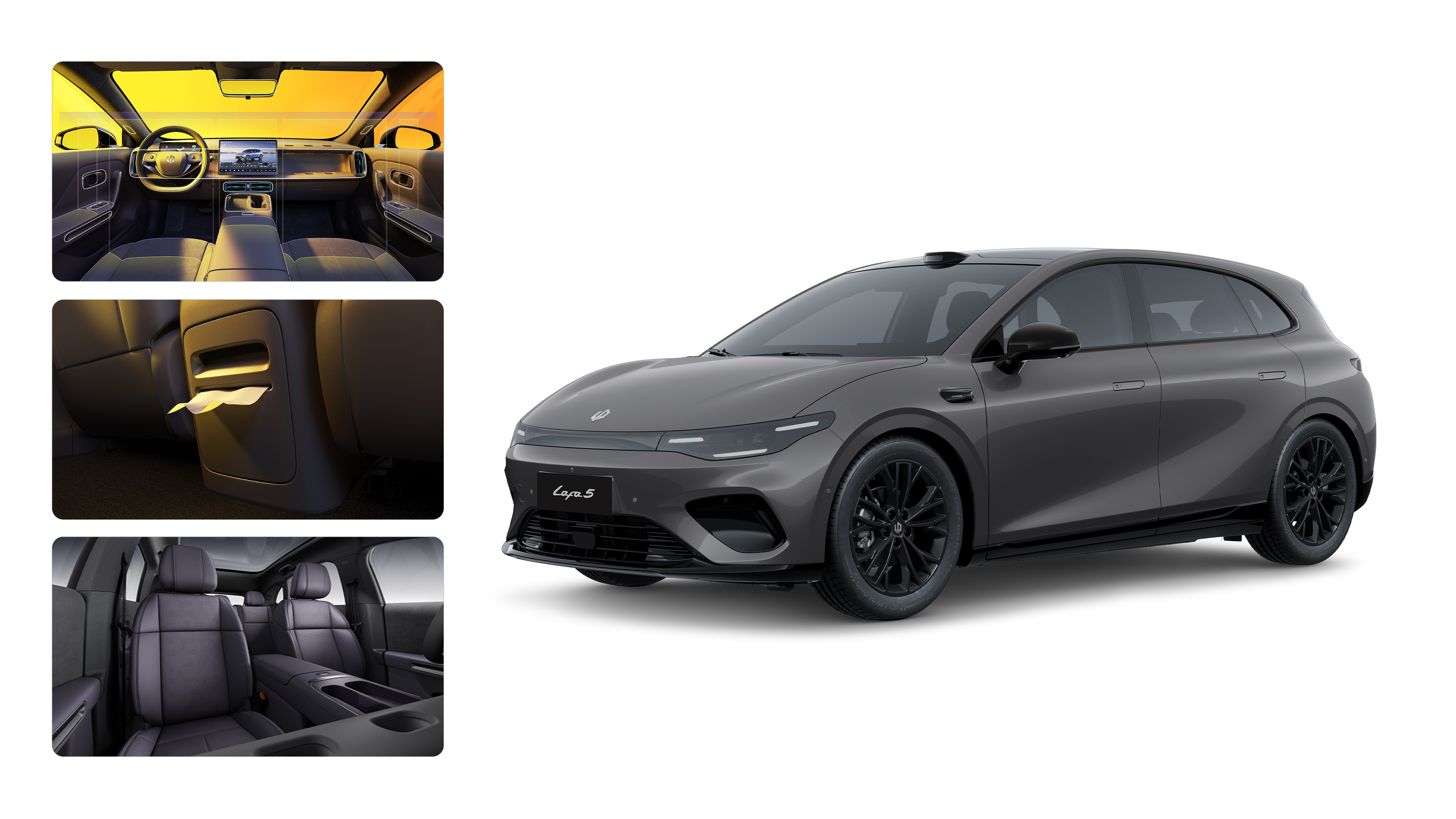 Lafa5—an acronym for Lifestyle, Attitude, Freedom, and Art—is the Dream Car for the new generation. With a design DNA defined by three core principles—Purity, Aspiration, Joyful—it transforms the car from a mere tool of transportation into an expression of individuality, giving happiness a tangible form through design. This vehicle integrates stunning aesthetics, agile handling, intelligent experiences, and class-leading quality to resonate with young users, delivering the emotional connection of "Driving for Your Own Joy." It adopts a minimalist and restrained design language, eliminating all superfluous lines to reveal a pure expression of speed and vitality. Every design detail stems from deep insight into and a direct response to the real needs of our users. Fun is in Lafa5's DNA. The “Highly playable Inspiration IP Ring” is the car's design signature and a versatile accessory hub for users. It appears to cleverly float out from the main console, and its suspended ring design gives it both a futuristic feel and everyday practicality. Anywhere along the Loop, users can mount electronic devices like a smartphone or GoPro. For the front passenger, the Loop features integrated ports for quickly snapping in custom accessories, such as a tray table, cup holder, or buckles. Within the constraints of an A-segment size, the Lafa5 achieves a perfect balance between posture and space through millimeter-level proportional adjustments. By meticulously adjusting the C-point, we balanced interior space with the car's diving stance. Simultaneously, the C-pillar quarter window was slightly elongated to optimize the glass area, making the cabin feel airy and comfortable. Thoughtful details are provided, such as a 320L trunk with a power liftgate, a sunroof with a physical sunshade, and a dedicated rear-seat tissue box, ensuring that every daily action of the user is considered. The seats feature a class-leading contact area of 2520cm², combined with an ergonomic backrest design to deliver both long-distance comfort and a secure, enveloped feeling.