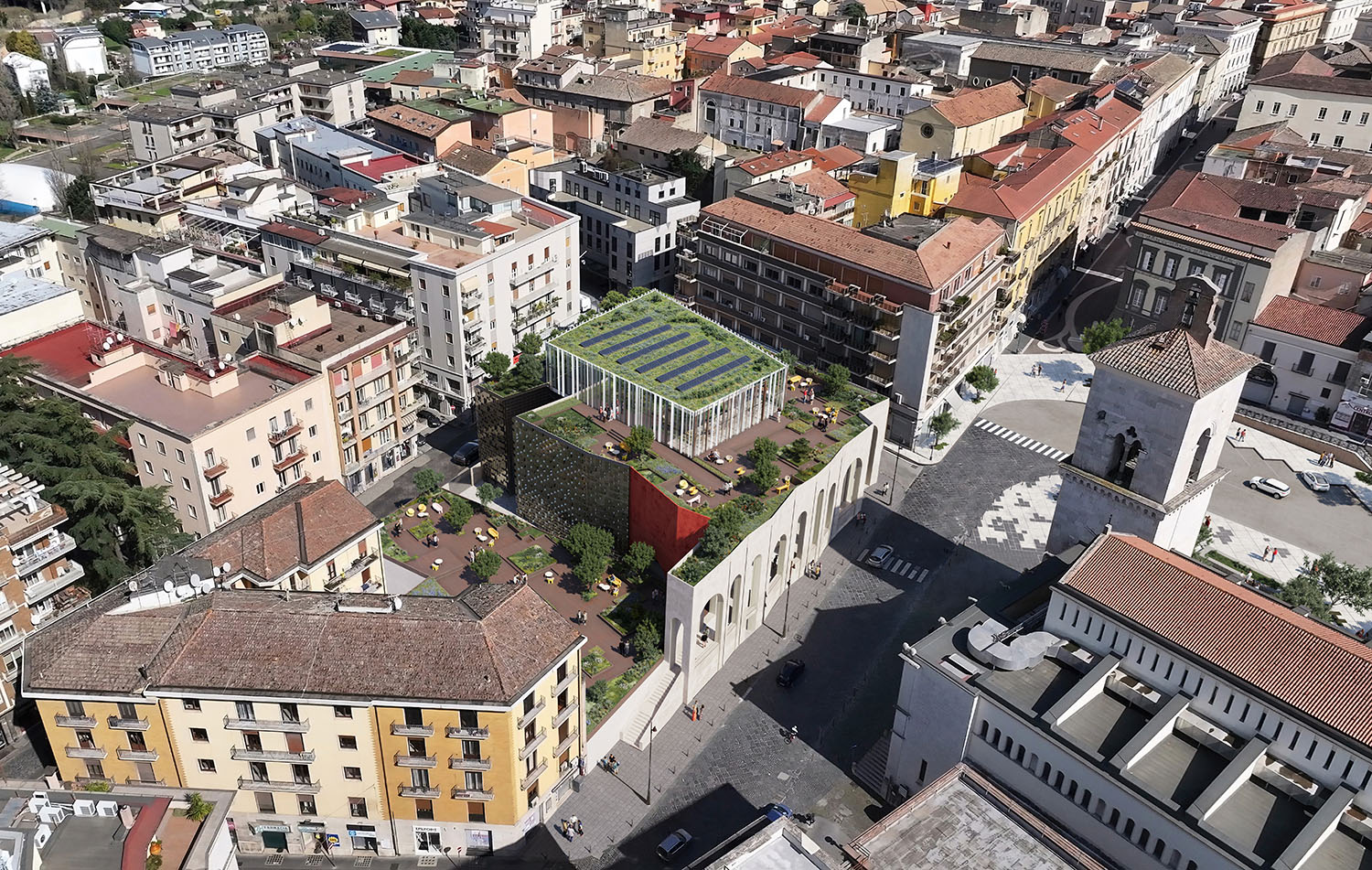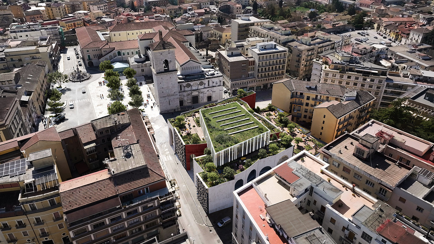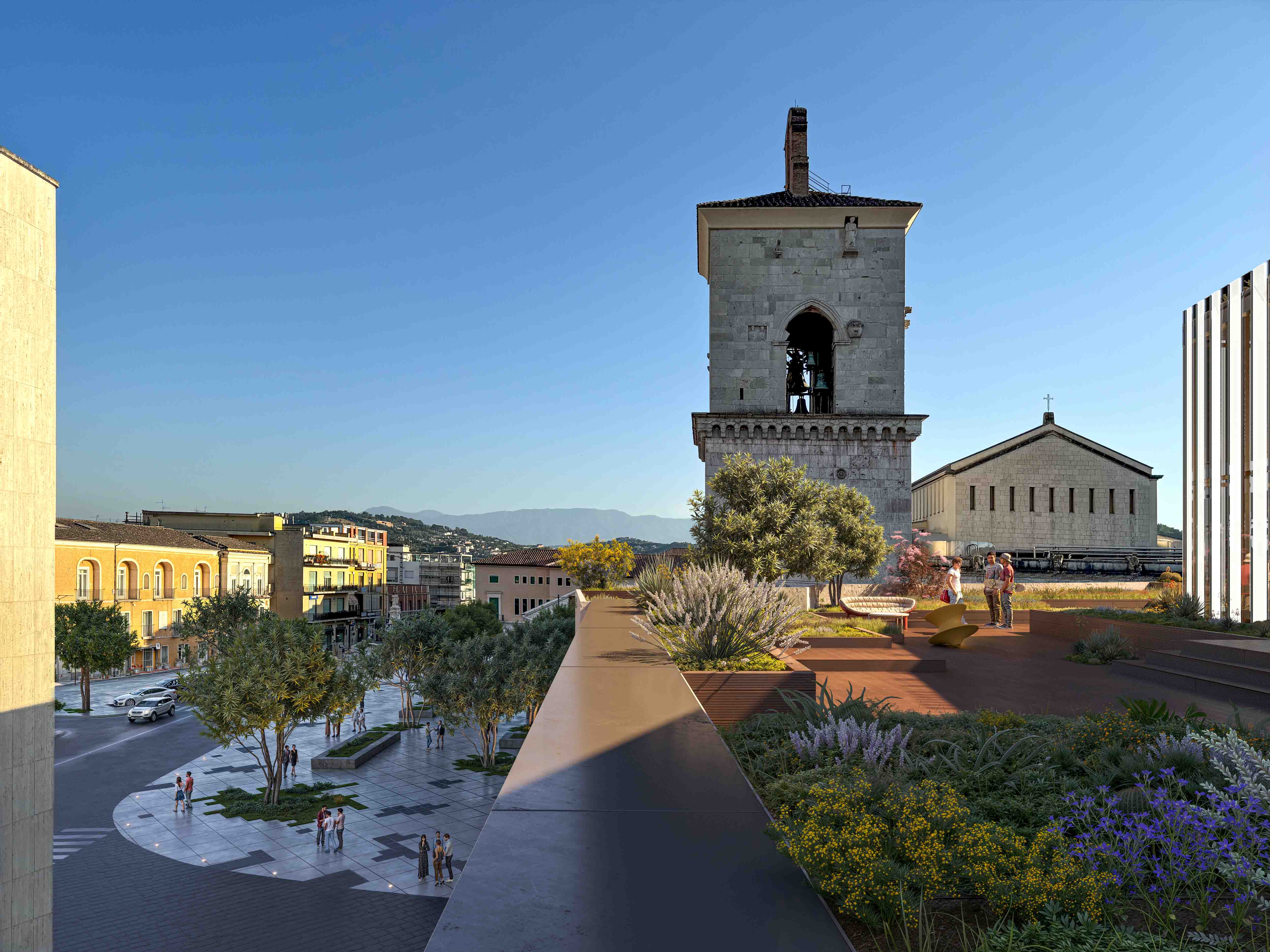 The intervention’s urban dimension goes beyond the mere materiality of an element that appears as a building, but conceptually aspires to become the new “piazza” of the cathedral. The theme of the square remains central: it is the quintessential urban space expressing the values of hospitality and social interaction.