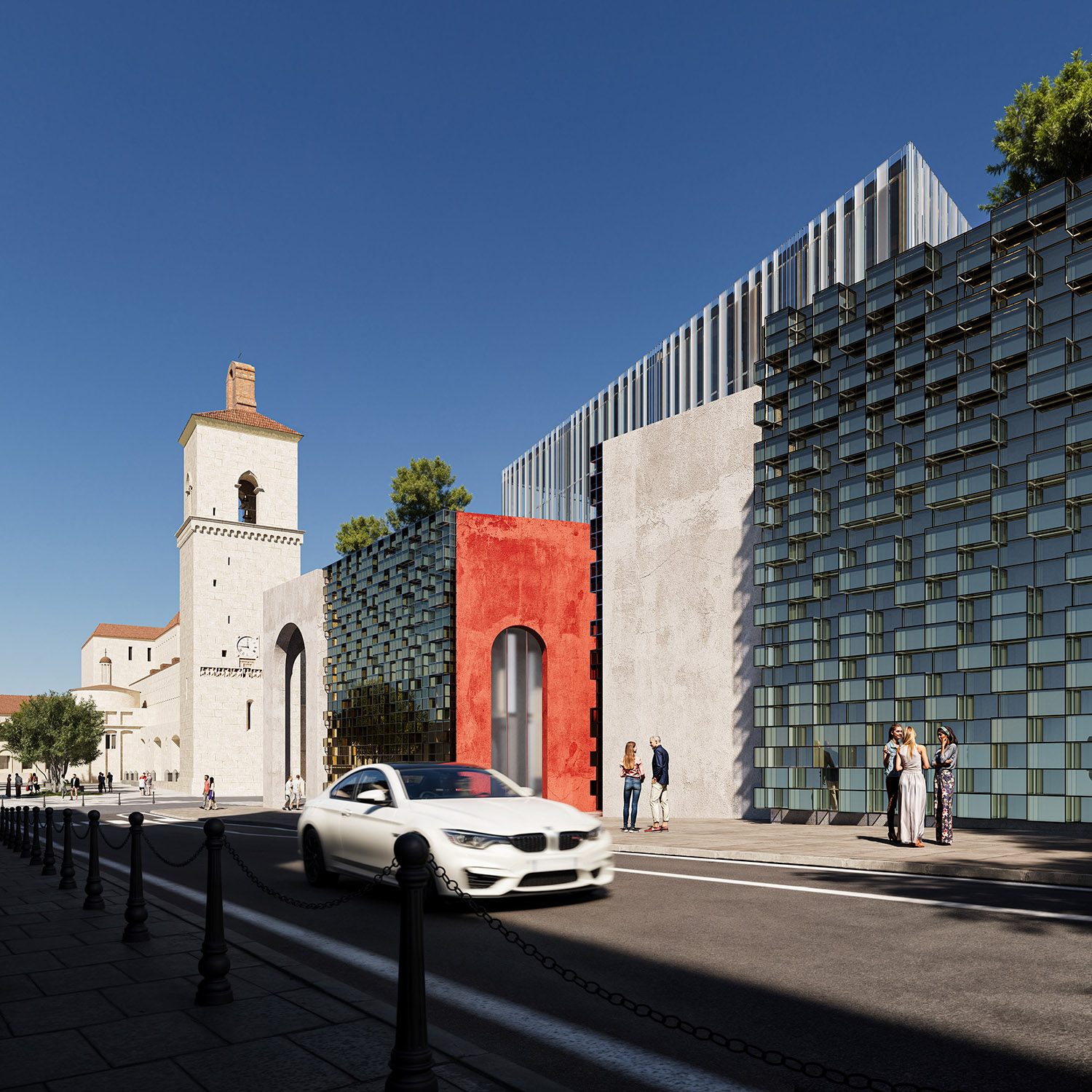 It is a bold, sculptural architecture, where the repetition of small glass cubes produces a striking sense of three-dimensionality and a visual dematerialization of the structure itself, conceived for future realization as a new civic landmark for the city of Benevento.