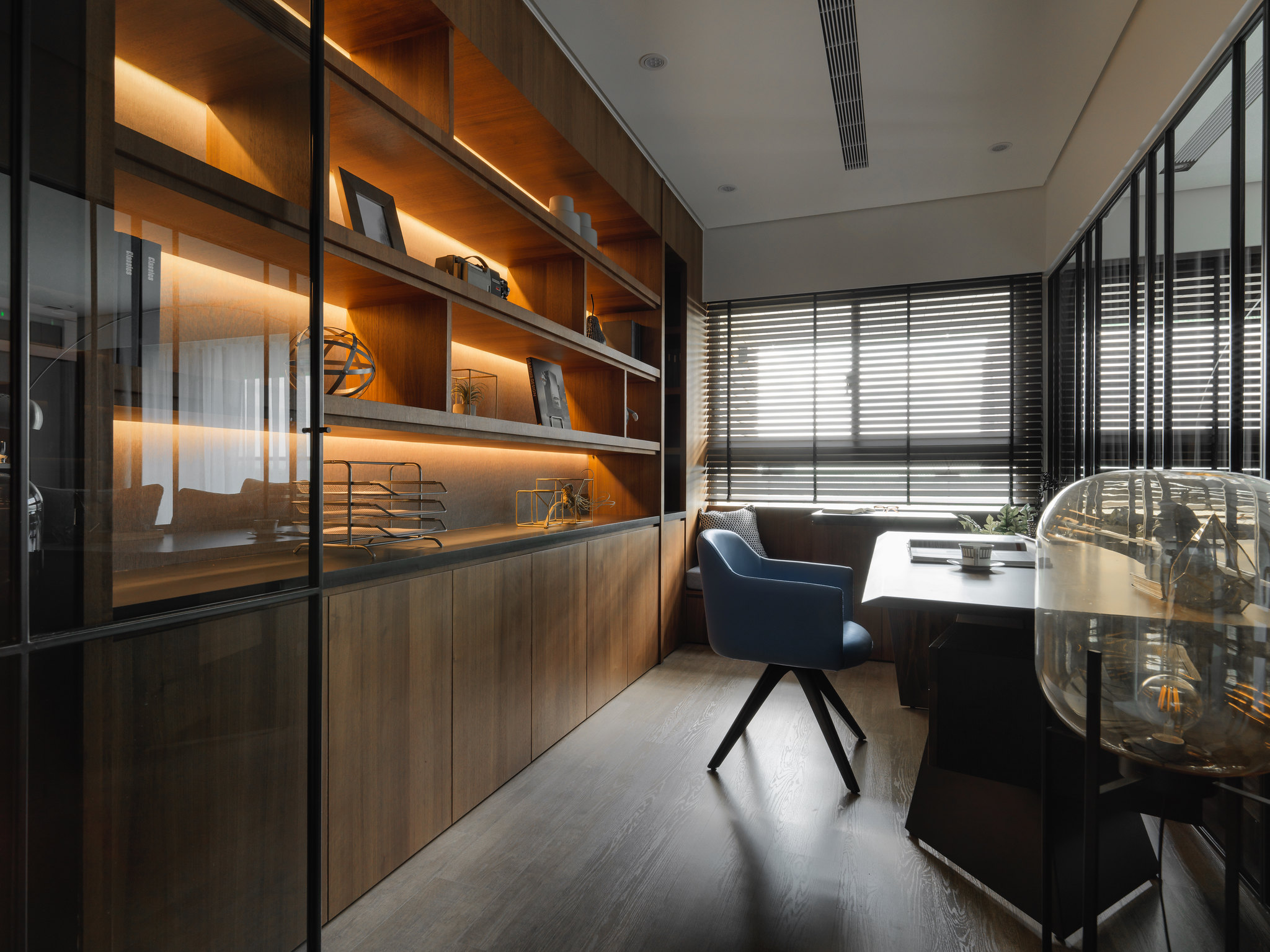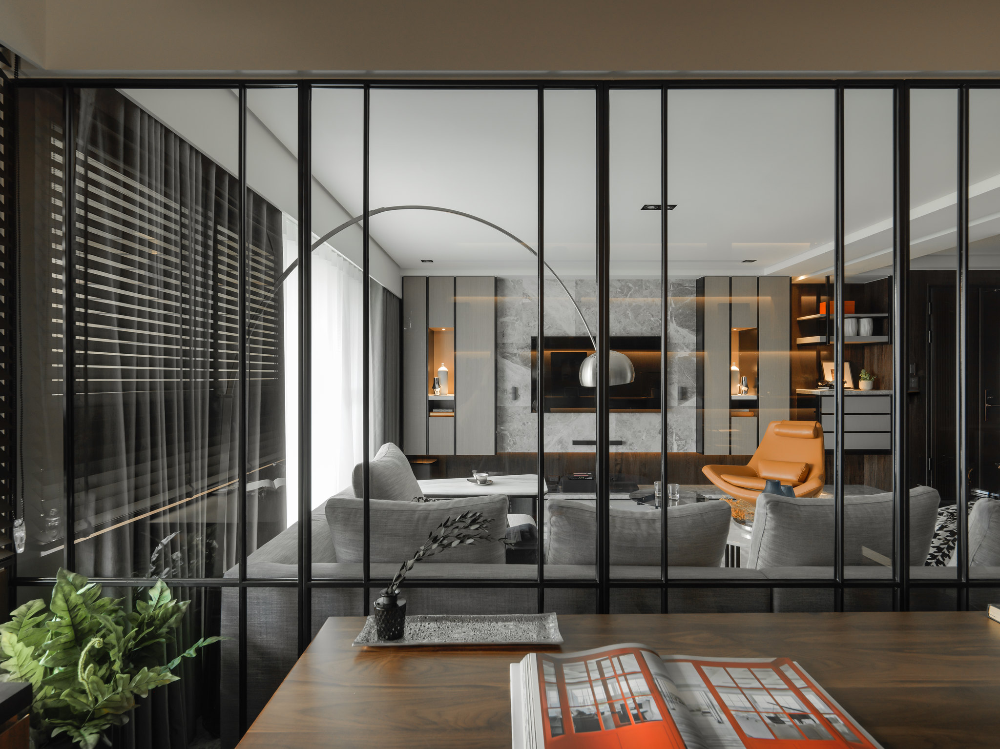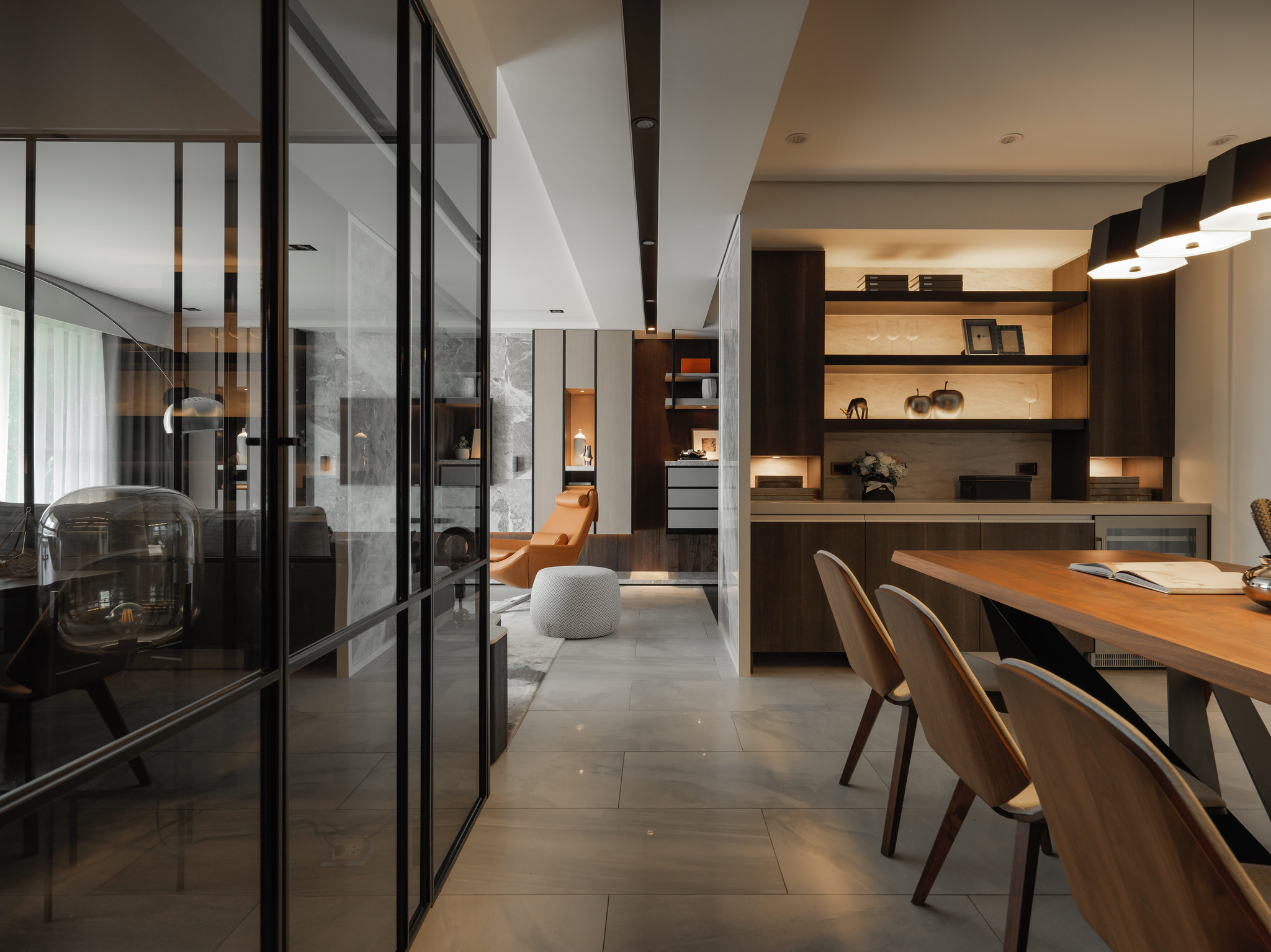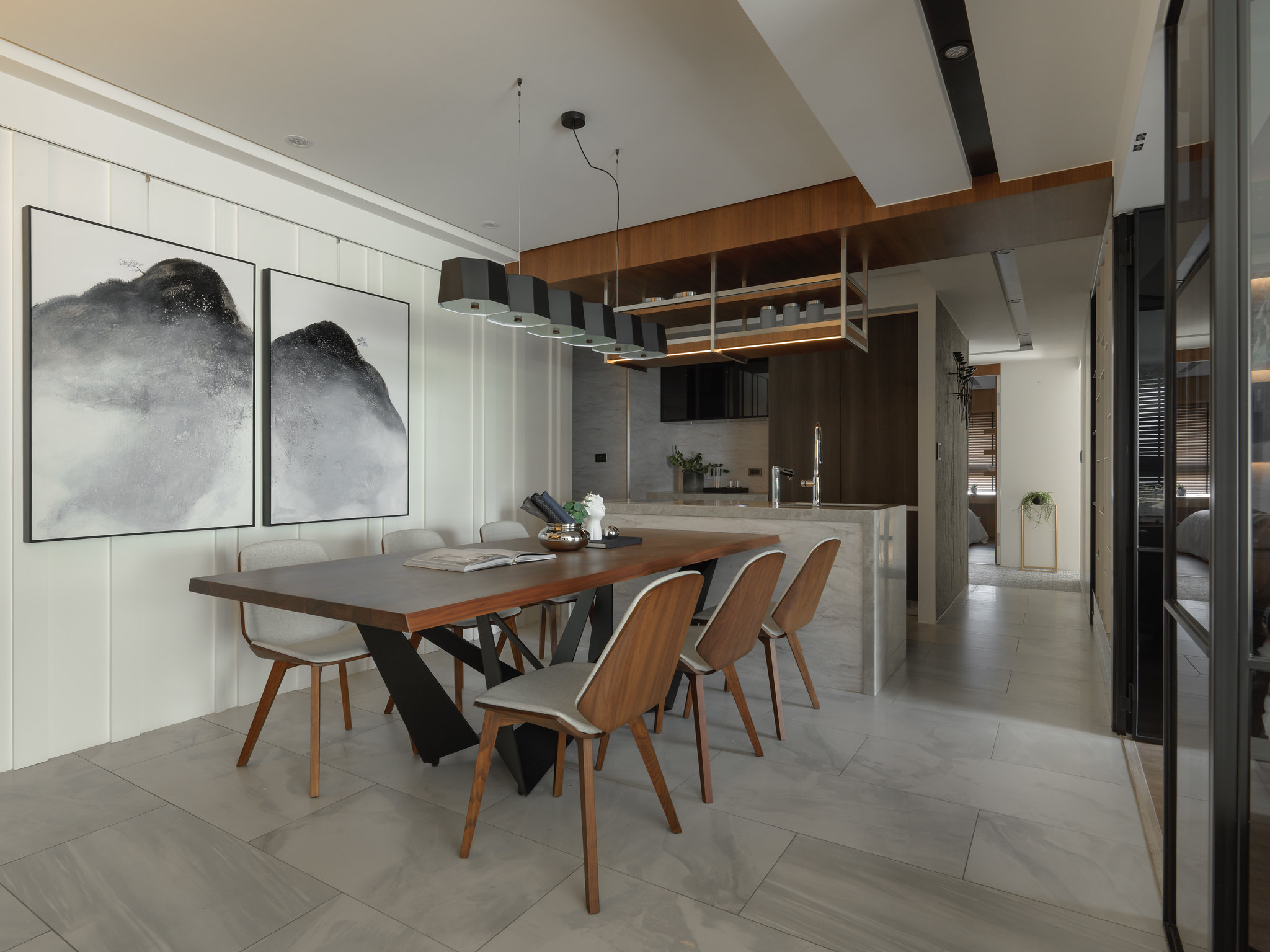 Finally, in the common areas, the designer integrated the living room, dining room, kitchen, and study into a unified space, employing an open layout and permeable materials to create a spacious and comfortable environment that fosters interaction and a sense of belonging among family members. The clever arrangement of various lighting fixtures and artworks not only provides residents with ample space to move around but also enhances their comfort and overall living experience. This also reflects the homeowner's personal taste for understated luxury and elegance.
