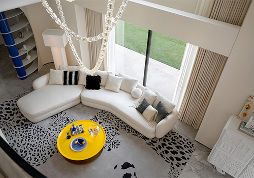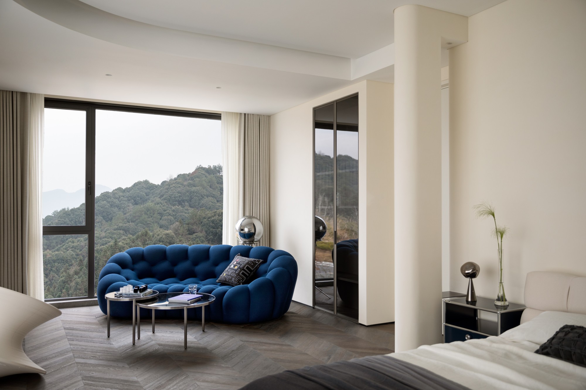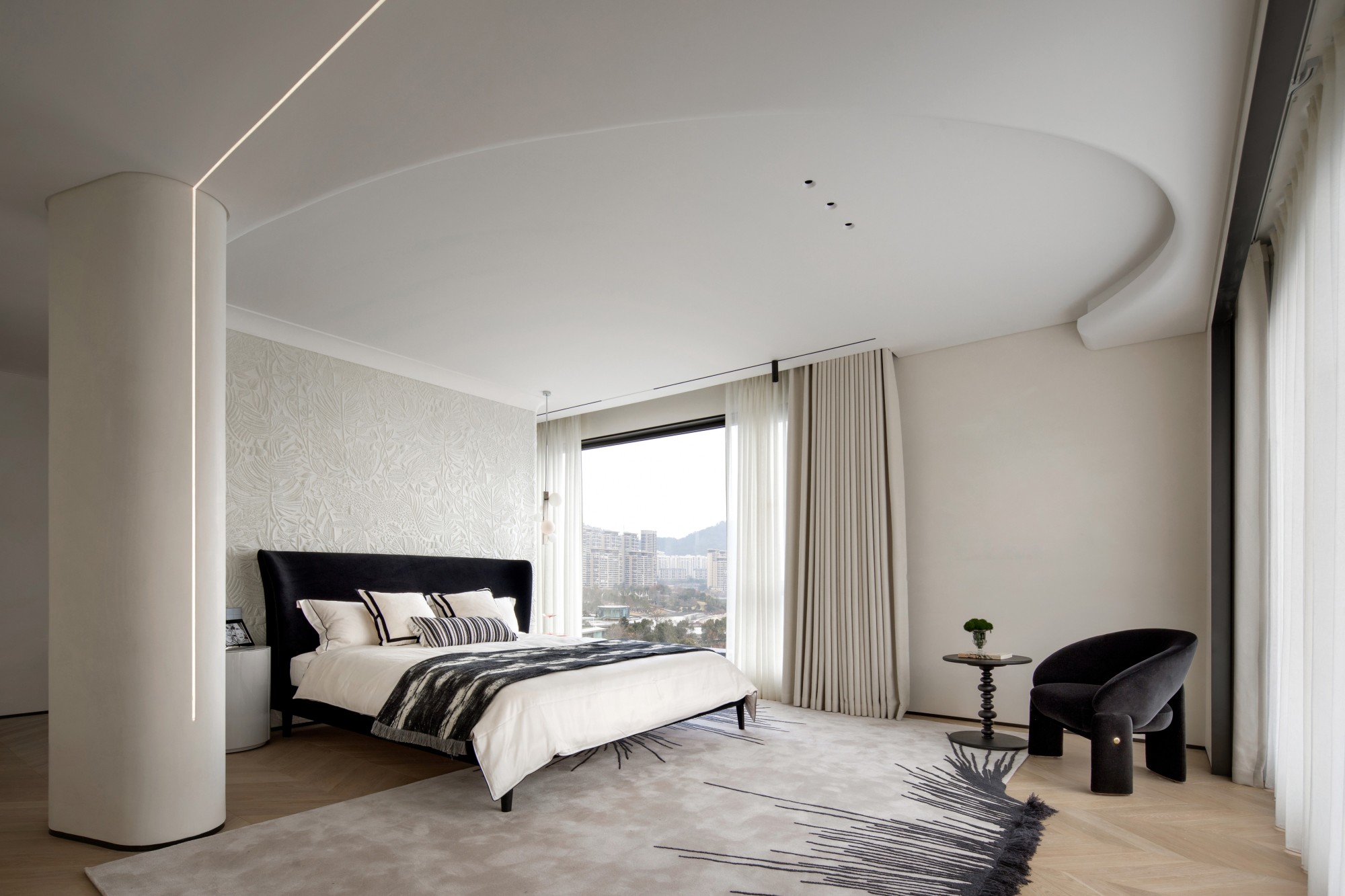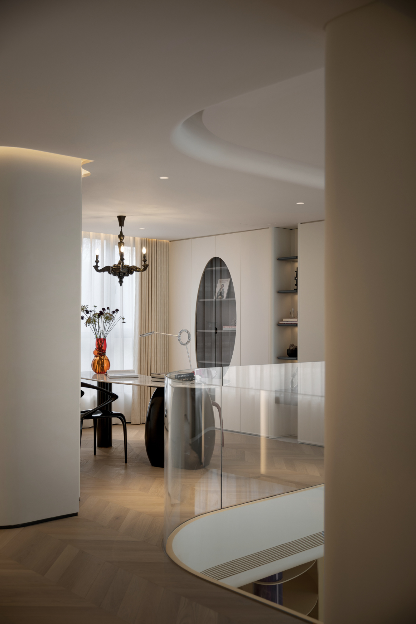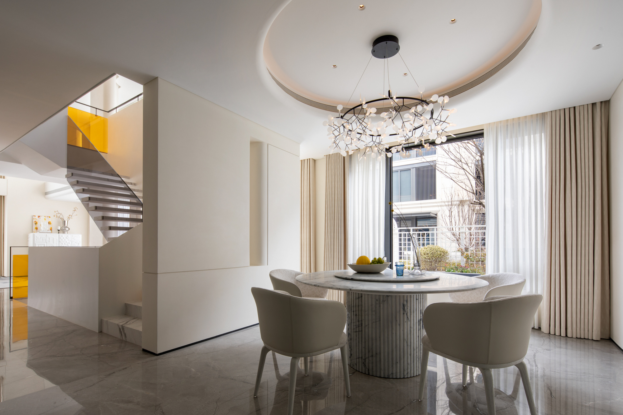 The project building is adjacent to the lake shore, overlooking islands and mountains, and has excellent natural scenery. The house area is about 800 square meters. The building has distinct structural characteristics, with several adjacent residential units connected to form a multi-level villa space. Compared to typical villas, single story villas have a smaller usable area and more densely packed frame beams and columns in the space. How to transform this possible "defect" into a unique and interesting spatial experience is a great challenge for designers. In terms of spatial composition, the designer strives to open up and connect public spaces as much as possible, while achieving vertical spatial communication through varied staircase spaces. Partial windows of the building have been renovated to maximize the sharing of landscape resources among indoor spaces. In the reorganized space, the stairs on different floors have undergone changes in scale, form, and material. People wander in space, and both visual and spatial experiences change and interpret with the transformation of space. The interior adopts many curved and curved design elements, making the transition of the space more natural and overall, enhancing the beauty, and enriching the changes of the space. In terms of material and color expression, the designer uses white as the main tone of the entire space, and different spaces are embellished with different bright colors according to their functions. Sometimes it is expressed as a certain material such as cabinets, metal, glass, and sometimes furniture, blankets, or wallpaper are used to express it, but they all emphasize detail expression. Soft decoration also emphasizes the use of textures of different materials to create resonance and complementarity with the surrounding environment, giving the senses a natural balance. Not only does it introduce nature into indoor spaces, but it also brings people back to nature, allowing them to appreciate the interdependence of architecture, nature, and art, and making the "dwelling place" a "self secret realm" for the body and mind.