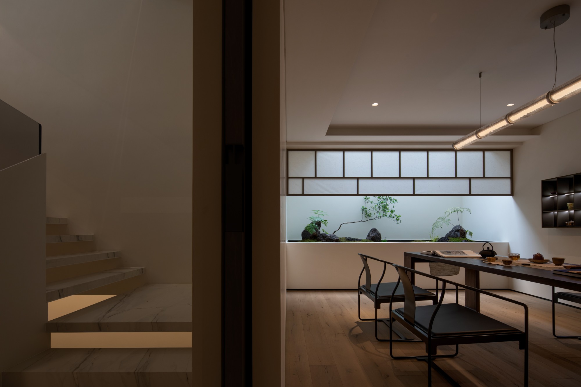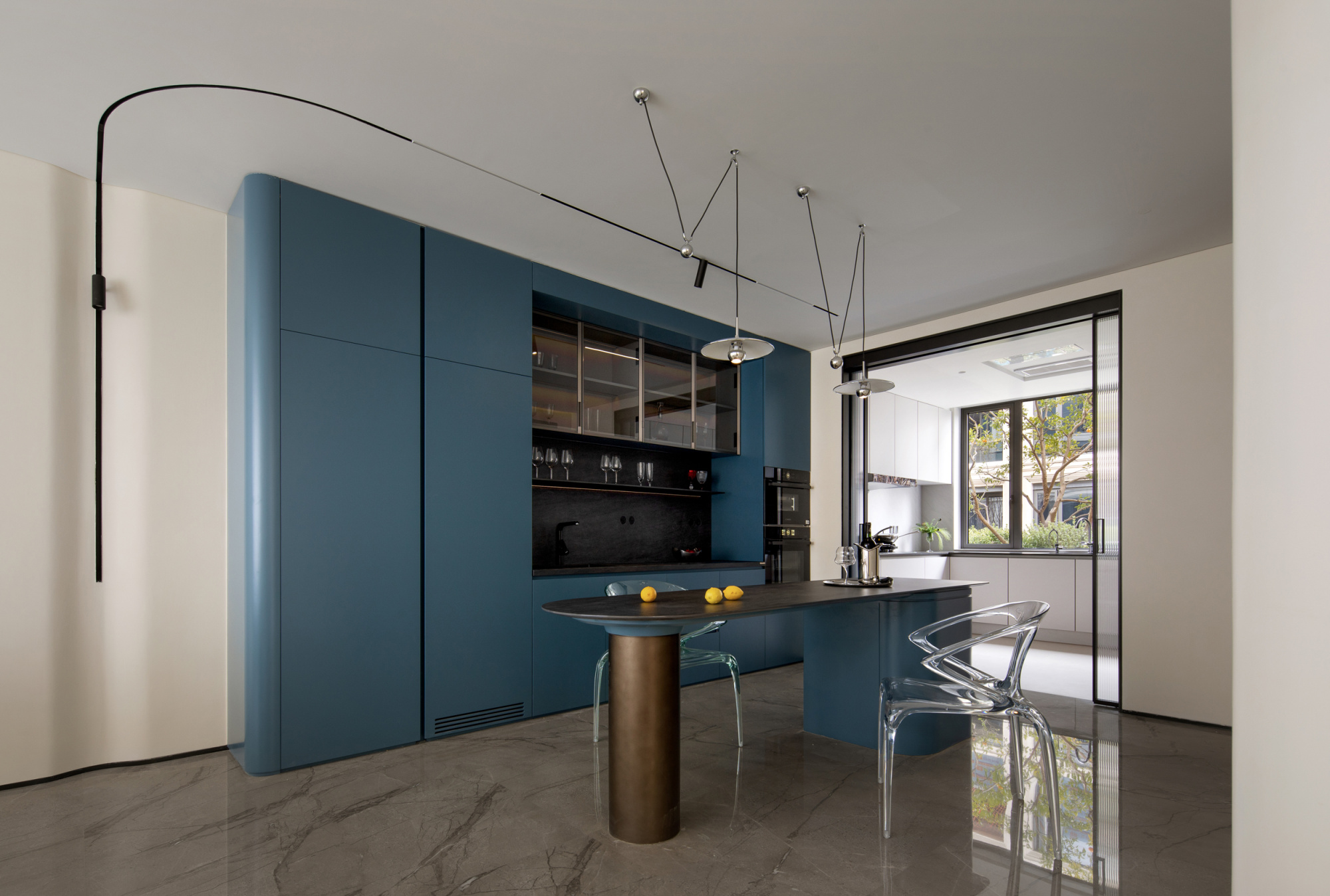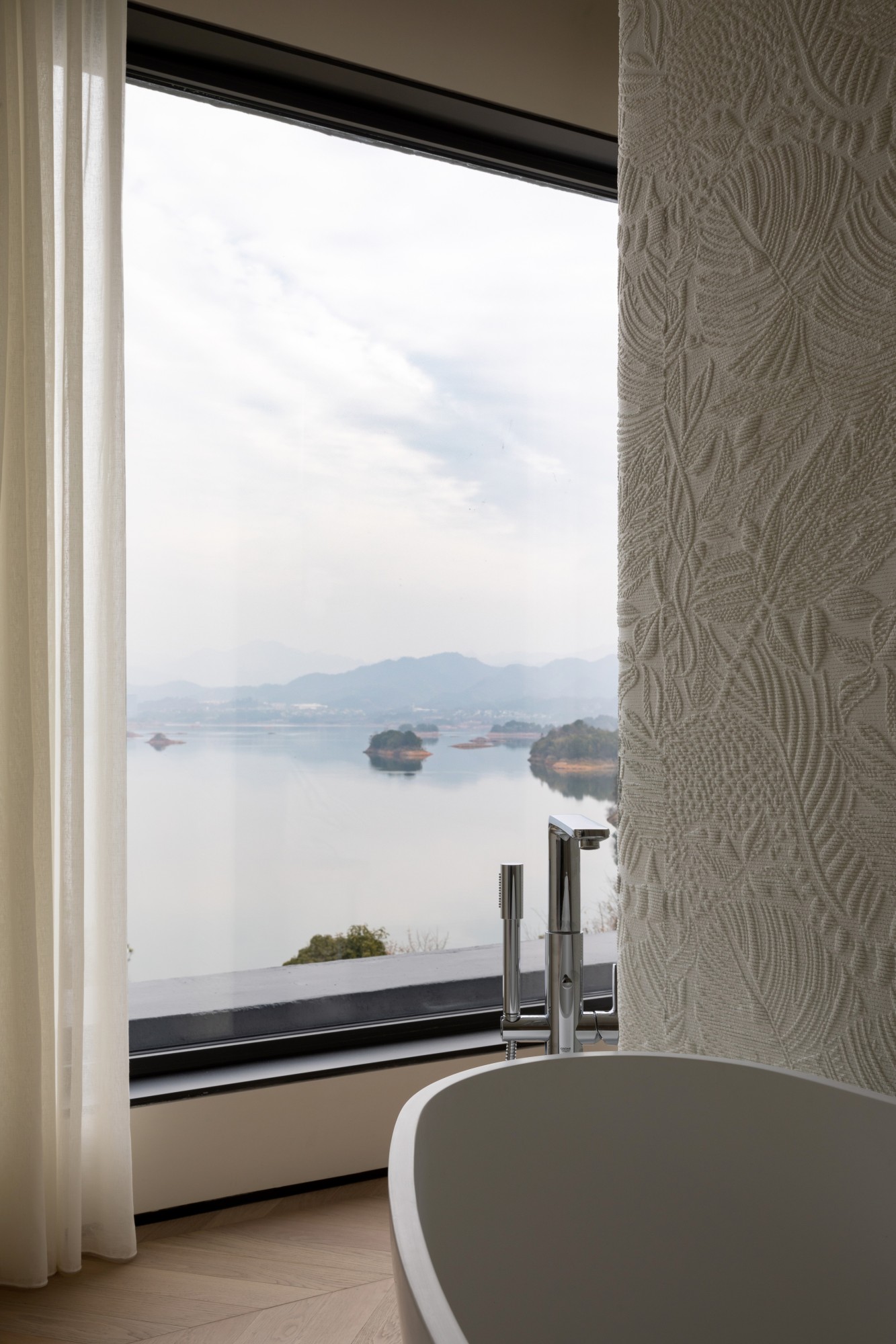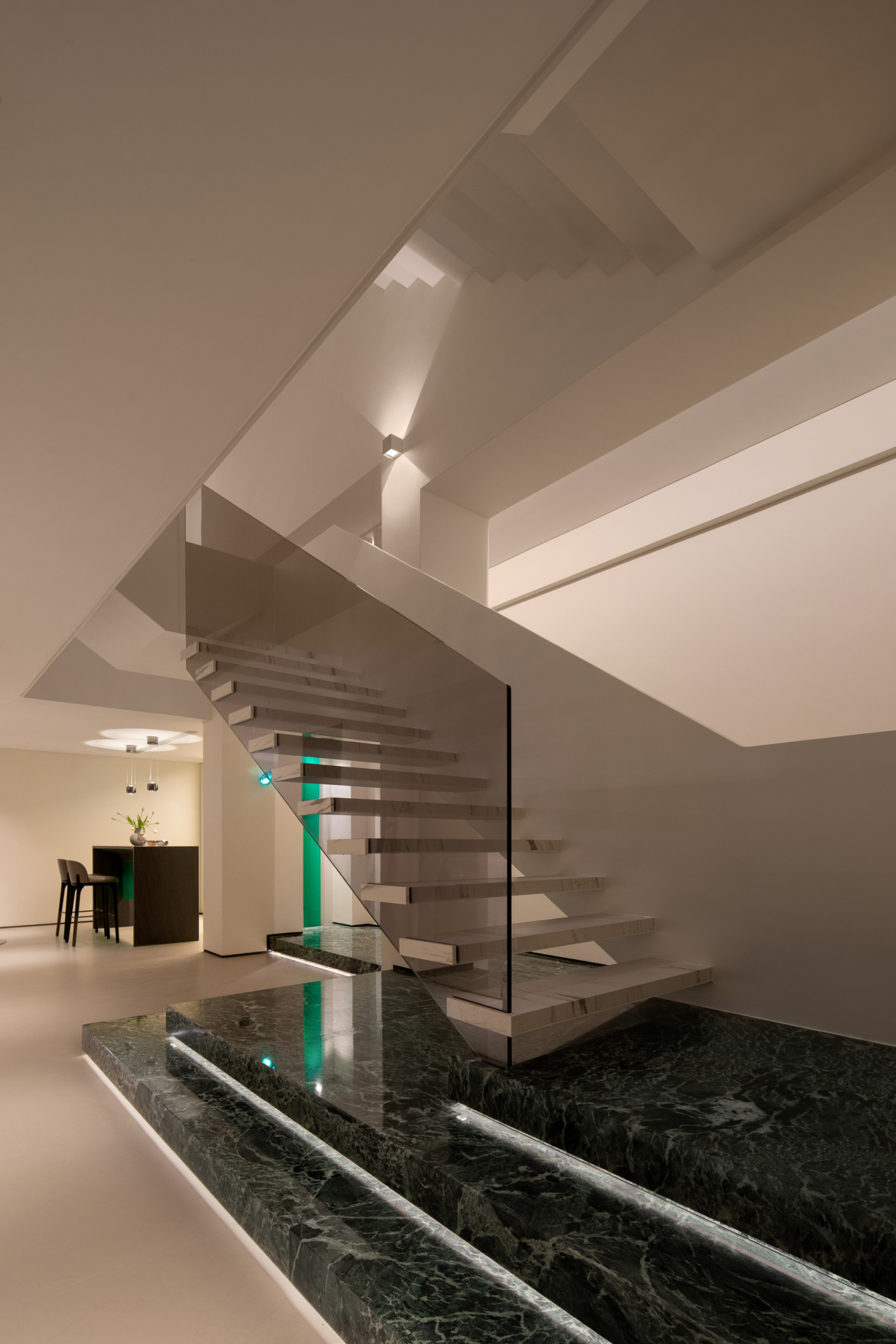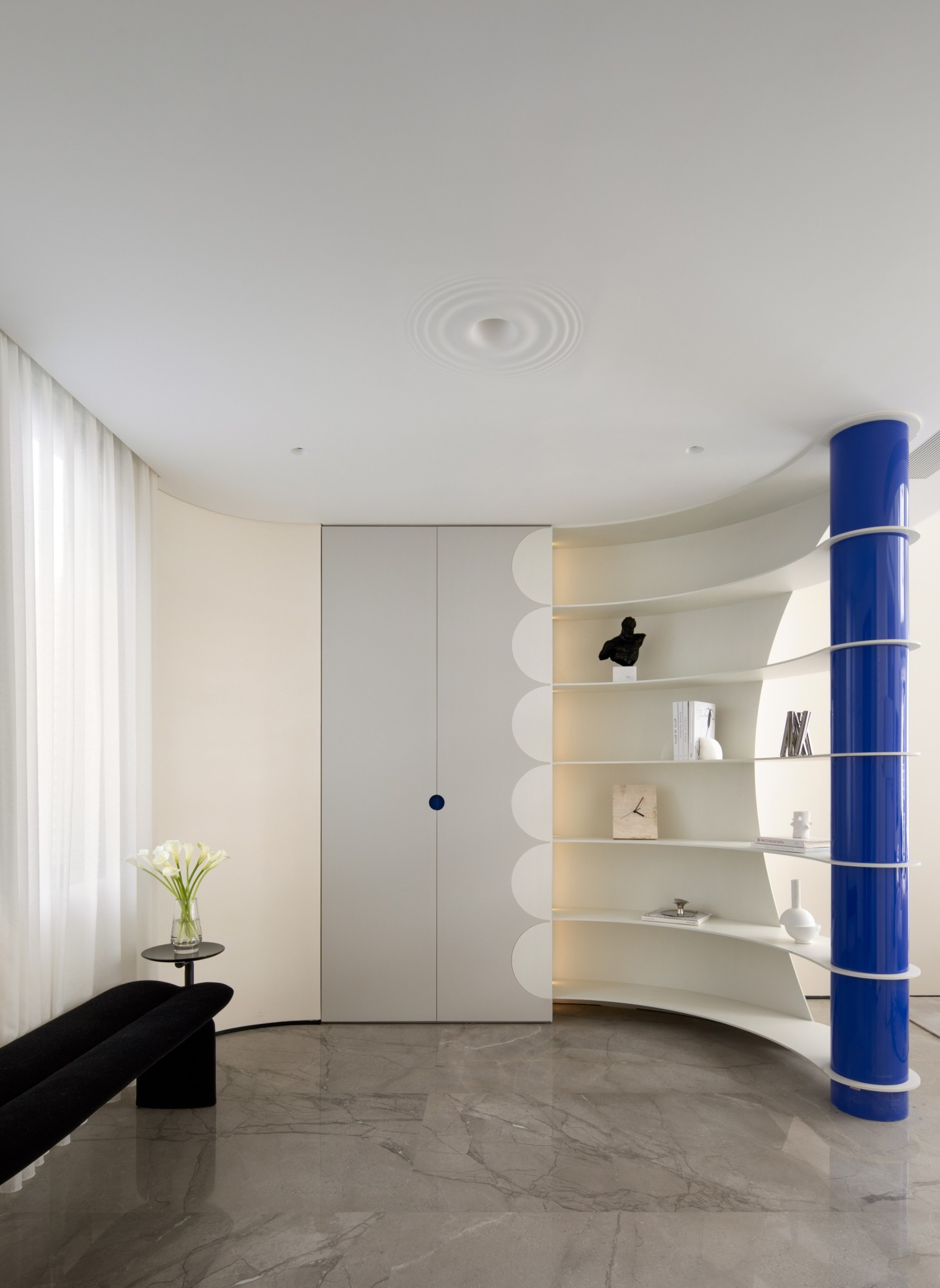 The project building is adjacent to the lake shore, overlooking islands and mountains, and has excellent natural scenery. The house area is about 800 square meters. The building has distinct structural characteristics, with several adjacent residential units connected to form a multi-level villa space. Compared to typical villas, single story villas have a smaller usable area and more densely packed frame beams and columns in the space. How to transform this possible "defect" into a unique and interesting spatial experience is a great challenge for designers. In terms of spatial composition, the designer strives to open up and connect public spaces as much as possible, while achieving vertical spatial communication through varied staircase spaces. Partial windows of the building have been renovated to maximize the sharing of landscape resources among indoor spaces. In the reorganized space, the stairs on different floors have undergone changes in scale, form, and material. People wander in space, and both visual and spatial experiences change and interpret with the transformation of space. The interior adopts many curved and curved design elements, making the transition of the space more natural and overall, enhancing the beauty, and enriching the changes of the space. In terms of material and color expression, the designer uses white as the main tone of the entire space, and different spaces are embellished with different bright colors according to their functions. Sometimes it is expressed as a certain material such as cabinets, metal, glass, and sometimes furniture, blankets, or wallpaper are used to express it, but they all emphasize detail expression. Soft decoration also emphasizes the use of textures of different materials to create resonance and complementarity with the surrounding environment, giving the senses a natural balance. Not only does it introduce nature into indoor spaces, but it also brings people back to nature, allowing them to appreciate the interdependence of architecture, nature, and art, and making the "dwelling place" a "self secret realm" for the body and mind.
