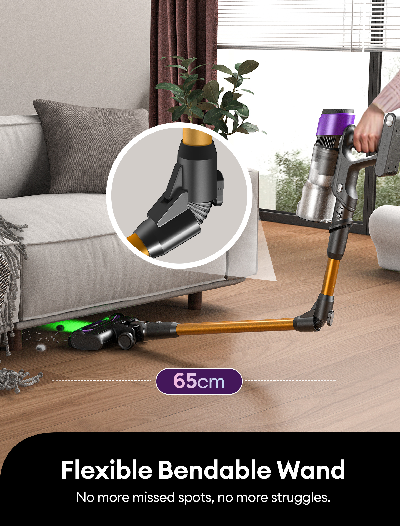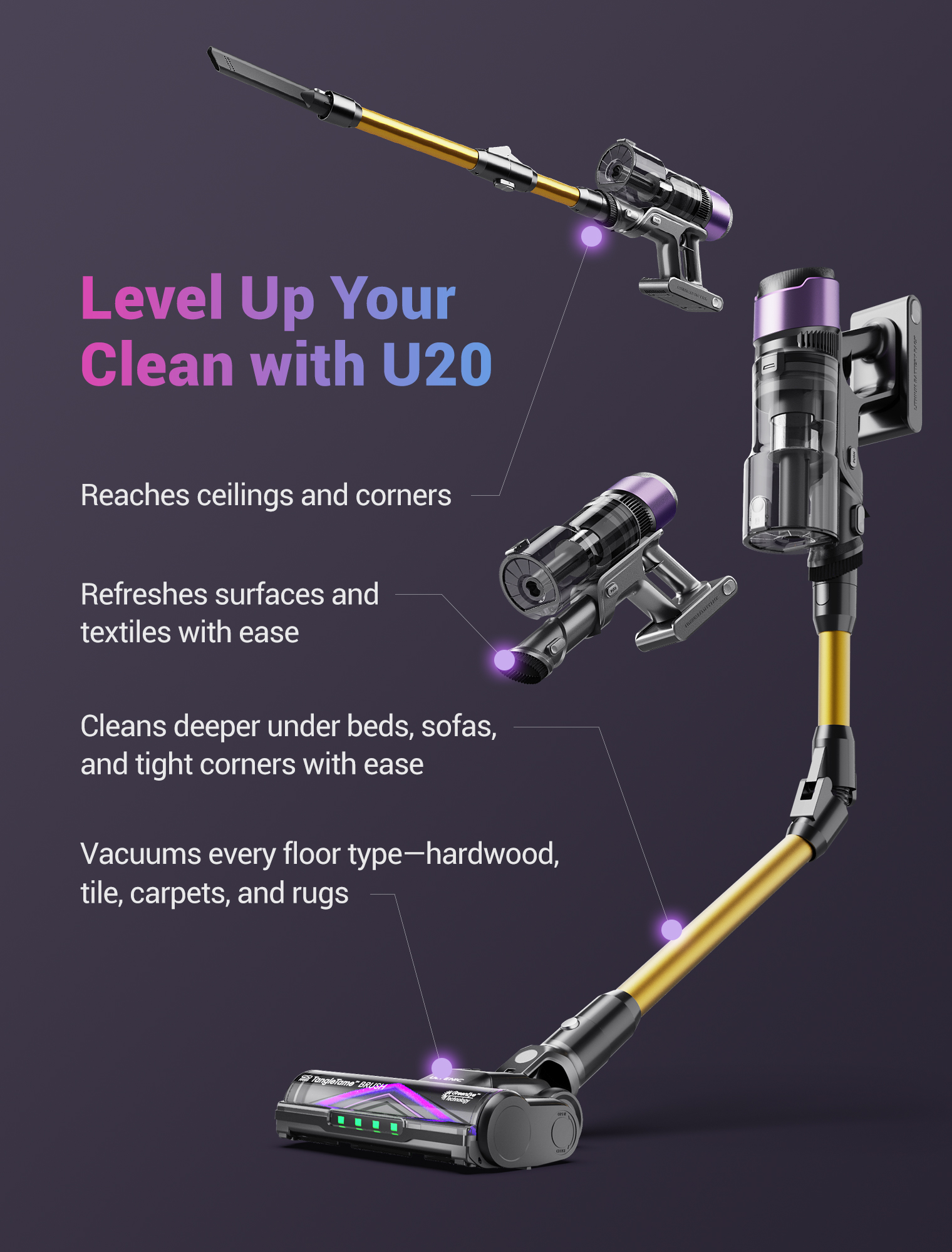 Designed for contemporary living, the Ultenic U20 combines elegance, intelligence, and practicality in one refined package. Its sleek, foldable design allows the wand to bend seamlessly from 90° to 180°, effortlessly reaching under sofas, beds, and other low-clearance furniture—eliminating the need for heavy lifting. Yet it stands upright on its own, a self-supporting silhouette that saves space while enhancing both convenience and aesthetic appeal.