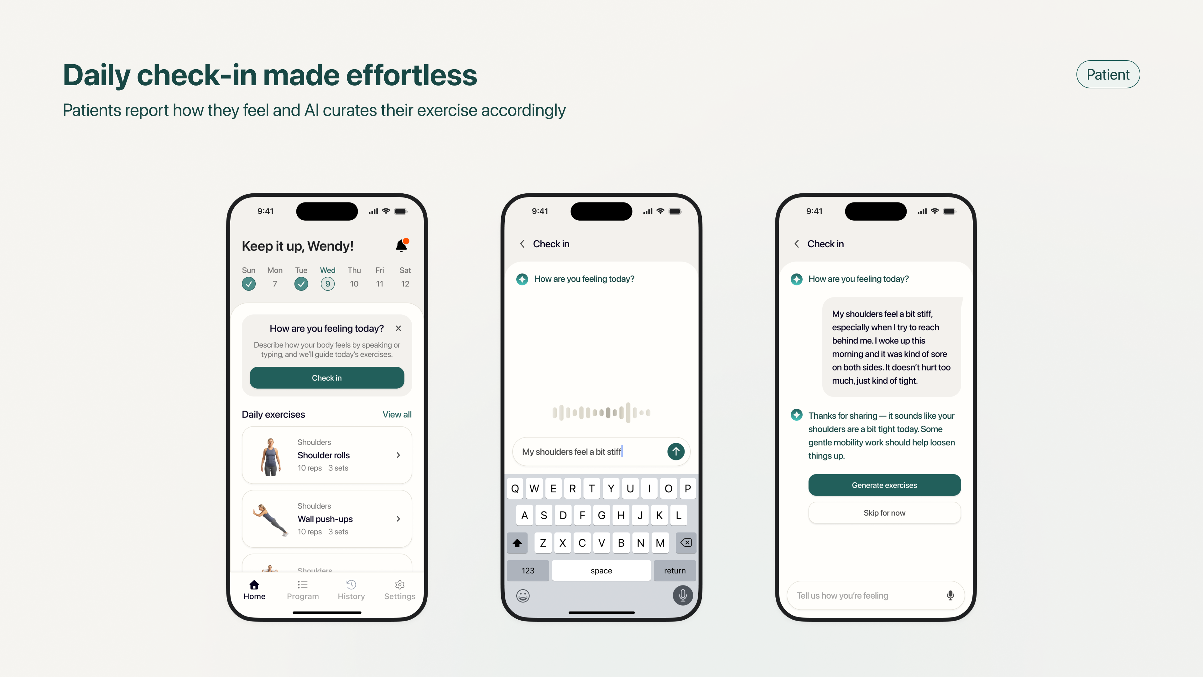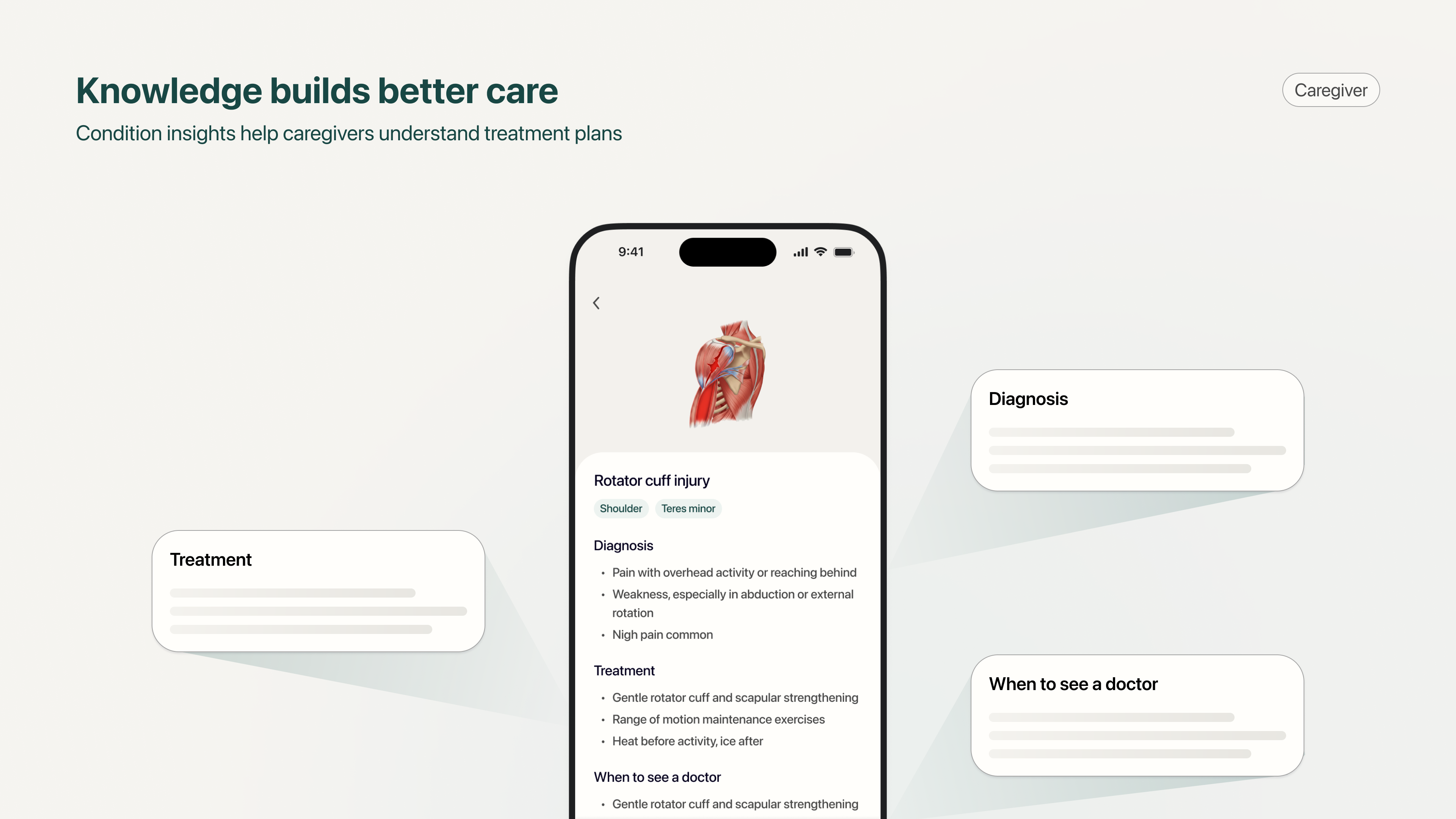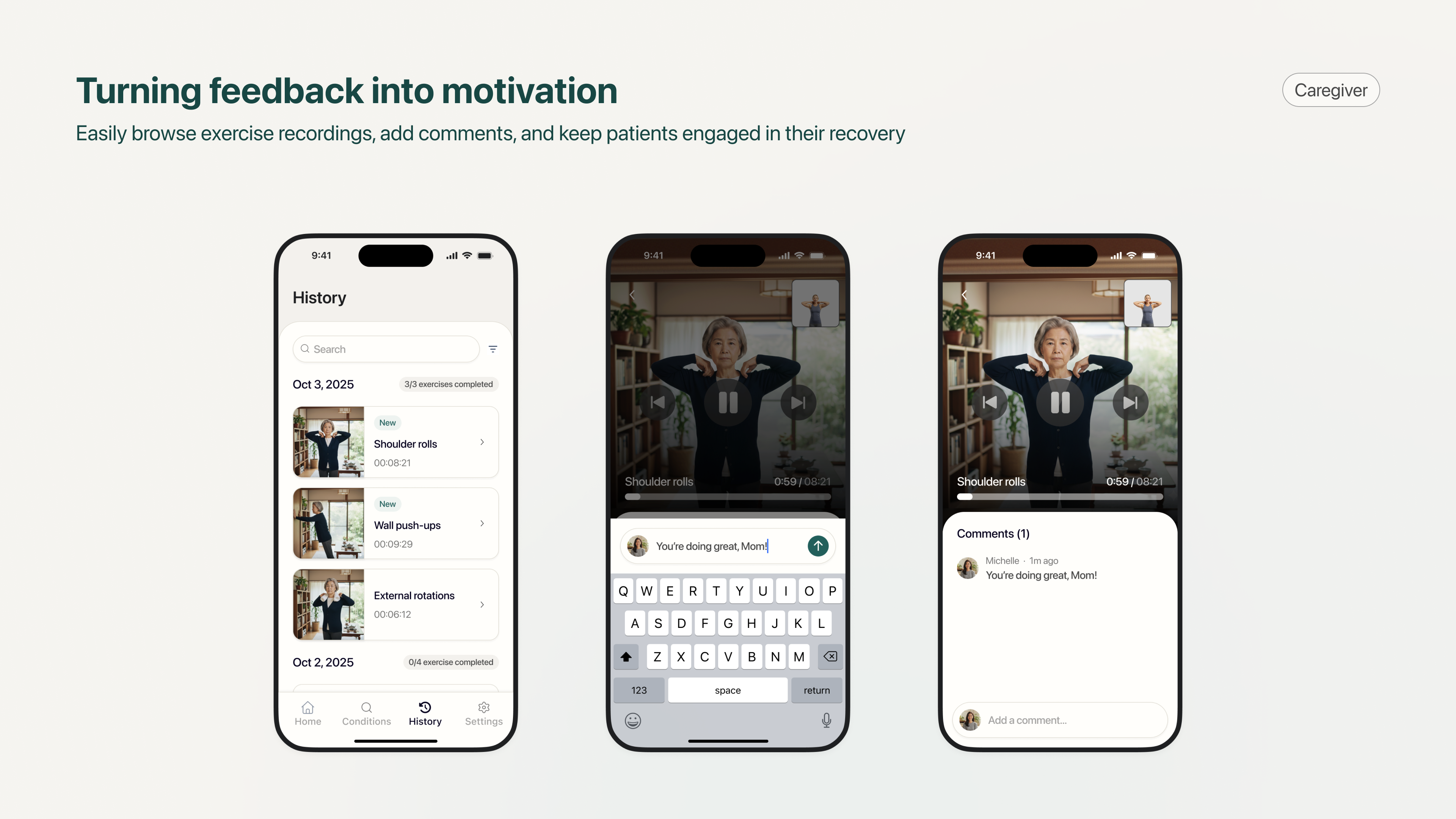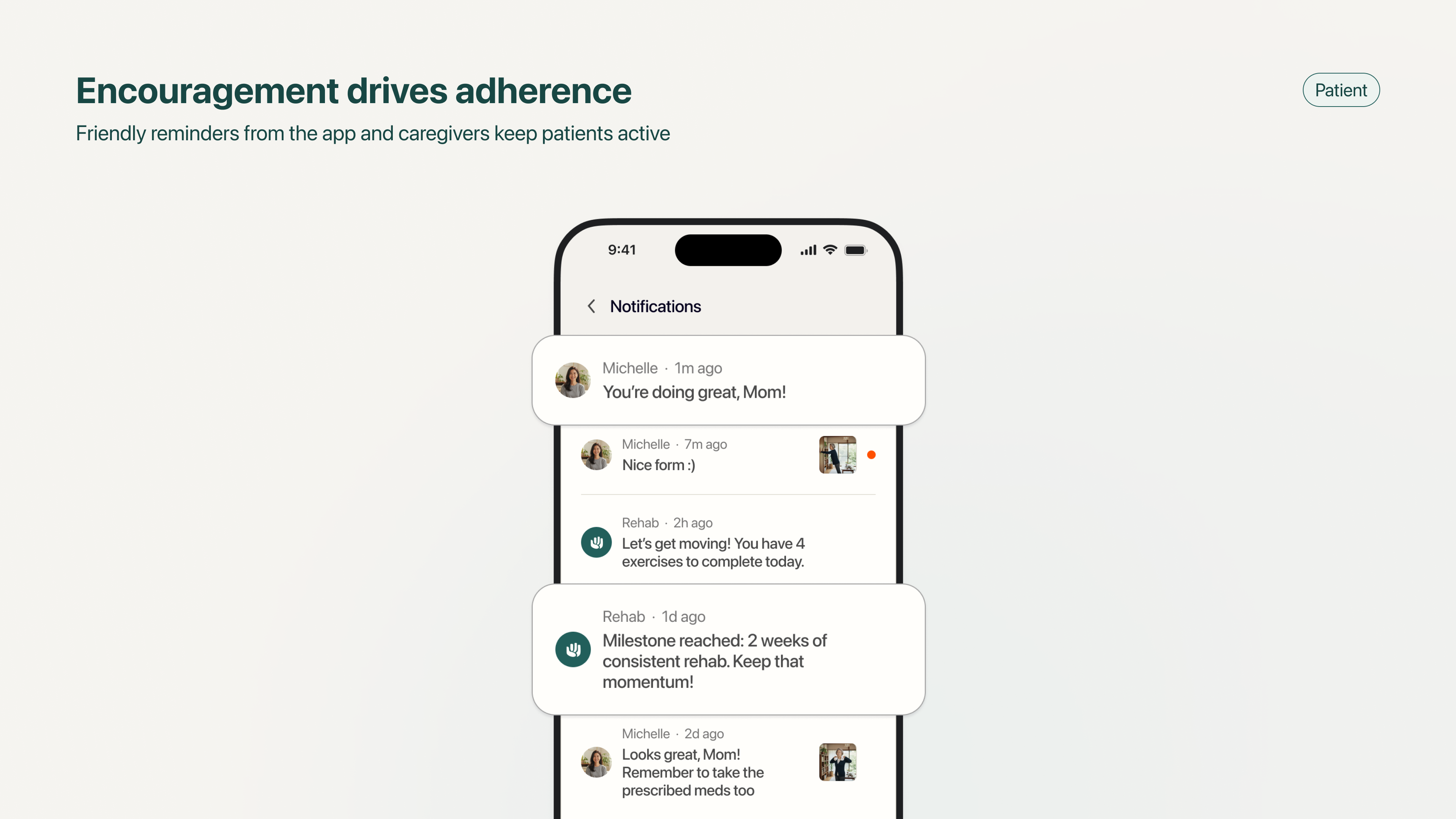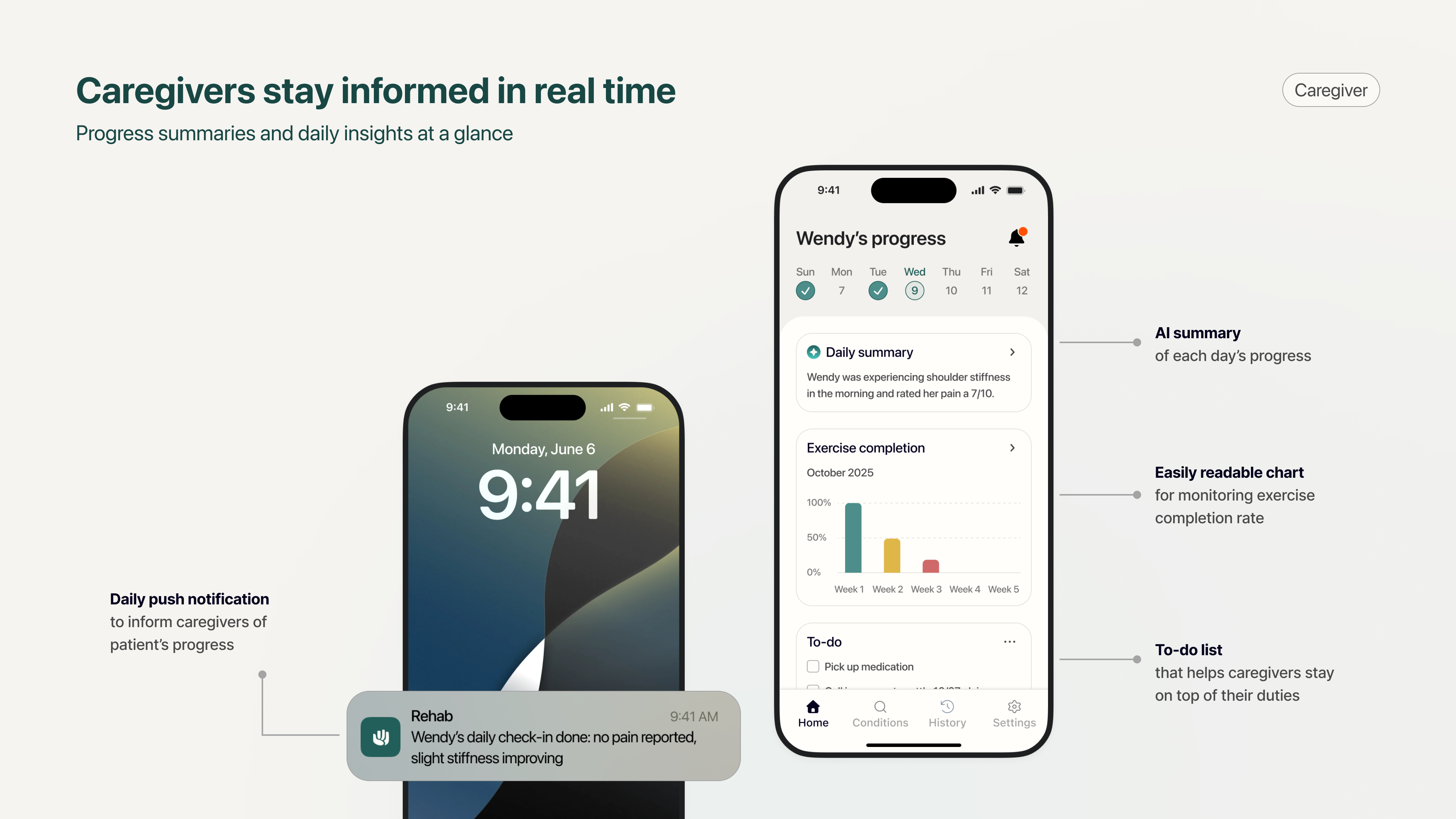 For caregivers, Rehab turns uncertainty into clarity. Daily summaries, progress charts, and simple visual insights replace guesswork with reassurance. It provides emotional relief – offering visibility instead of worry, connection instead of distance. Caregivers can follow recovery, share encouragement, and feel meaningfully involved, even from afar.
