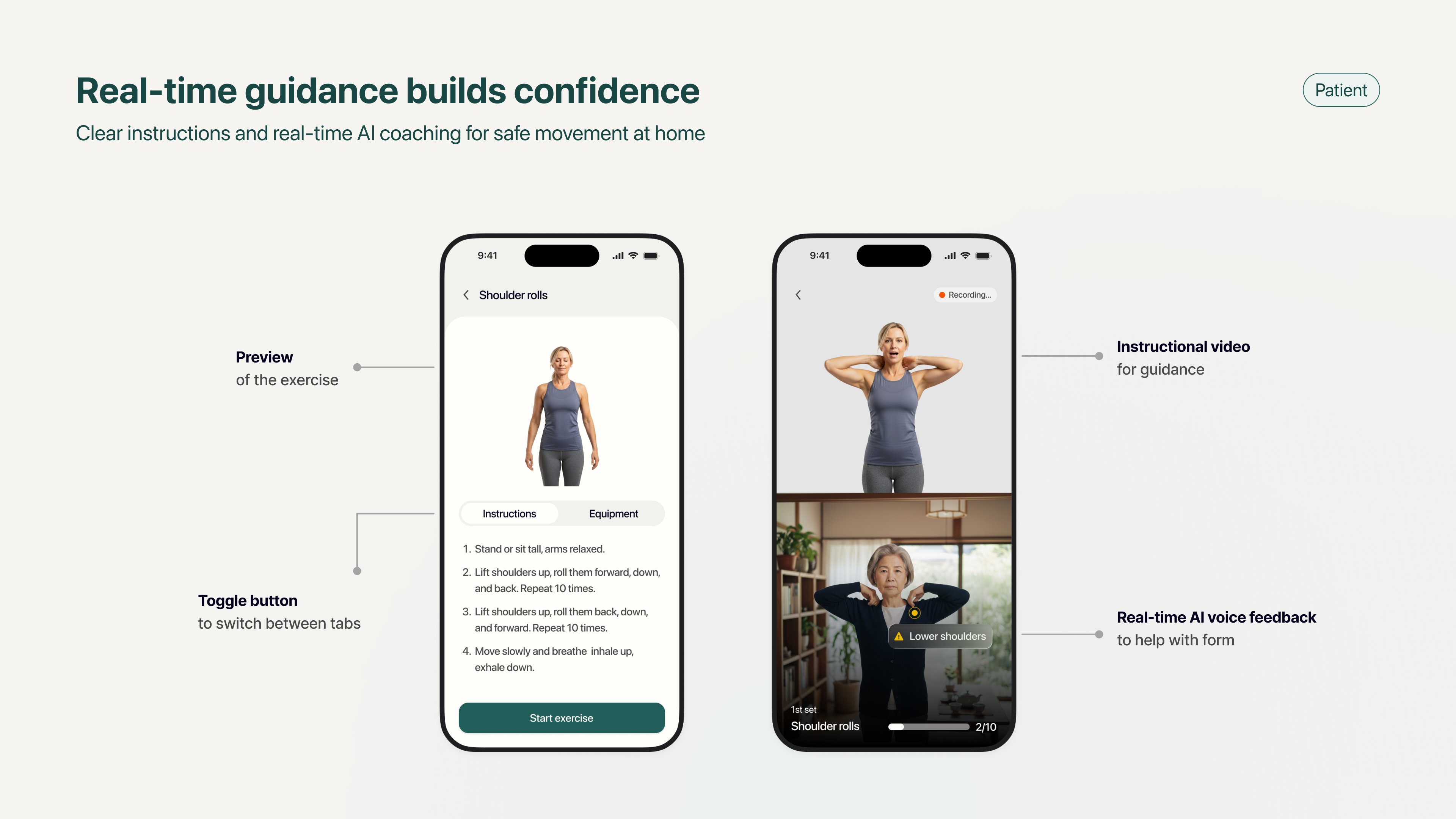 For older adults, Rehab acts as both a personal physical therapist and a supportive friend. Through natural voice check-ins and adaptive AI, it personalizes daily exercise plans that respond to each individual’s need and comfort levels. Real-time video feedback ensures safe movement and proper form, while gentle encouragement from both the system and loved ones helps build confidence and accountability over time.