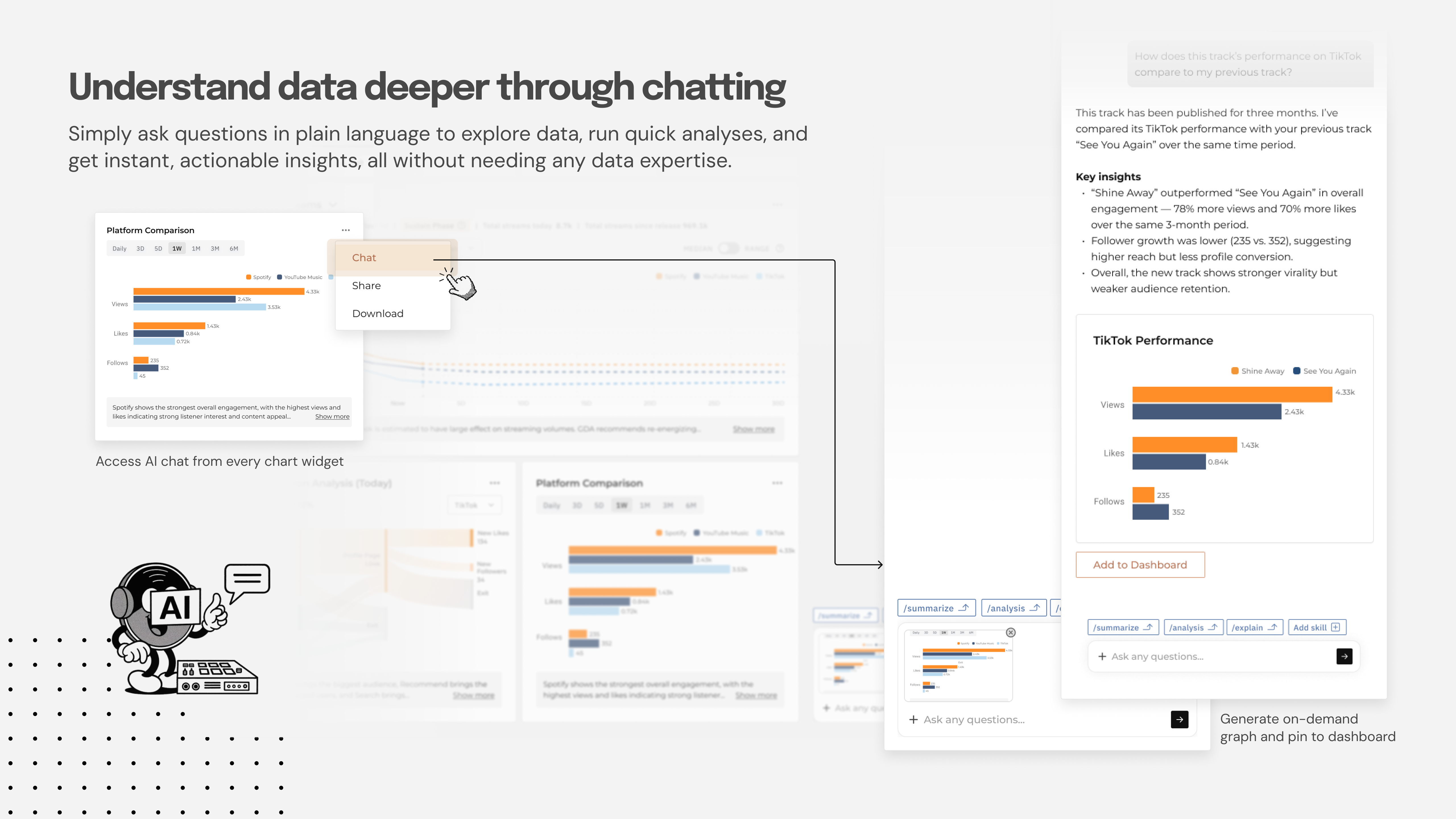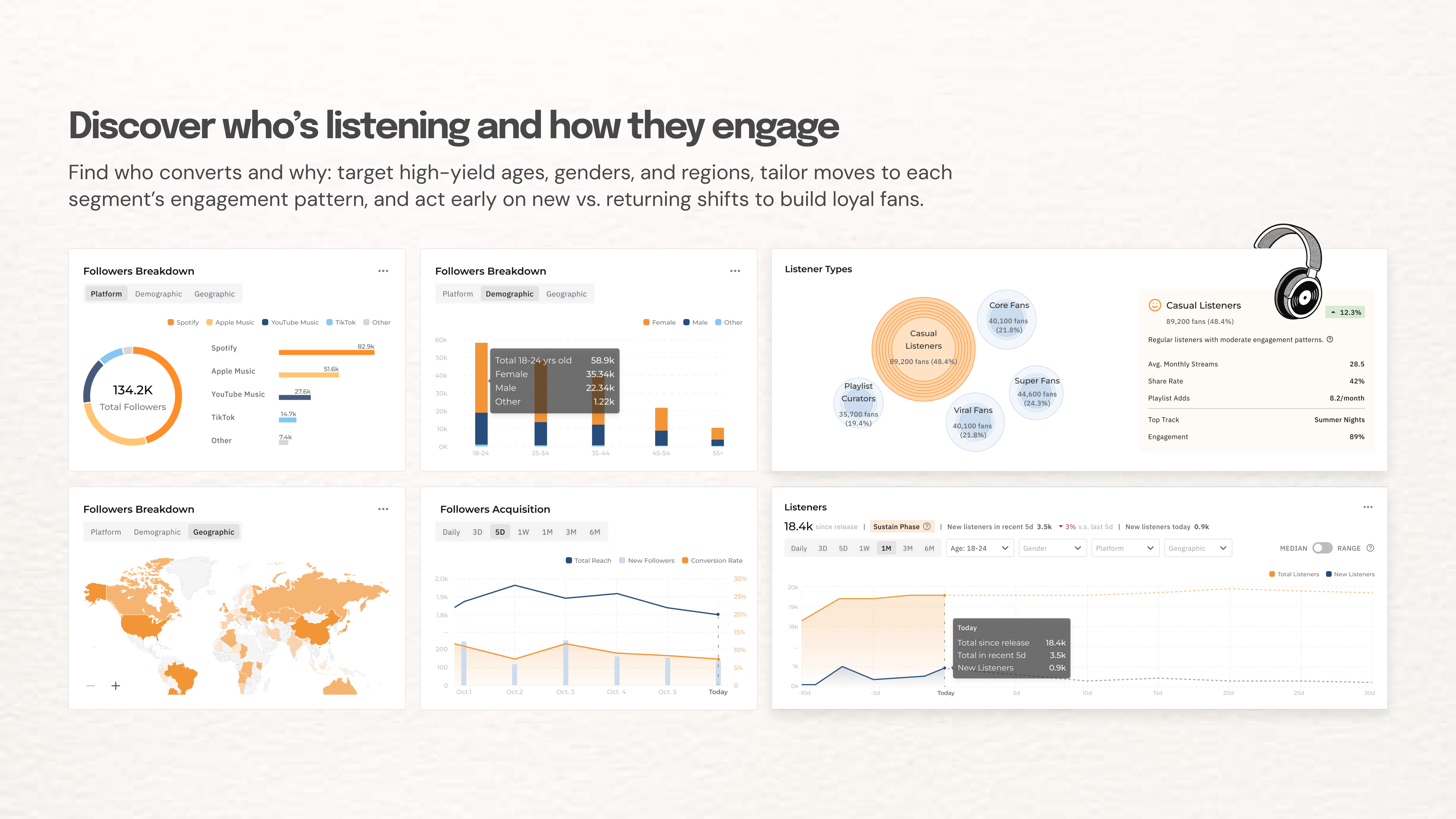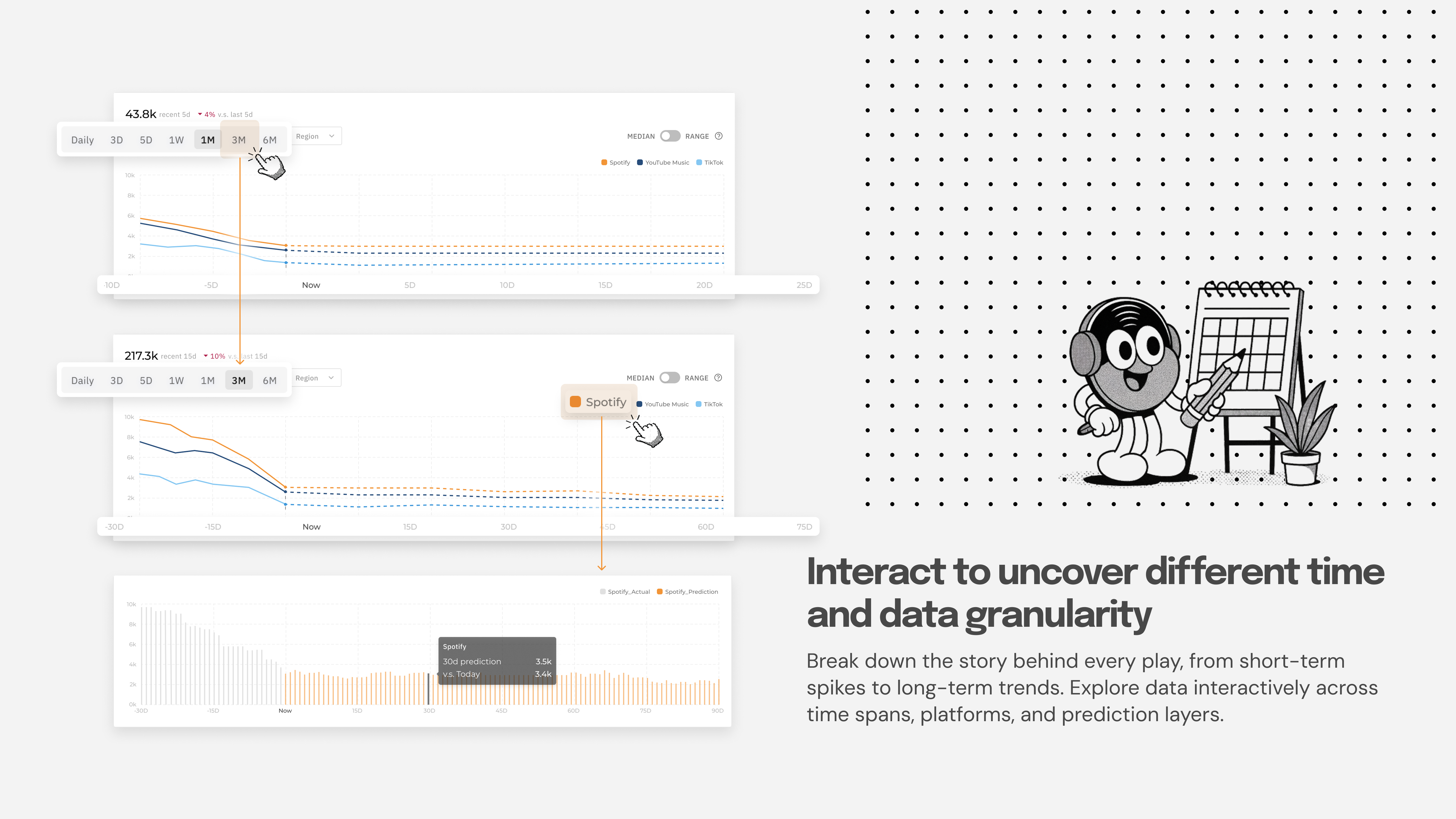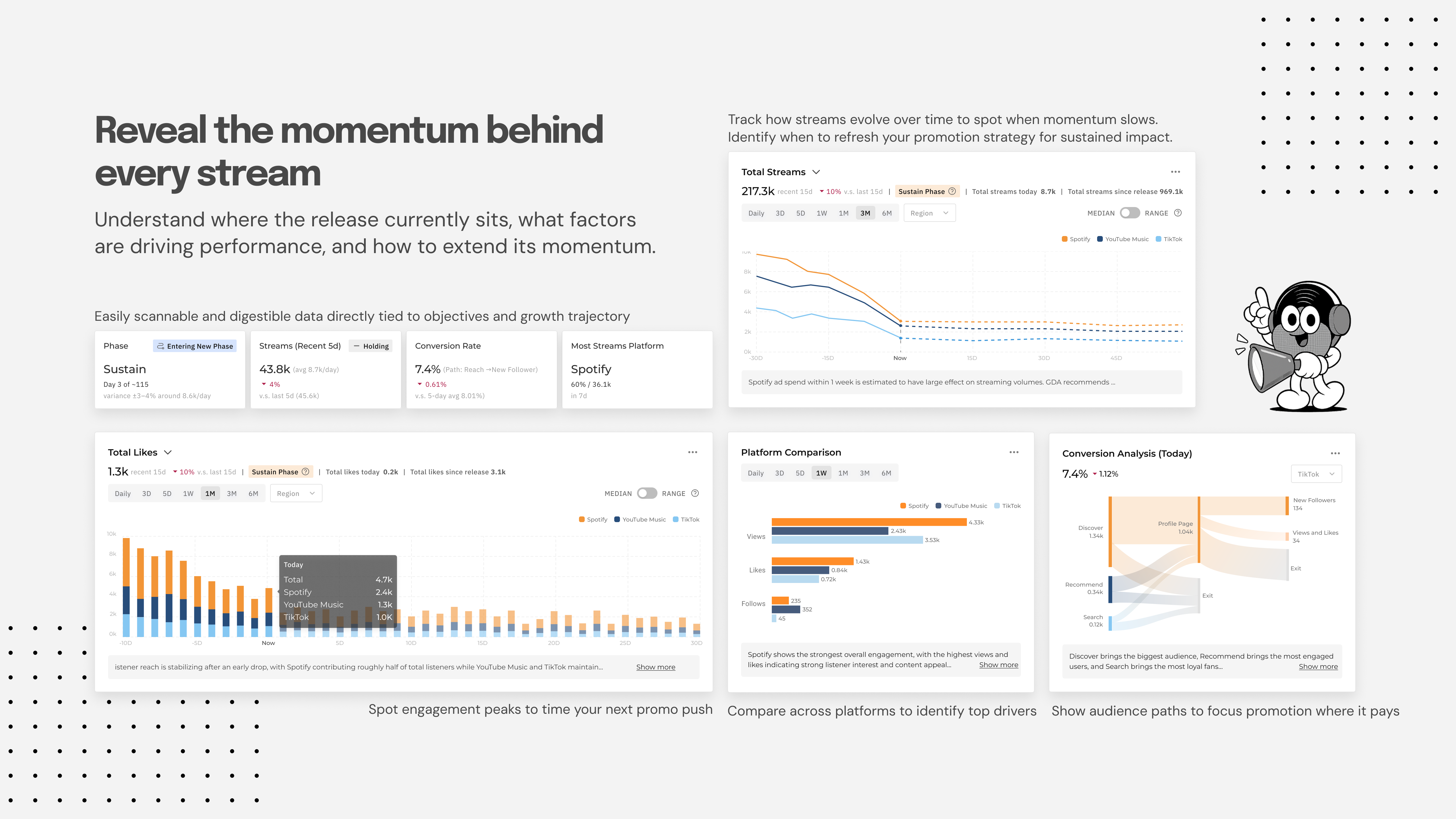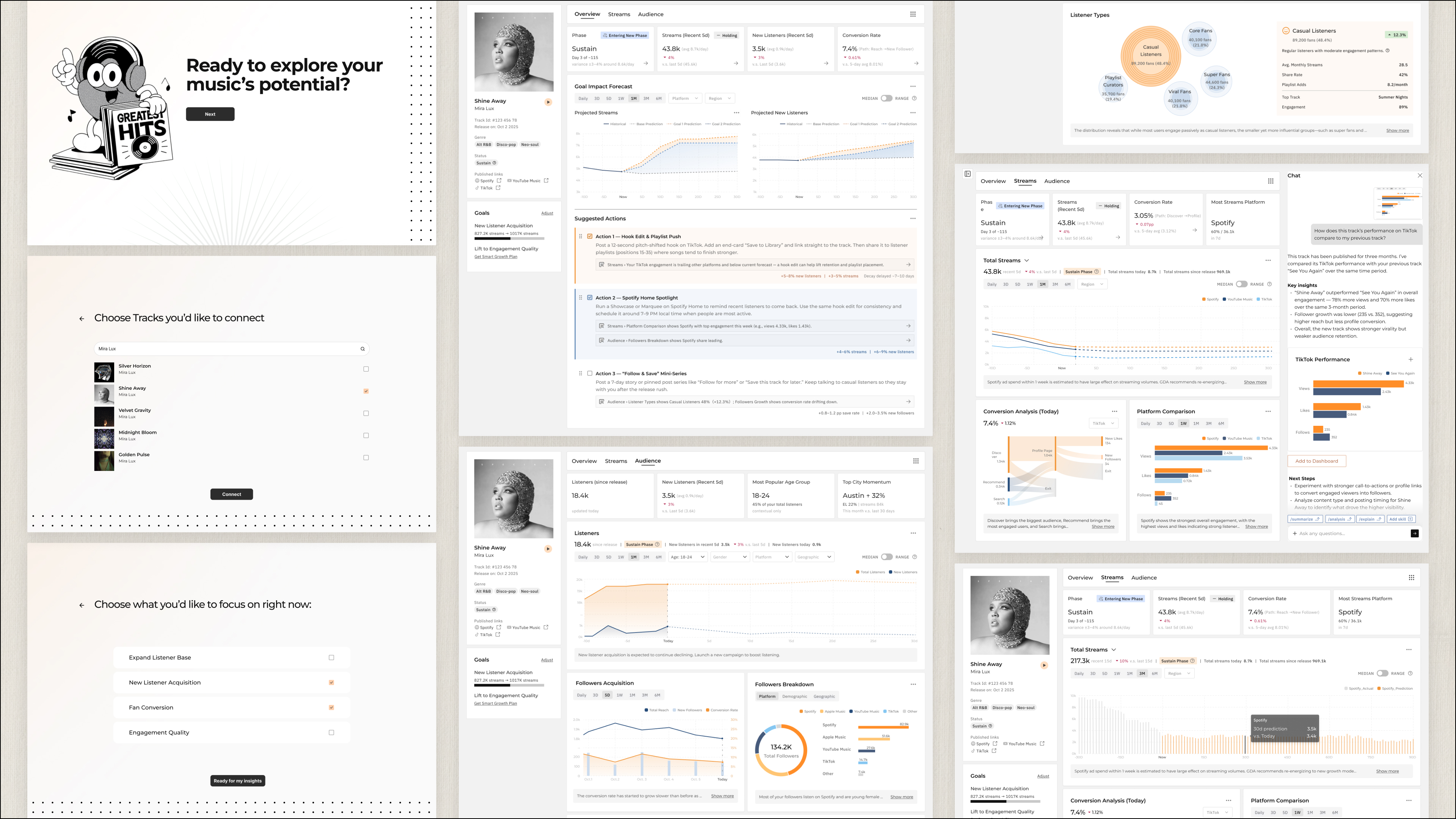 At the core of the experience is Gumbel’s AI-driven chat assistant, which contextualizes data through plain-language explanations. It highlights spikes, soft spots, and likely causes, helping artists understand not just the “what,” but the “why.” This conversational interface turns analytics into guidance, offering both clarity and confidence.