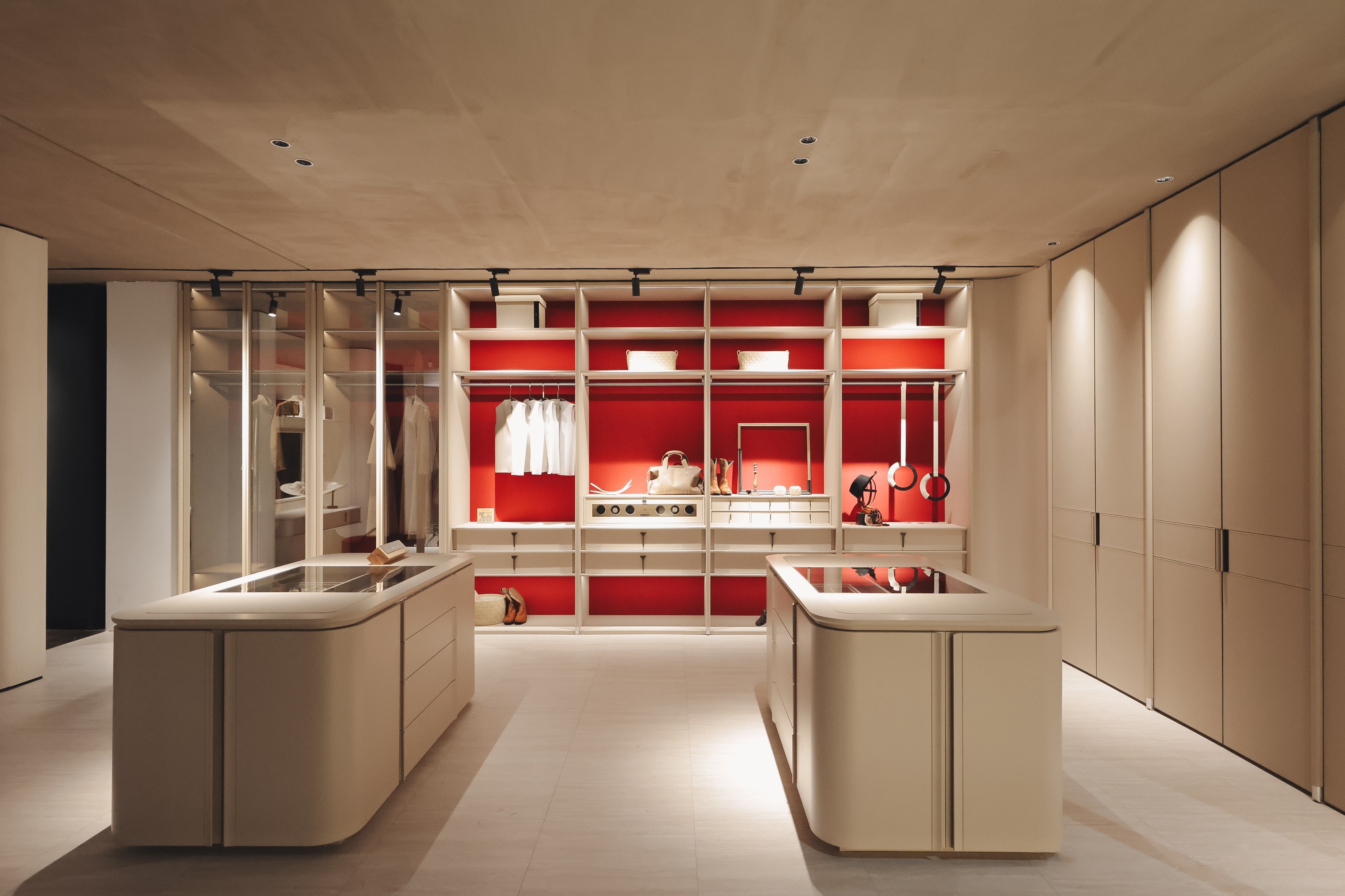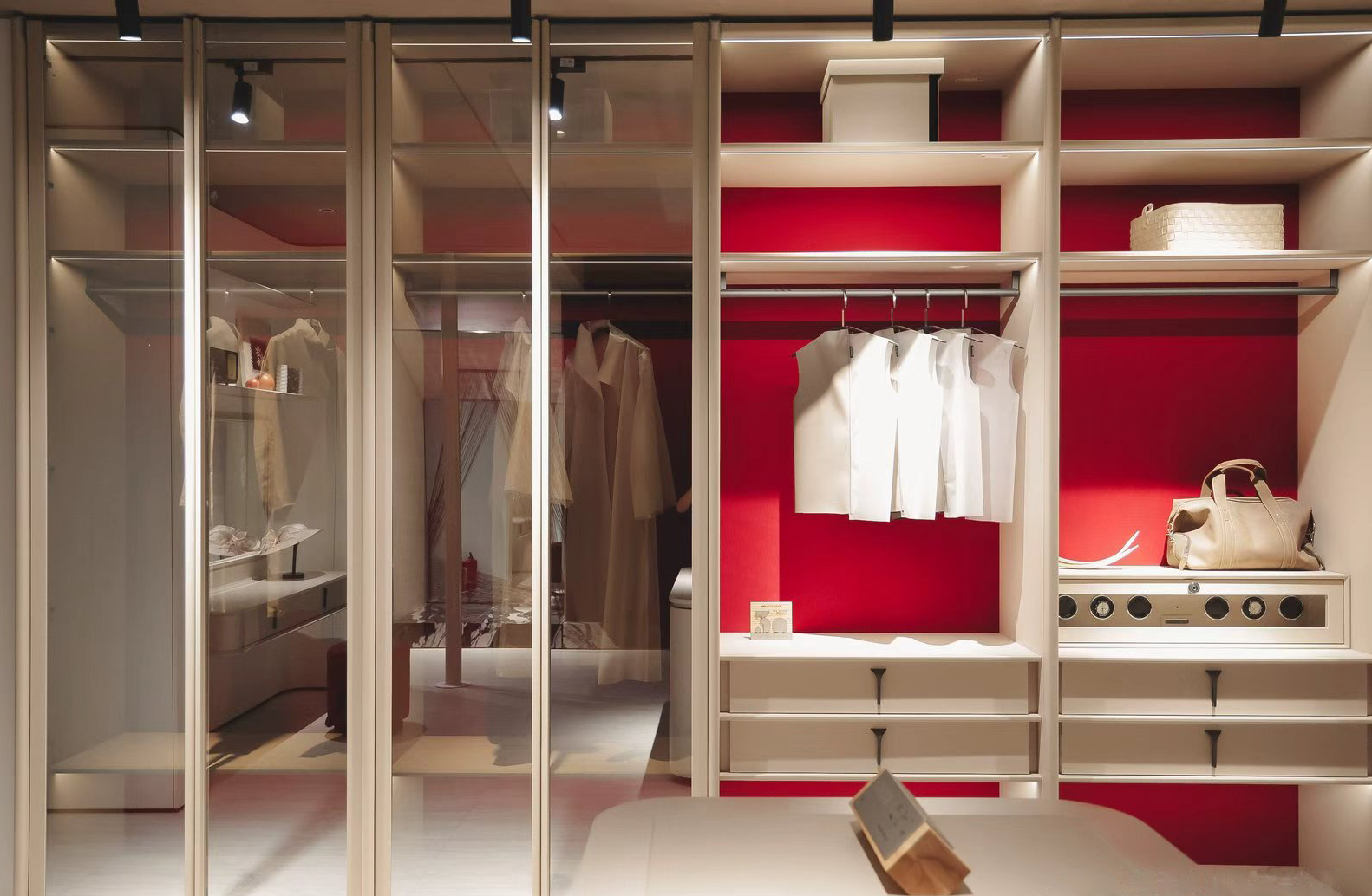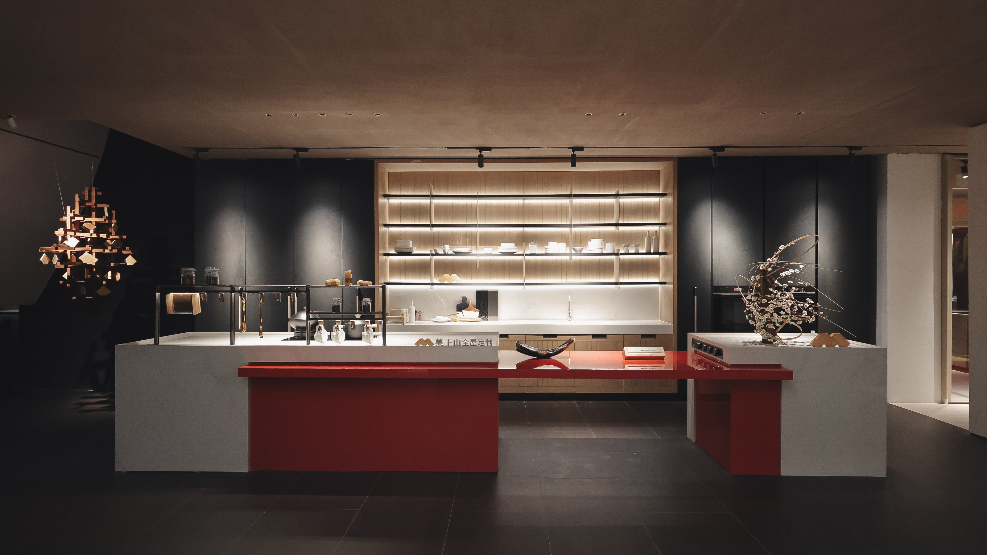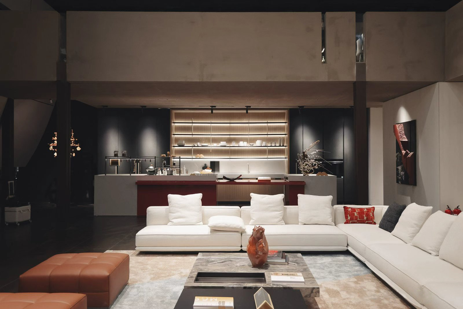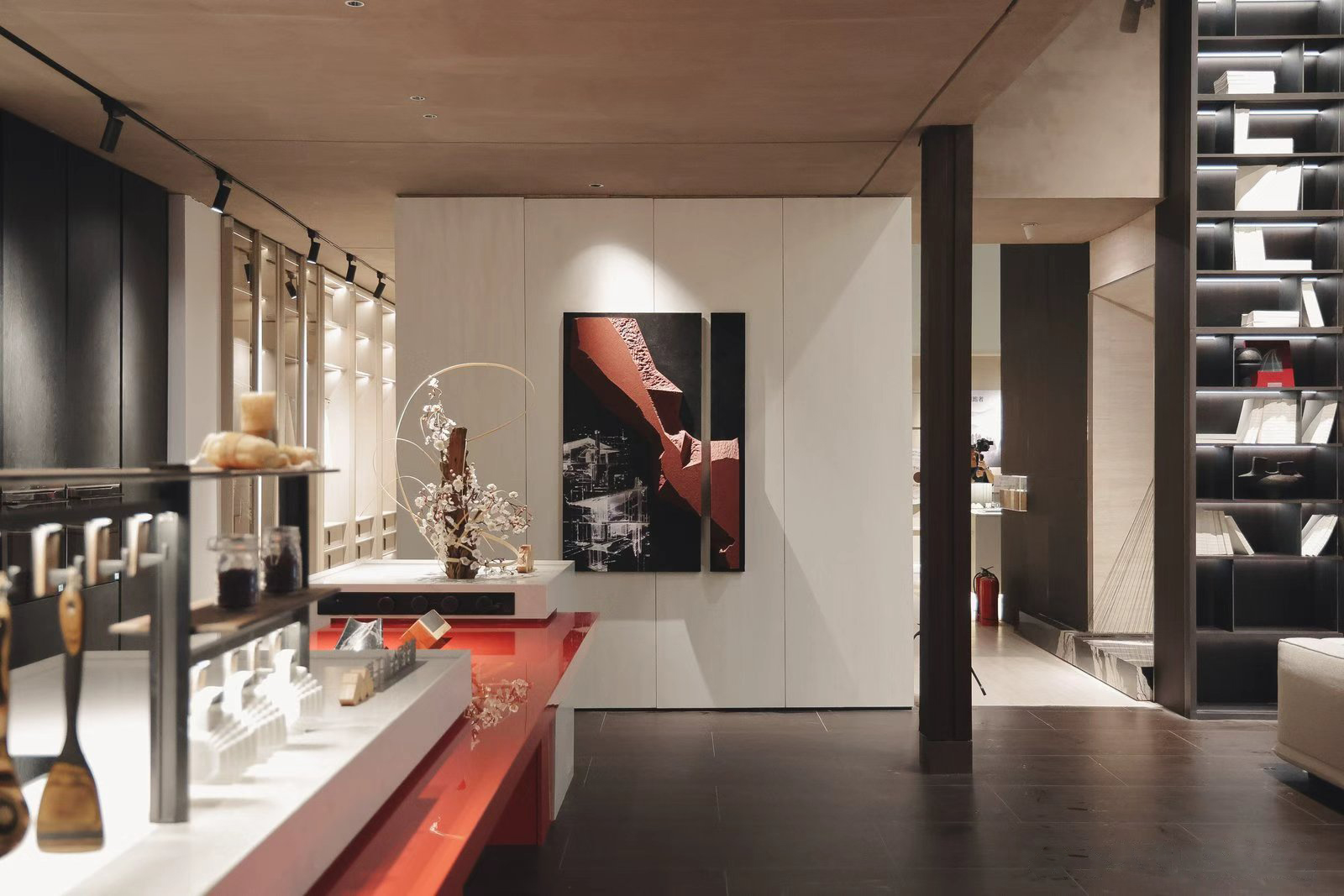 The Italian-style living and dining area uses warm wood as the base, accented with red thematic elements. It echoes the customized products and emphasizes a warm and cohesive atmosphere.