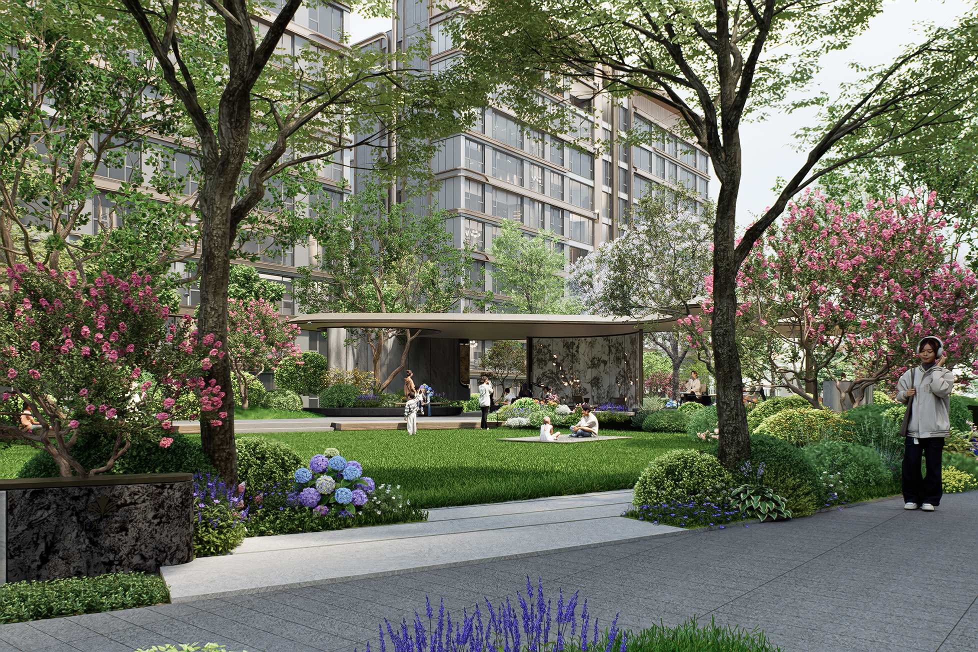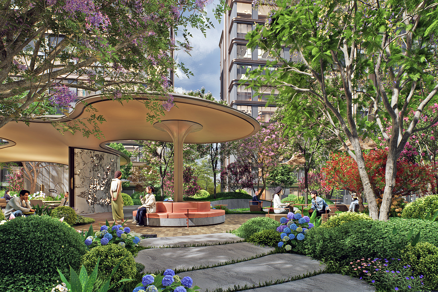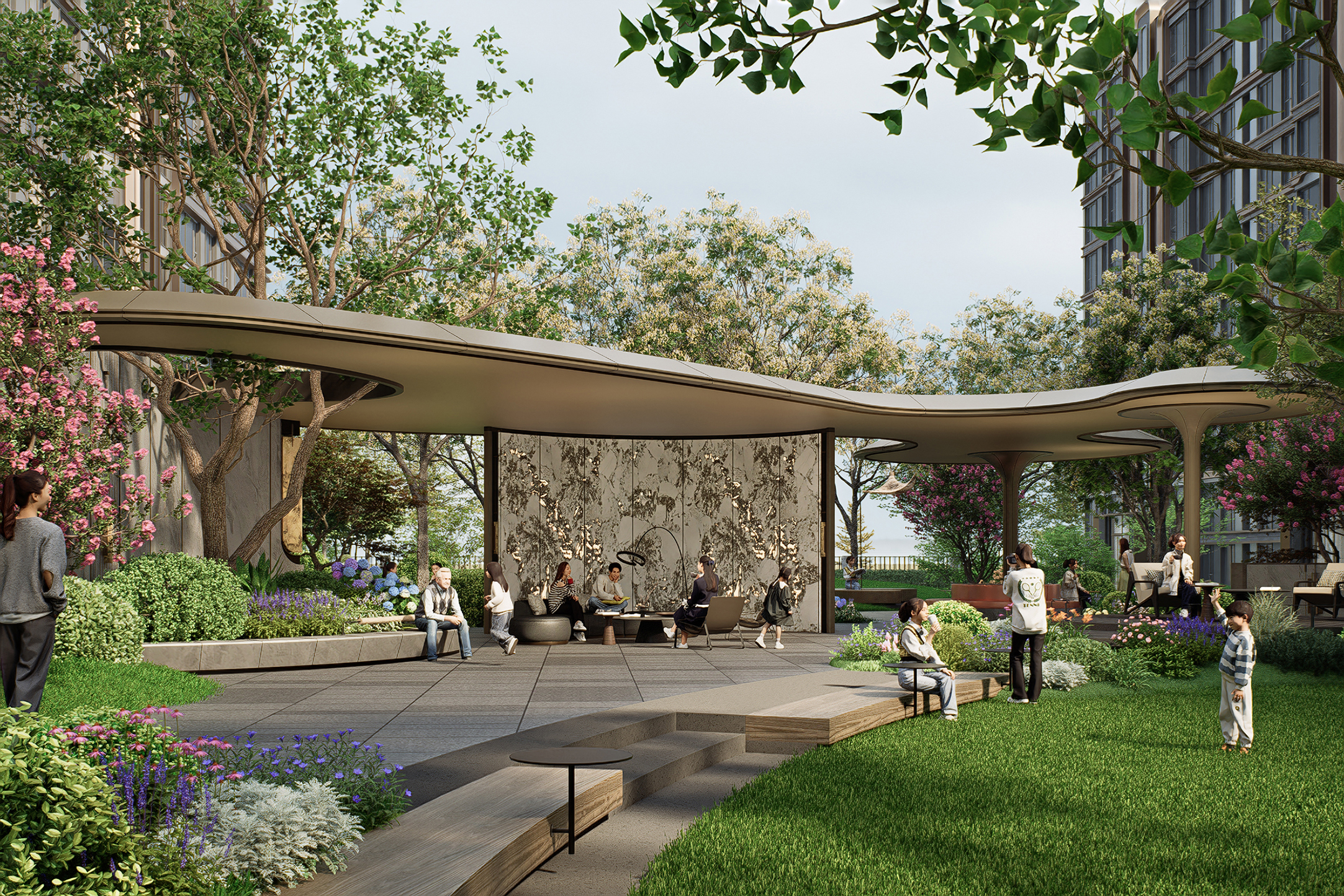 Guided by the concept of "enjoyment for three generations," the petal-shaped landscape lounge is composed of interconnected multi-functional corridors. Combining height differences, it forms an inter-residential garden surrounded by multi-layered greenery. The sunken lawn enhances immersion and spatial sense, with partial stone facades paired with champagne gold metal details to highlight artistic taste. The lounge and surrounding flower beds enclose comfortable booth spaces, realizing the vision of "letting landscape transform life and social interaction integrate with landscape." The project creates a woodland landscape with diverse vegetation and rich layers, using various plants to form a well-structured vertical landscape. Northern characteristic tree species are planted to blend natural beauty and reflect community quality. Greenery embodies seasonal themes, creating a multi-dimensional landscape community with changing scenery at every step and year-round appeal.