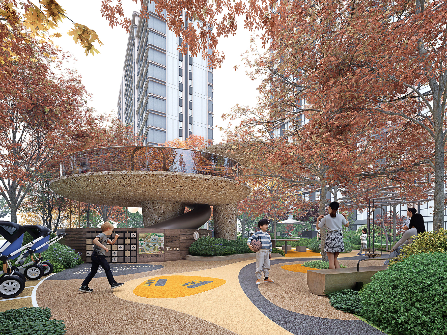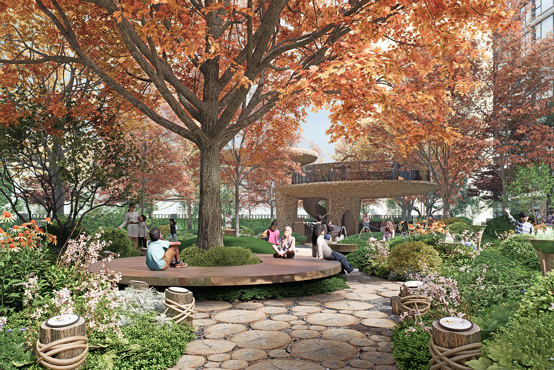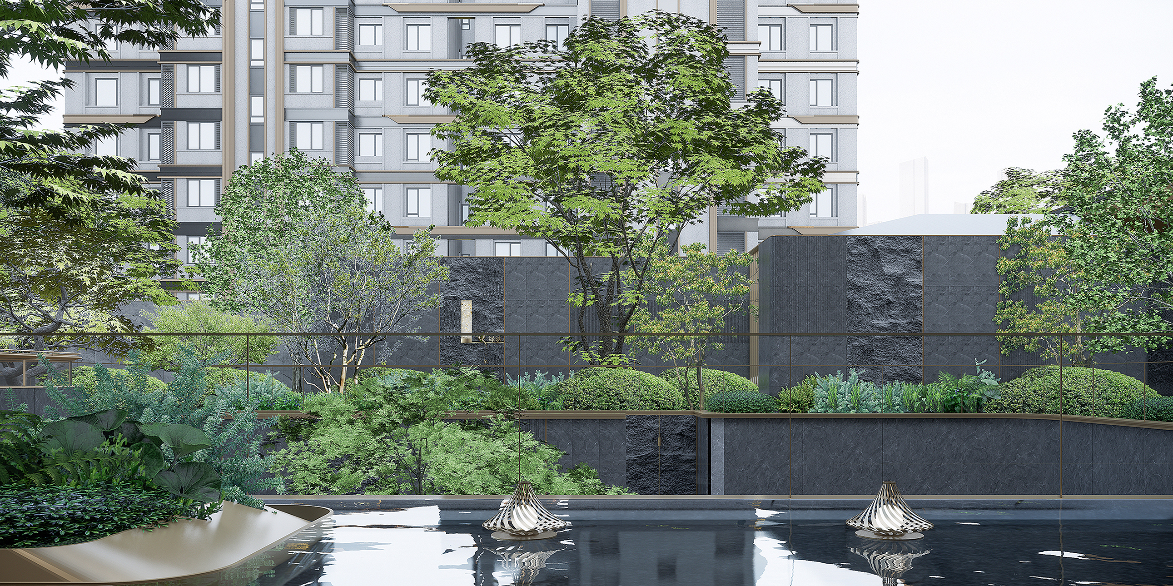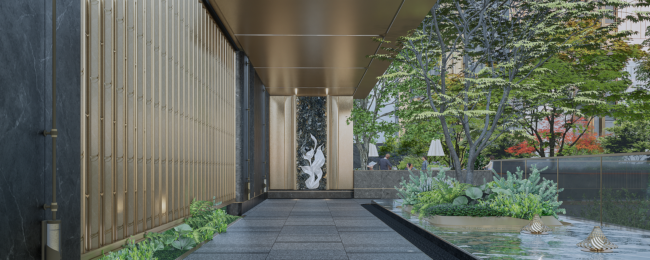 Guided by the concept of "enjoyment for three generations," the petal-shaped landscape lounge is composed of interconnected multi-functional corridors. Combining height differences, it forms an inter-residential garden surrounded by multi-layered greenery. The sunken lawn enhances immersion and spatial sense, with partial stone facades paired with champagne gold metal details to highlight artistic taste. The lounge and surrounding flower beds enclose comfortable booth spaces, realizing the vision of "letting landscape transform life and social interaction integrate with landscape." The project creates a woodland landscape with diverse vegetation and rich layers, using various plants to form a well-structured vertical landscape. Northern characteristic tree species are planted to blend natural beauty and reflect community quality. Greenery embodies seasonal themes, creating a multi-dimensional landscape community with changing scenery at every step and year-round appeal.