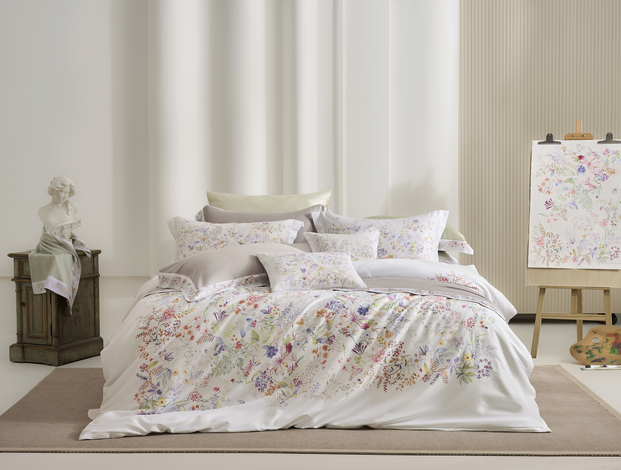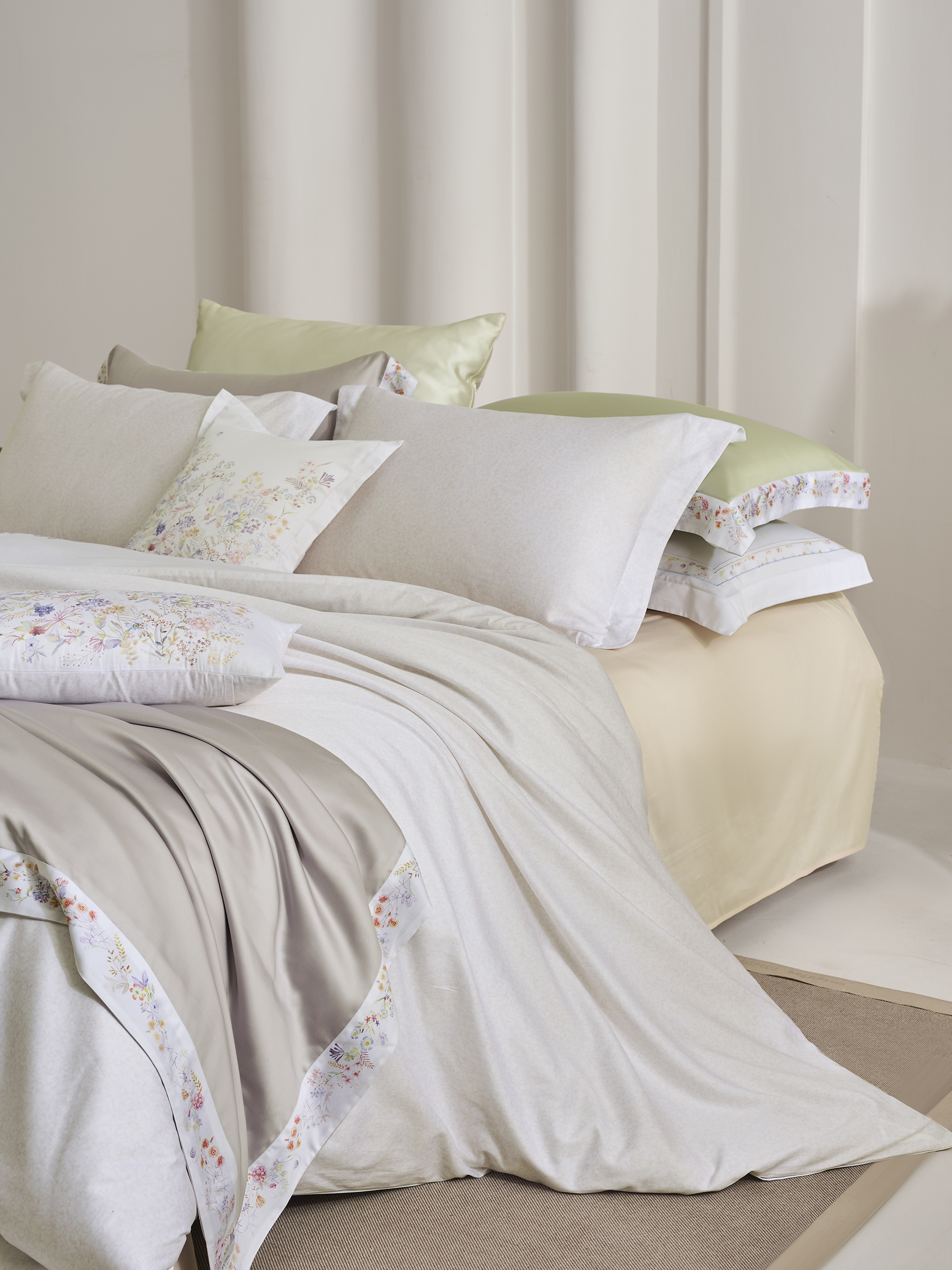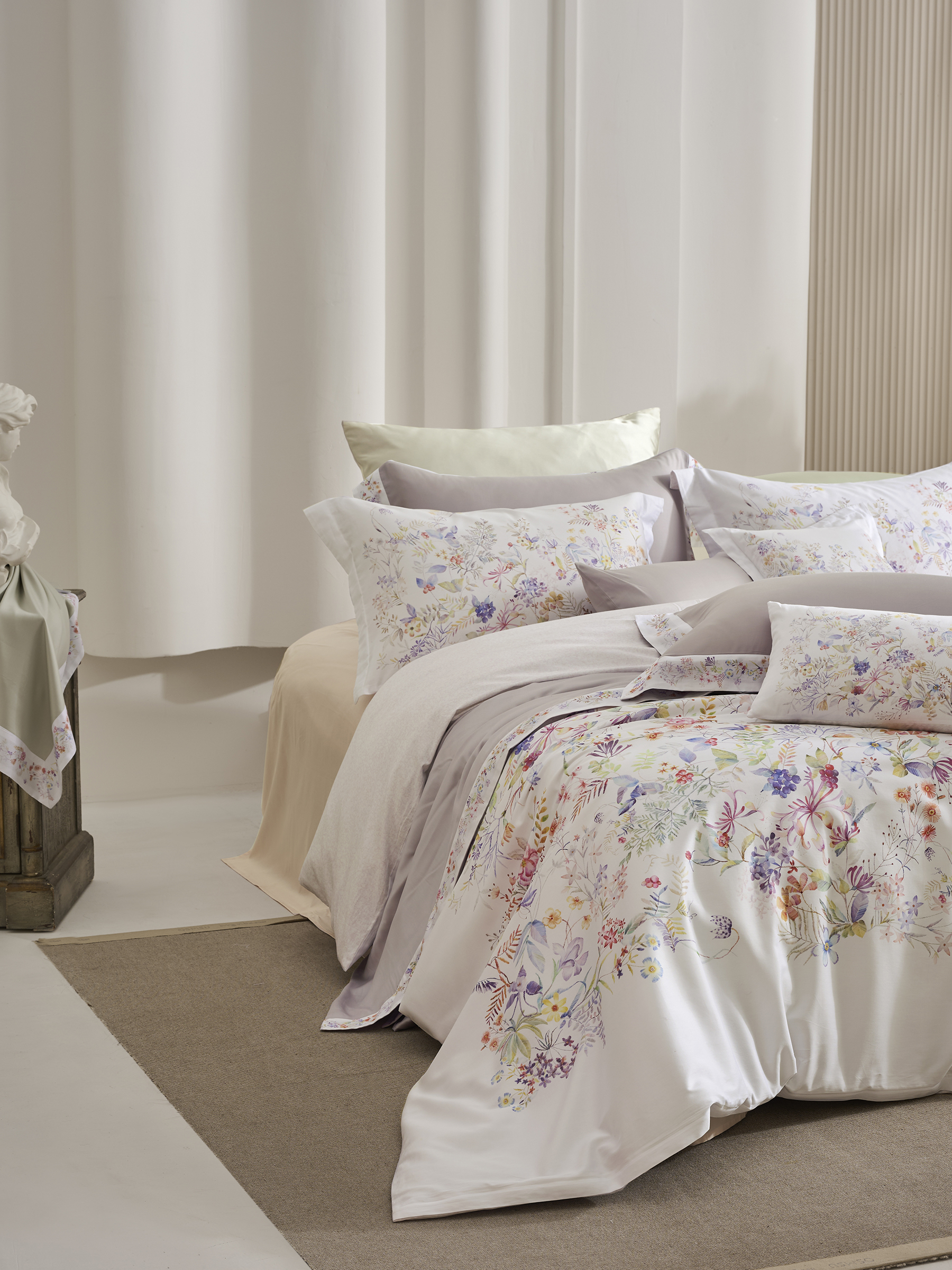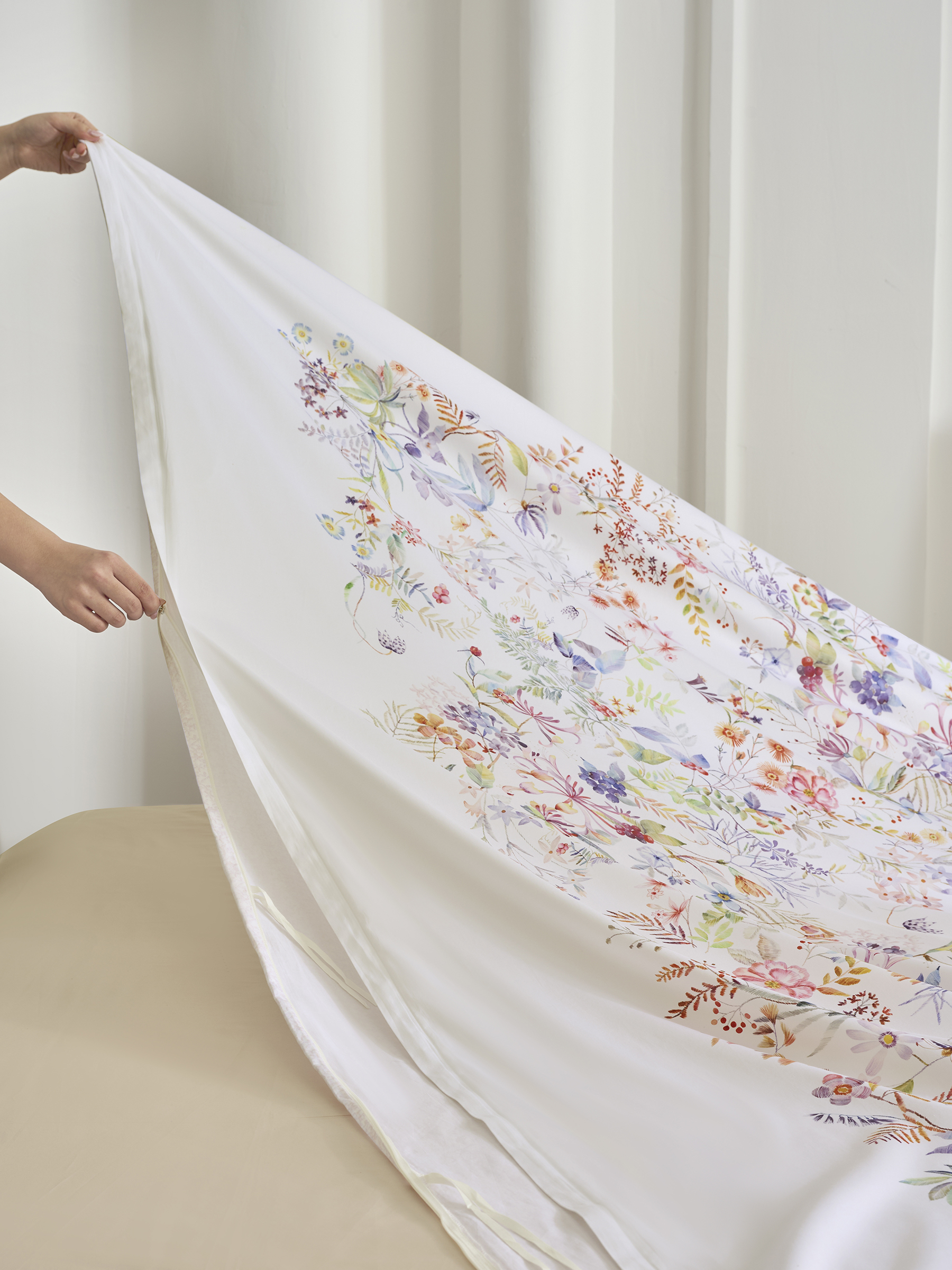 The fabric is made from carefully selected 100% premium cotton and woven using innovative techniques to achieve a distinctive water-like satin texture. This delicate surface reflects light with a soft sheen reminiscent of flower petals, while offering a silky, breathable touch that enhances comfort throughout the night. The textile structure is engineered to maintain lasting softness and regulate temperature, ensuring an enveloping yet lightweight feel suitable for year-round use.