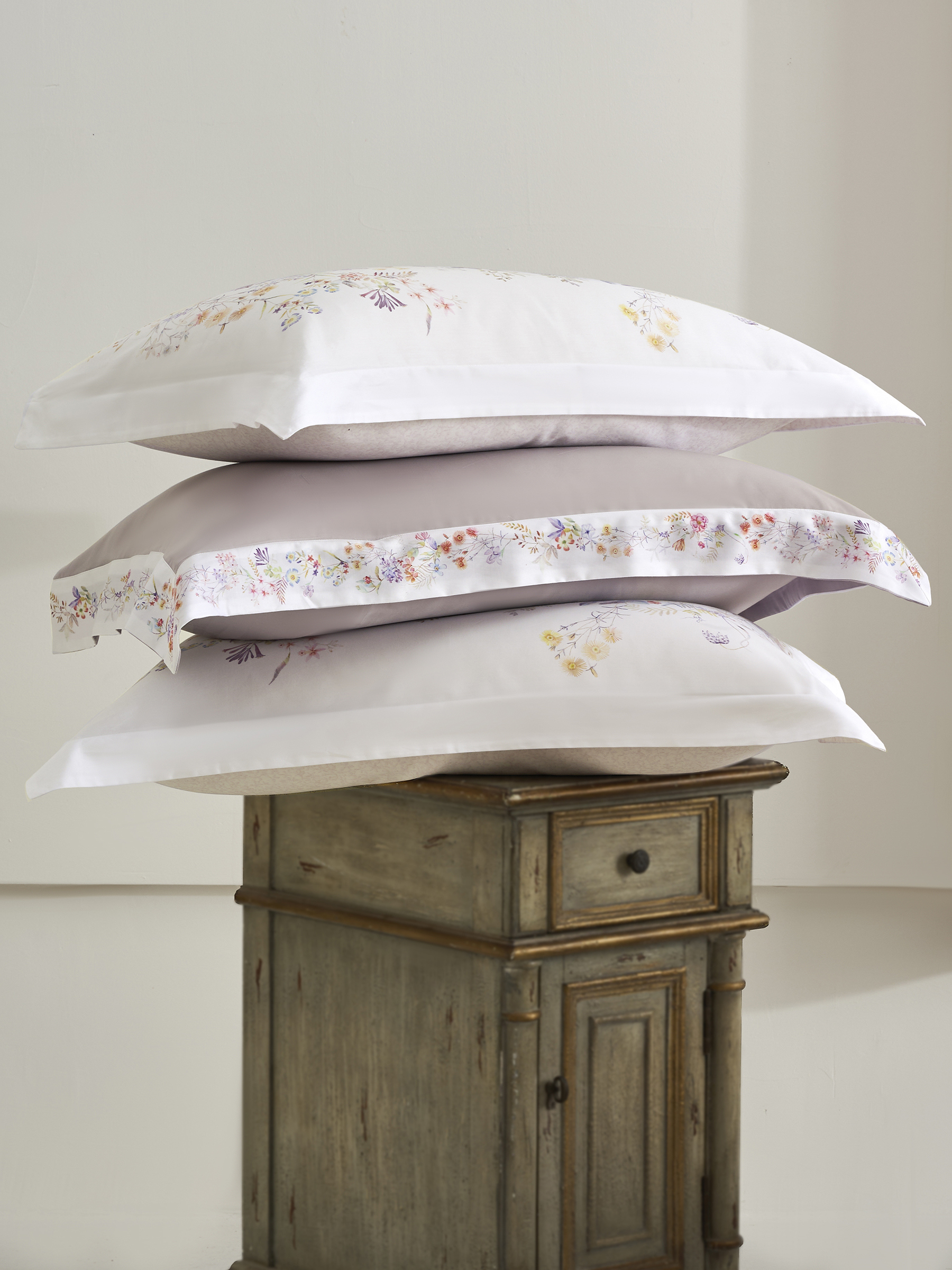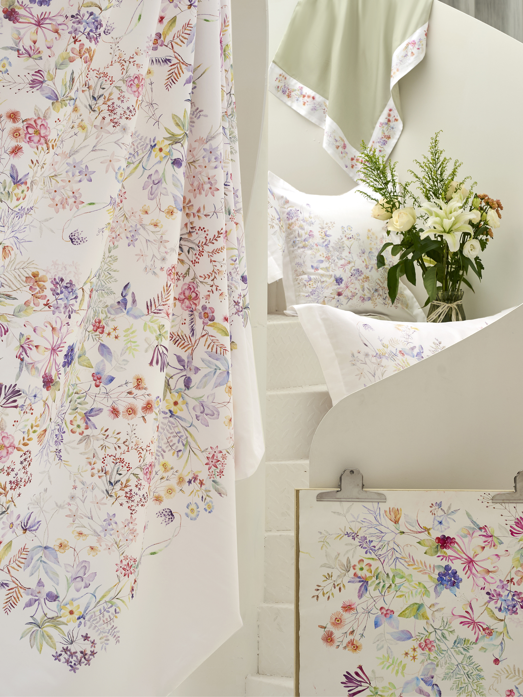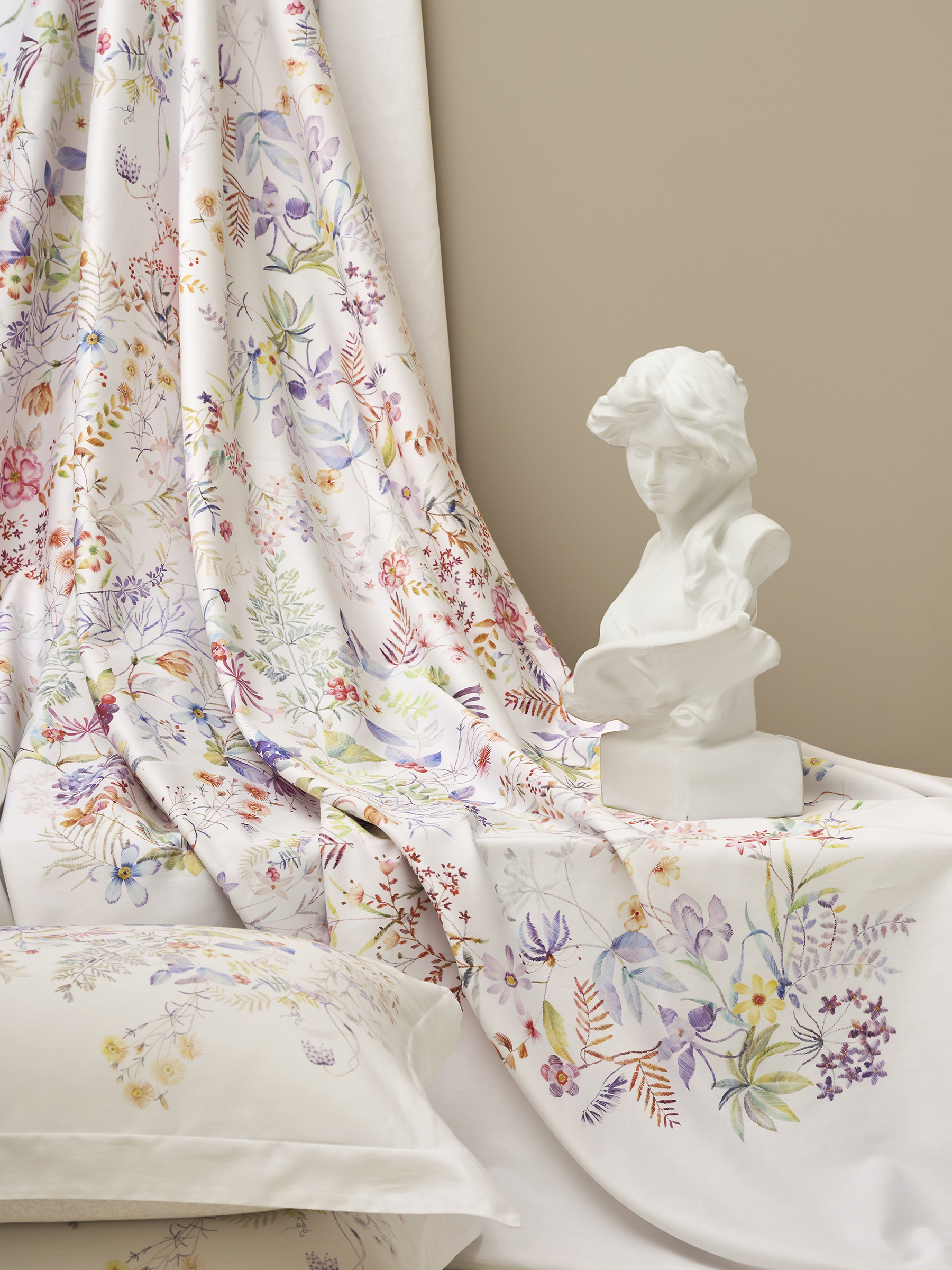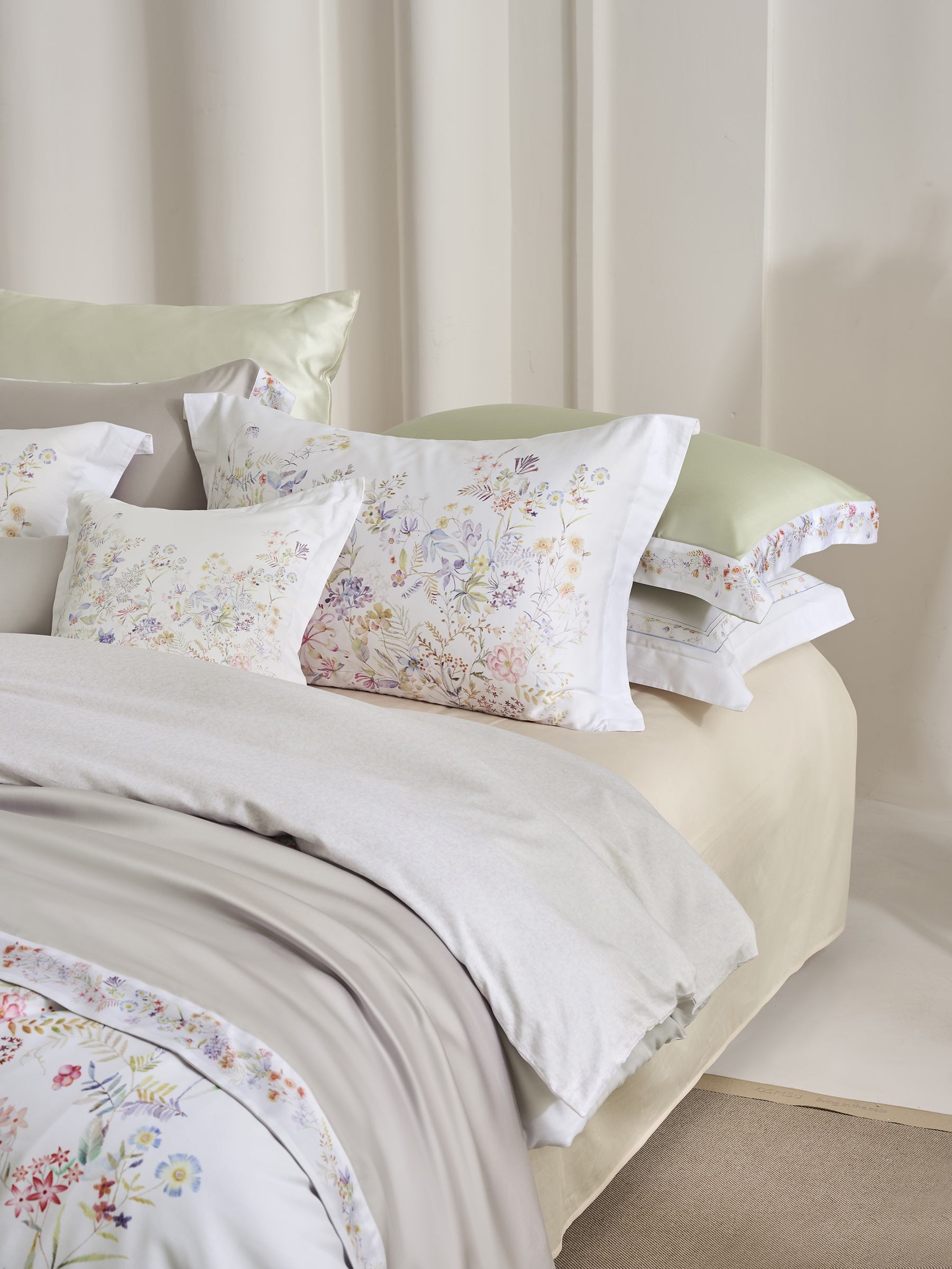 The fabric is made from carefully selected 100% premium cotton and woven using innovative techniques to achieve a distinctive water-like satin texture. This delicate surface reflects light with a soft sheen reminiscent of flower petals, while offering a silky, breathable touch that enhances comfort throughout the night. The textile structure is engineered to maintain lasting softness and regulate temperature, ensuring an enveloping yet lightweight feel suitable for year-round use.