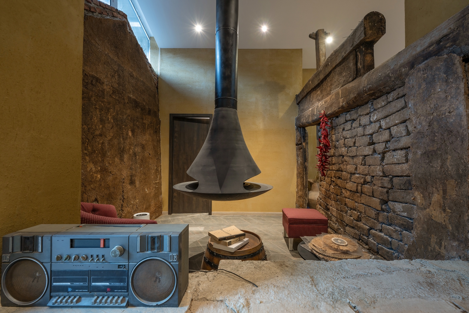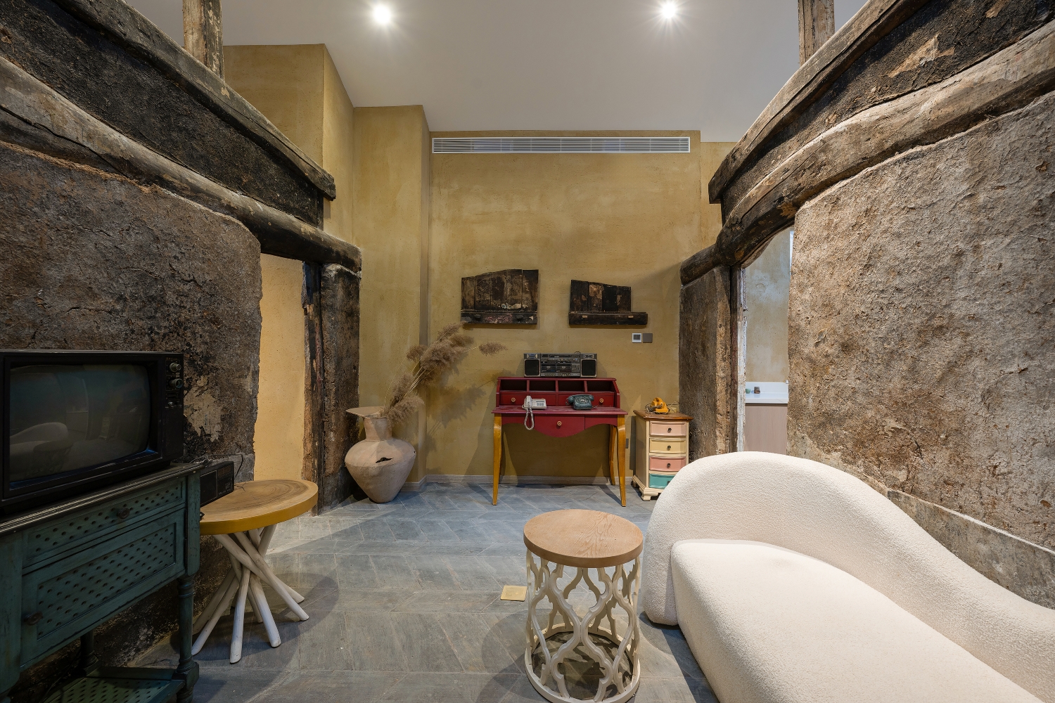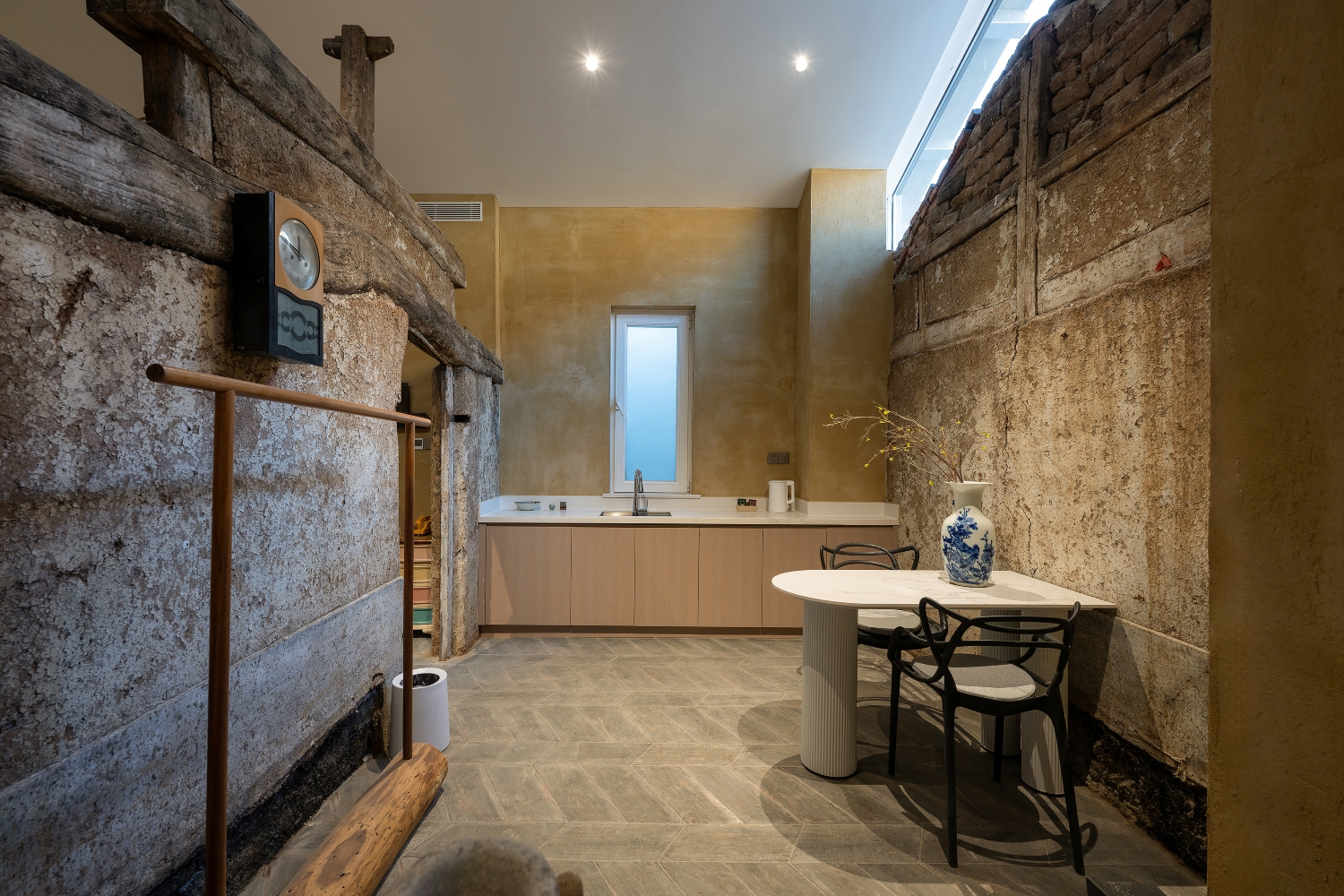 In the renovation, I adopted a "wrapping" design: retaining the origi-nal texture of the old walls, the new walls are made of straw and yel-low mud to continue the texture; the floor is paved with handcrafted vintage wood-patterned tiles, and the roof is reconstructed with mod-ern materials; the low door is dismantled and reused as wall decora-tion, and a real fireplaces injects warmth and vitality. The indoor modern space forms a strong echo with the mottled old walls, and the backyard is adjacent to the Ming Dynasty Great Wall, allowing nature, humanity and history to blend deeply here.